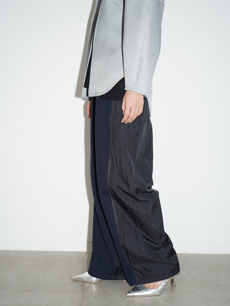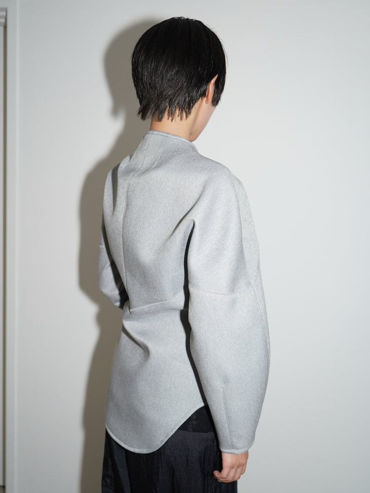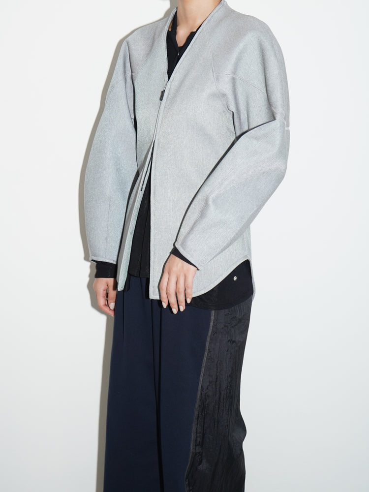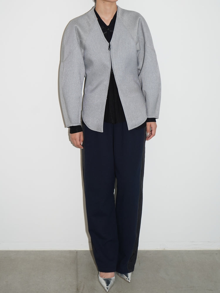 モデル:169cm ITEMS DOUBLE KNIT V-NECK JACKET ¥33,000 SIZE: FREE COLOR: GRAY NEW NYLON TAFFETA SWEAT PANTS ¥23,100 SIZE: FREE COLOR: BLACK ALL SNAP