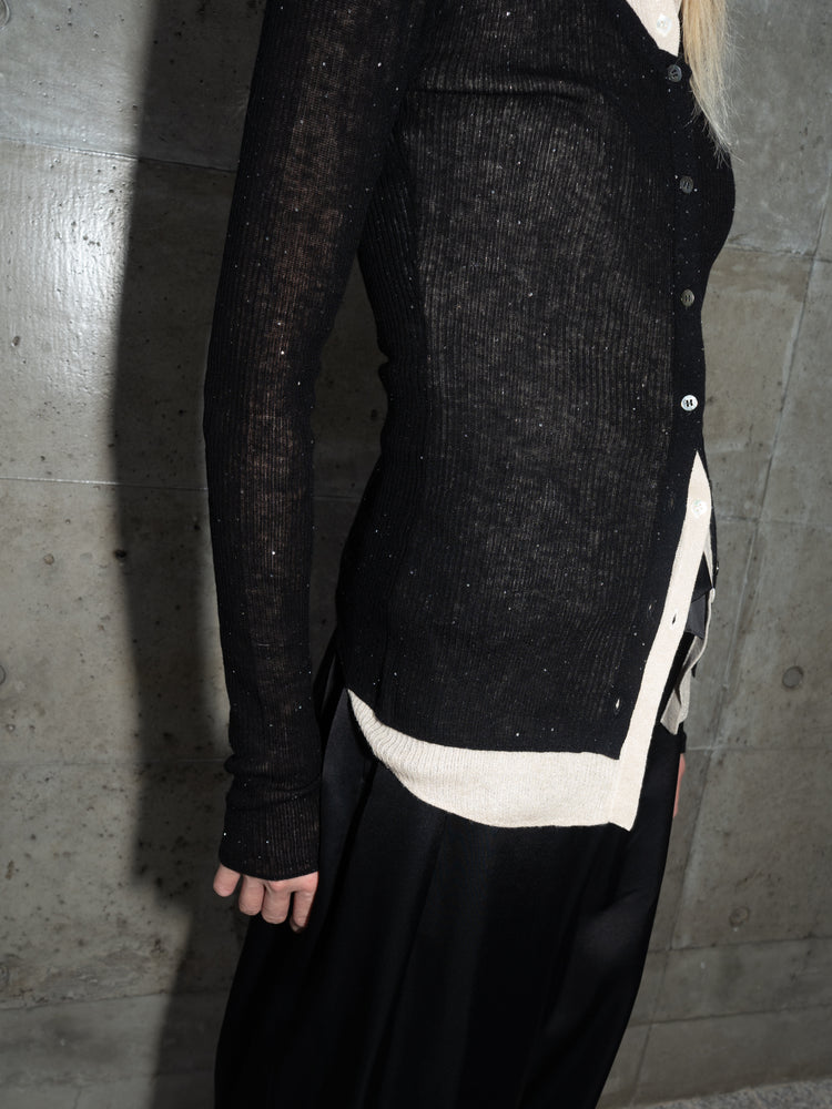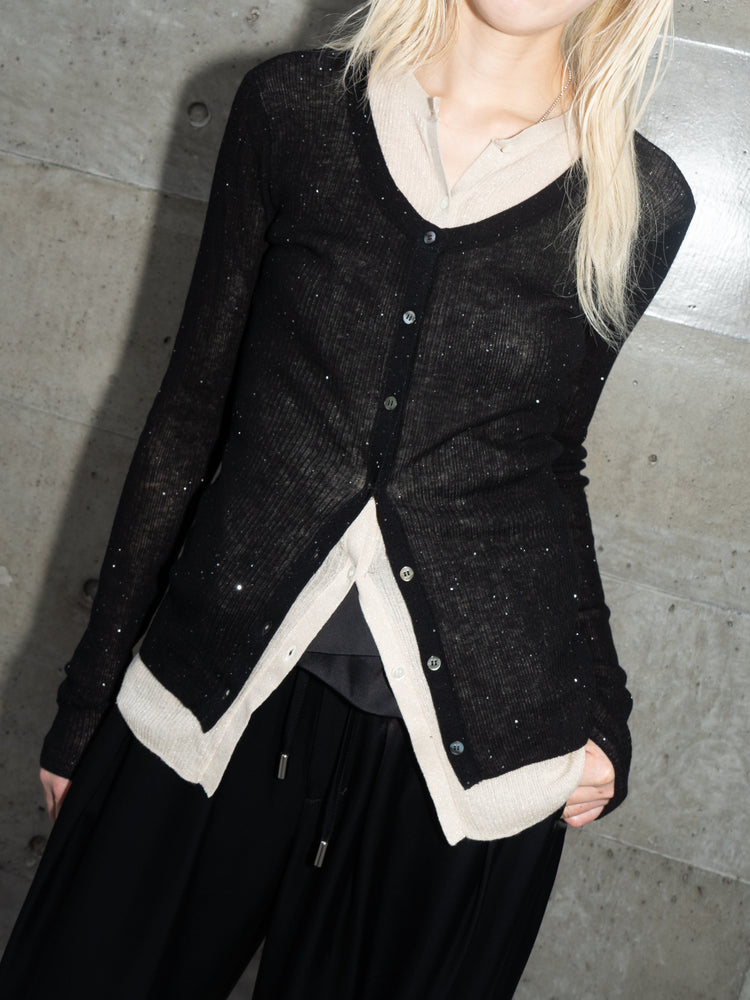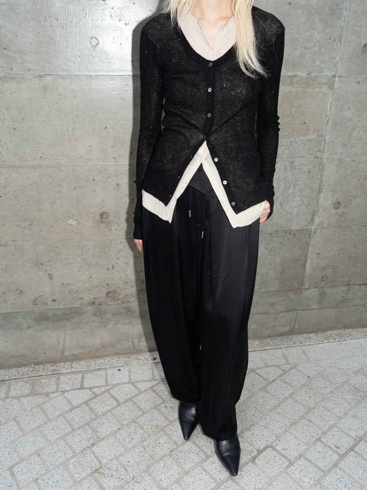 モデル:161cm ITEMS SPARKLE SHEER KNIT CARDIGAN ¥24,200 SIZE: FREE COLOR: BLACK PEPLUM SATIN EASY PANTS ¥29,700 SIZE: 02 COLOR: BLACK ALL SNAP