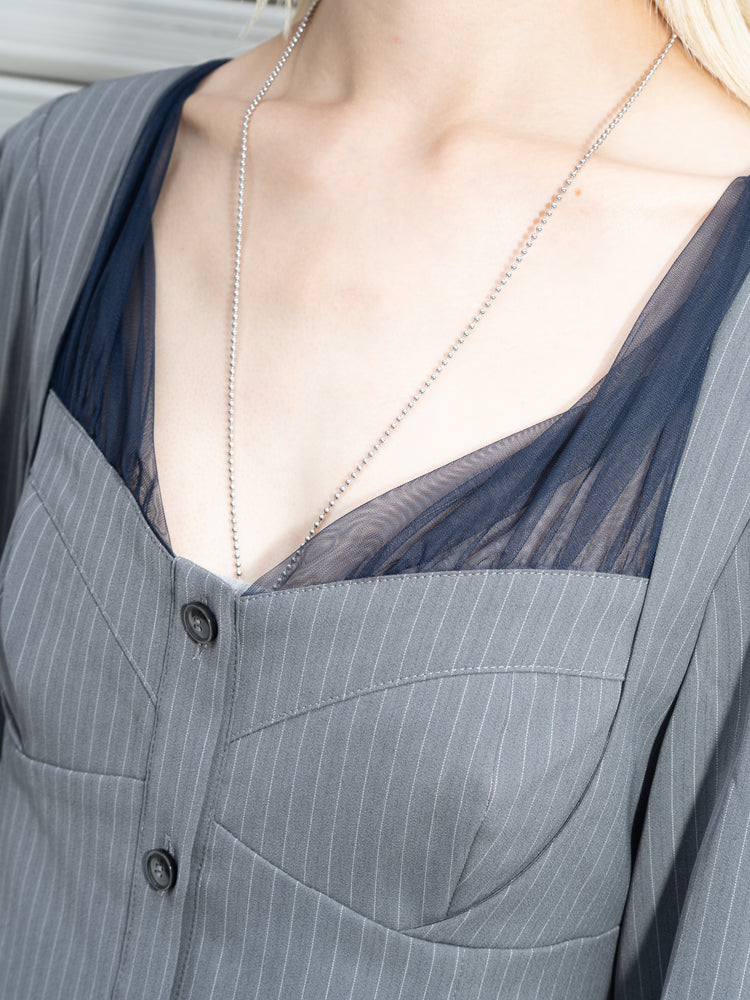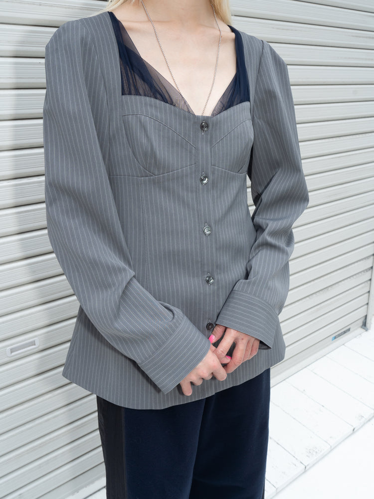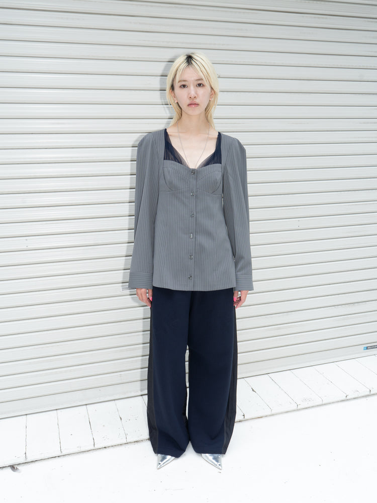 モデル:161cm ITEMS STRIPE BUSTIER SHIRTS ¥28,600 SIZE: FREE COLOR: GRAY NEW NYLON TAFFETA SWEAT PANTS ¥23,100 SIZE: FREE COLOR: BLACK ALL SNAP