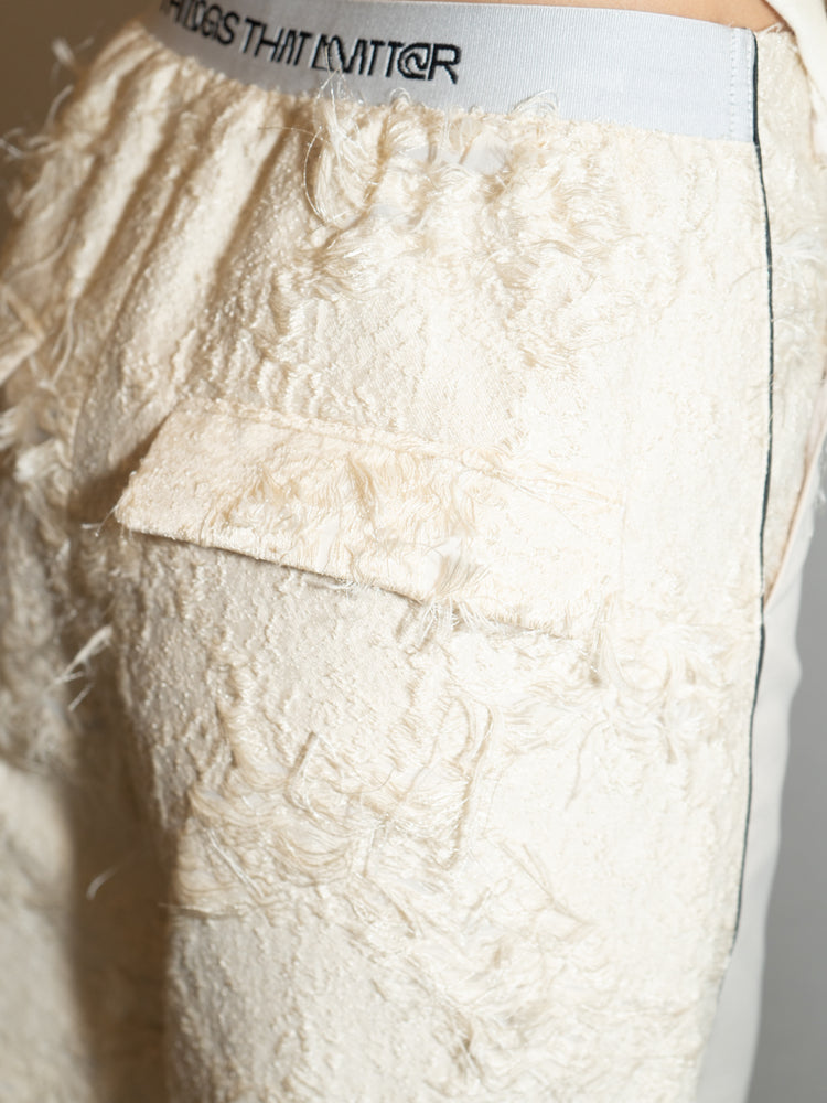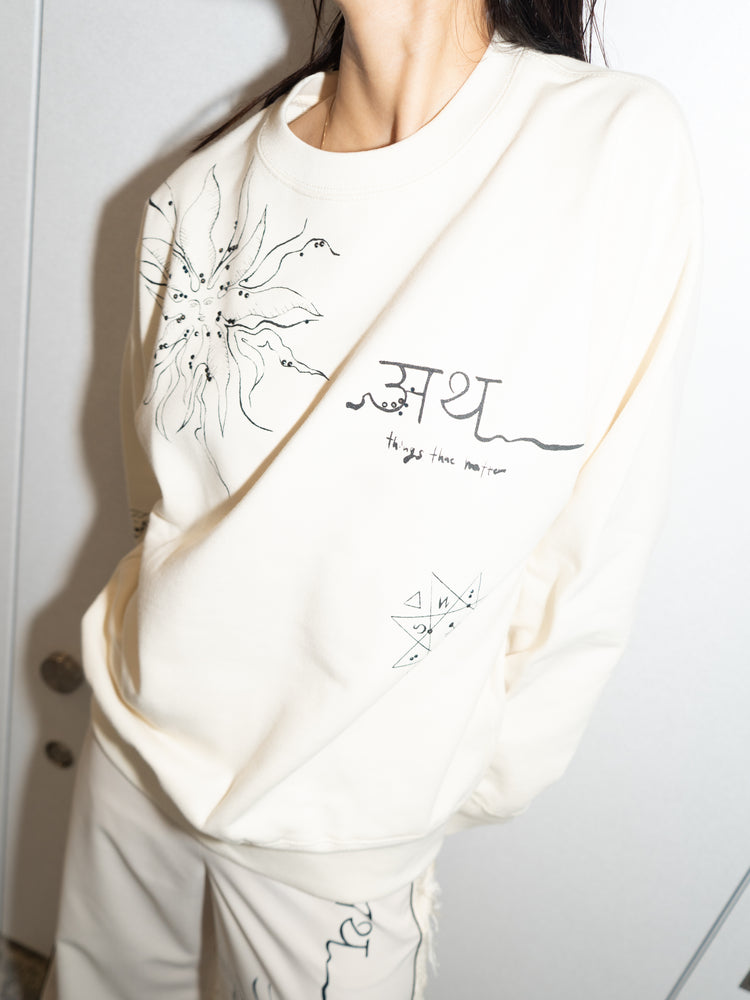 モデル:162cm ITEMS PRE-SENT SPARKLE PULL-OVER ¥24,200 SIZE: FREE COLOR: IVORY PRE-SENT WIDE PANTS ¥39,600 SIZE: 01 COLOR: IVORY ALL SNAP