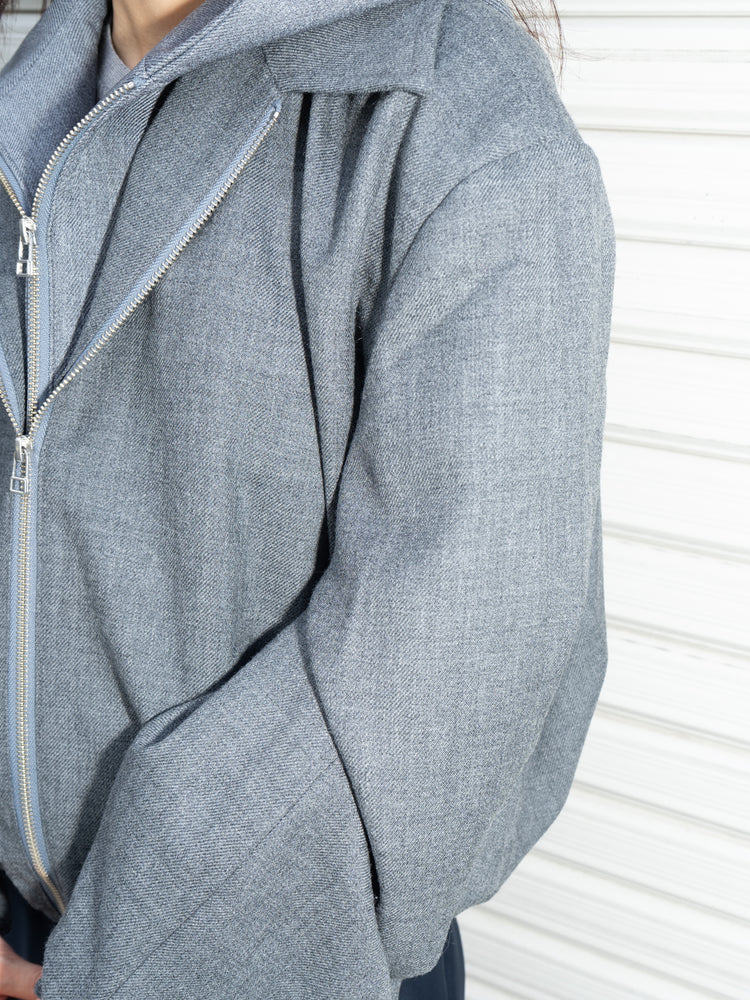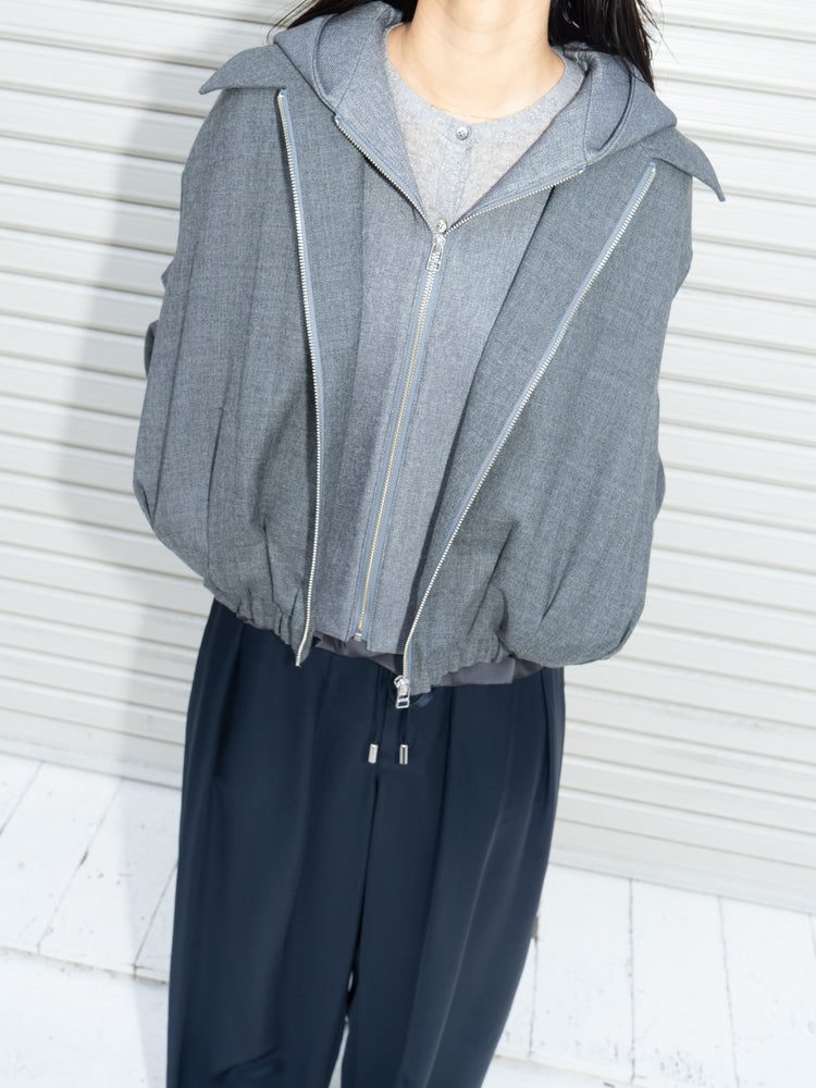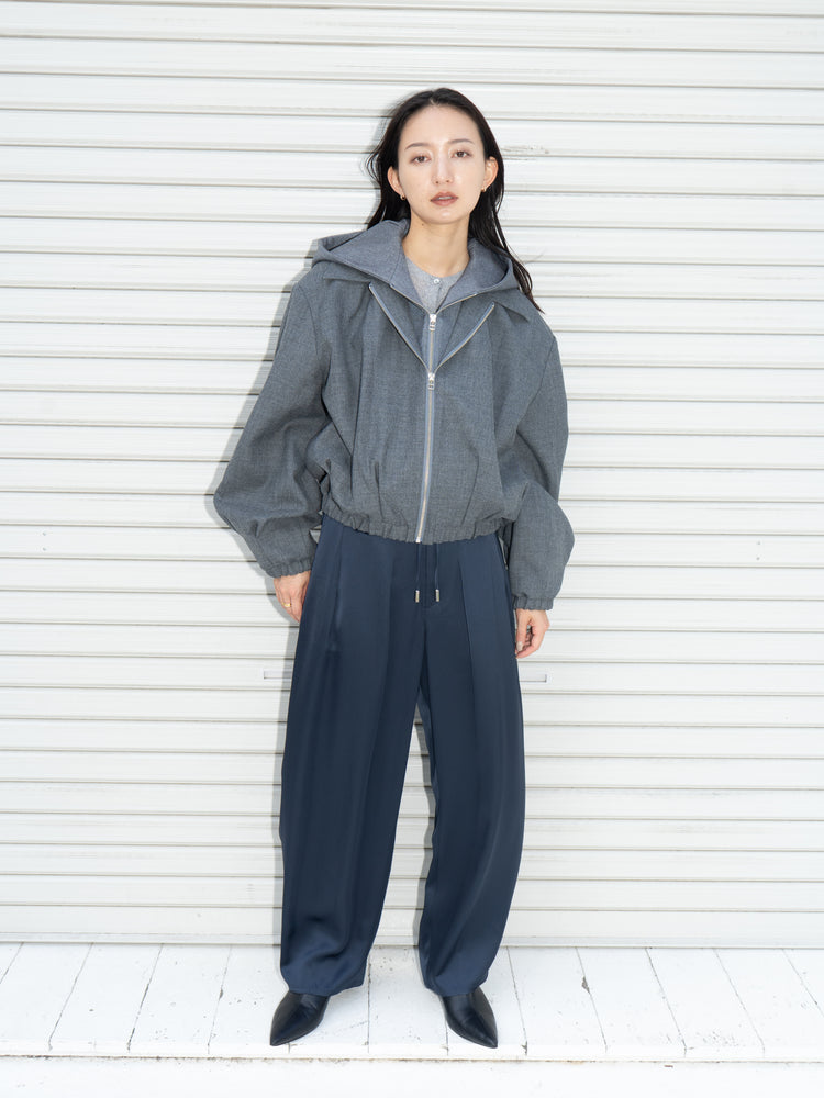 モデル:162cm ITEMS DRY WOOL HOODIE JACKET ¥41,800 SIZE: FREE COLOR: GRAY PEPLUM SATIN EASY PANTS ¥29,700 SIZE: 01 COLOR: NAVY ALL SNAP