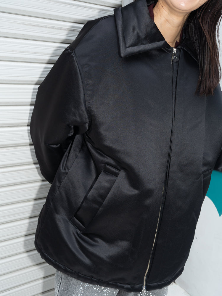 モデル:162cm ITEMS SATIN PAD JACKET ¥45,100 SIZE: FREE COLOR: BLACK SPARKLE DENIM PANTS ¥39,600 SIZE: 02 COLOR: BLACK ALL SNAP