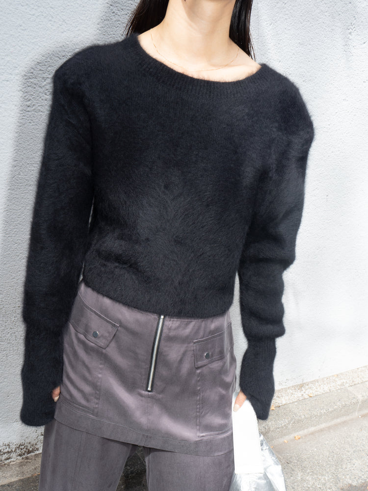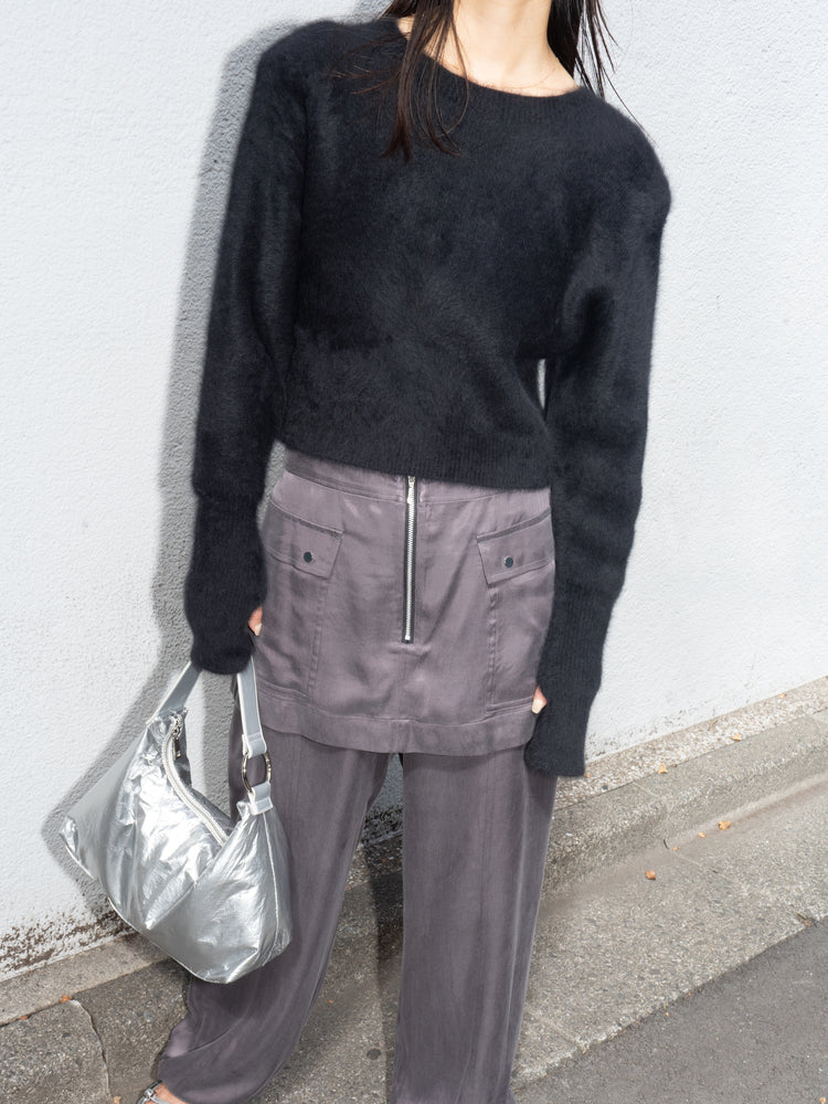 モデル:162cm ITEMS 2WAY CROPPED FOX KNIT CARDIGAN ¥39,600 SIZE: FREE COLOR: BLACK FIBRIL SATIN PANTS WITH SKIRT ¥35,200 SIZE: 2 COLOR: CHARCOAL ALL SNAP
