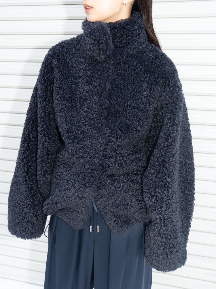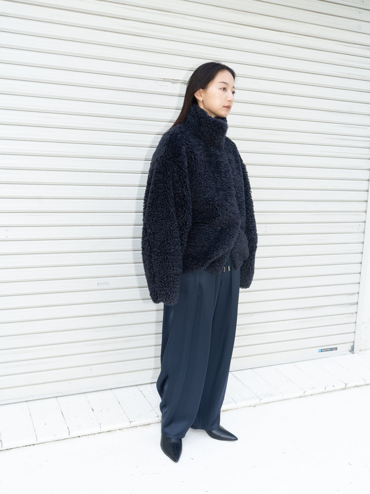モデル:162cm ITEMS IMITATION SHEEP FUR JACKET ¥44,000 SIZE: FREE COLOR: NAVY PEPLUM SATIN EASY PANTS ¥29,700 SIZE: 02 COLOR: NAVY ALL SNAP