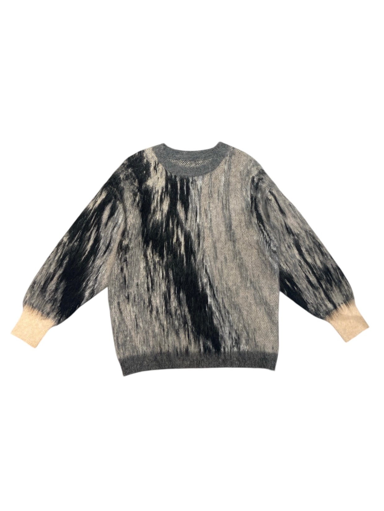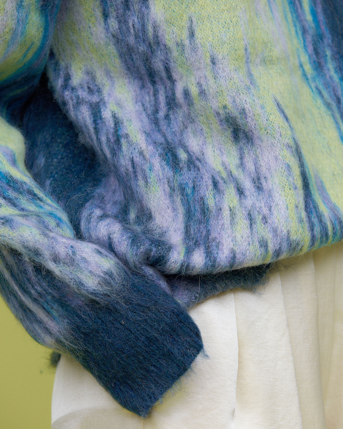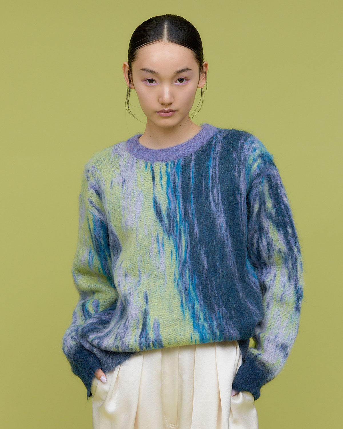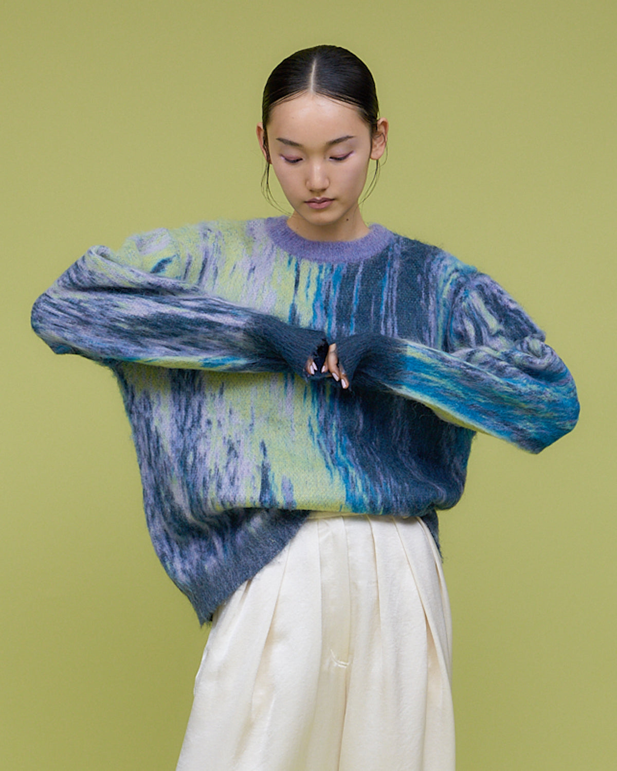 5色のジャガードとモヘヤの柔らかさでニュアンスな柄を表現。配色にこだわり、リブの色や両袖の柄も異なる、存在感のある1着です。