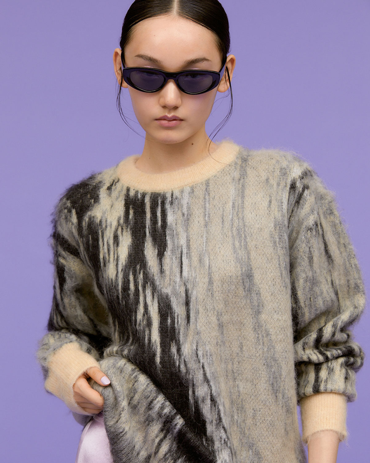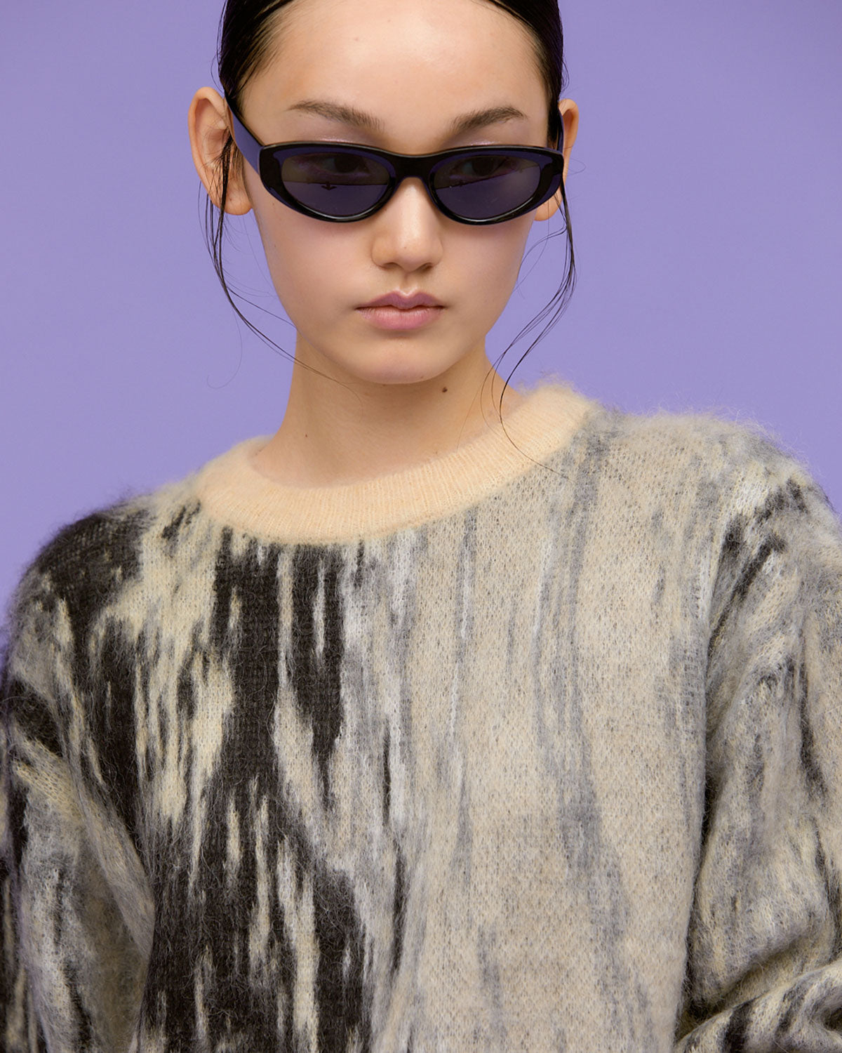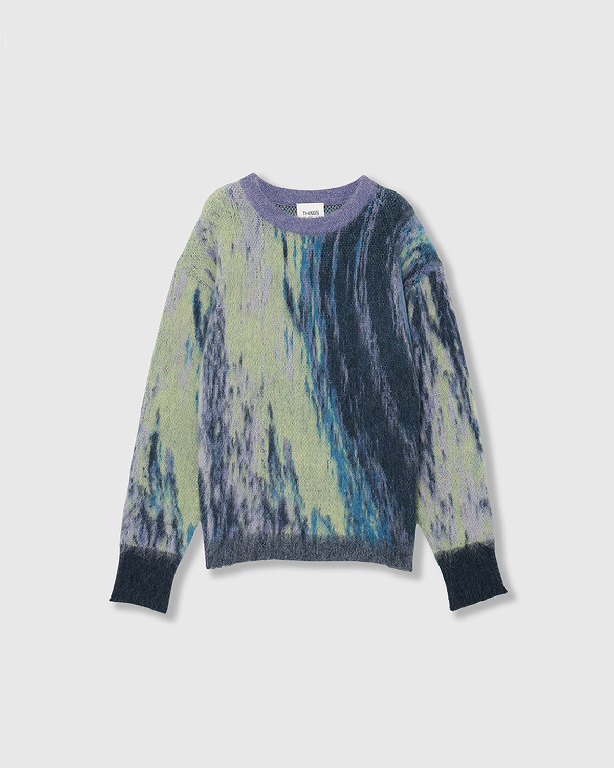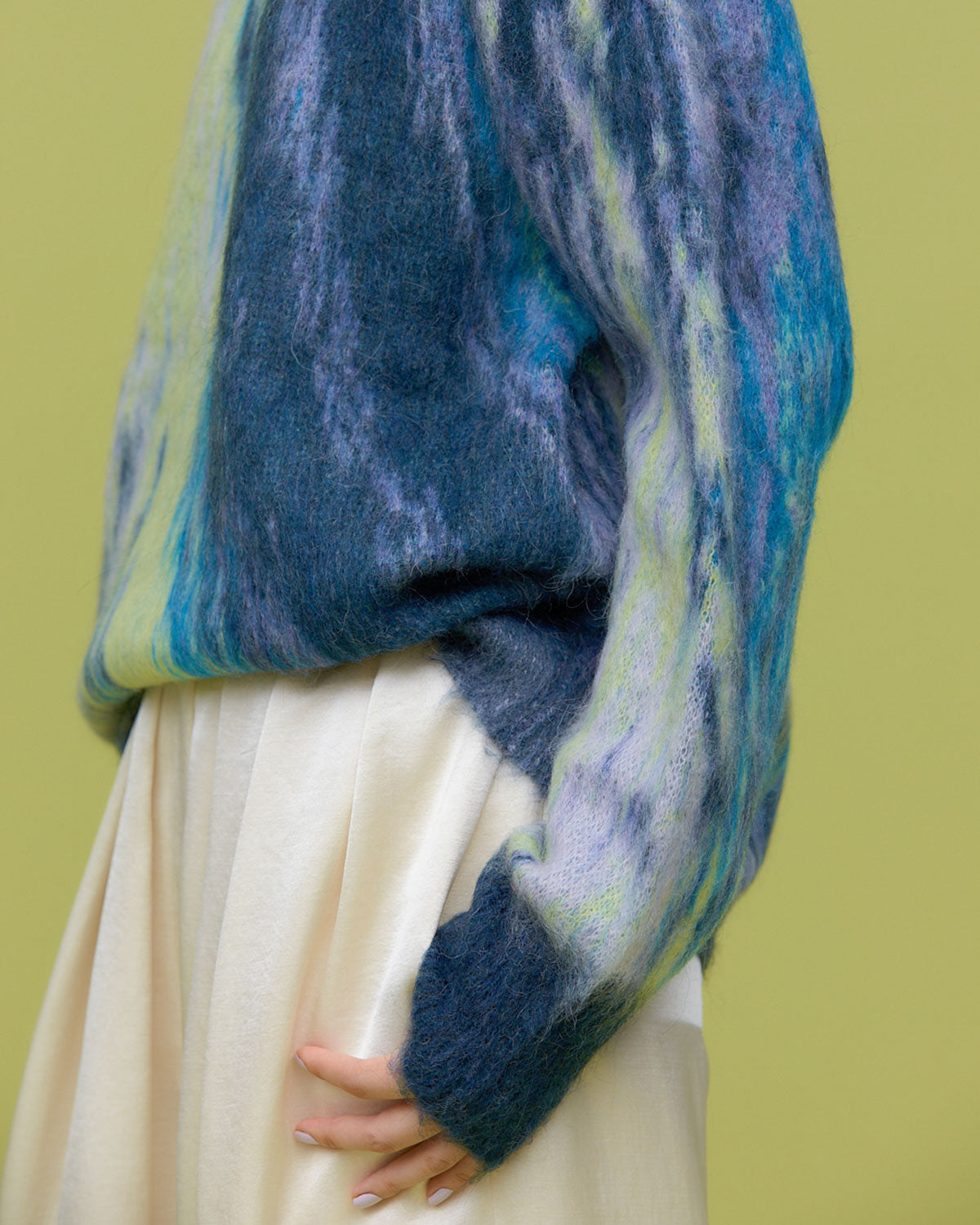 5色のジャガードとモヘヤの柔らかさでニュアンスな柄を表現。配色にこだわり、リブの色や両袖の柄も異なる、存在感のある1着です。