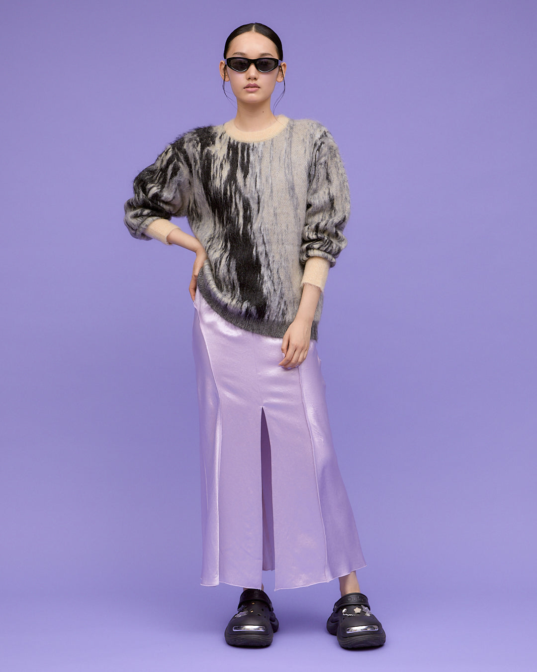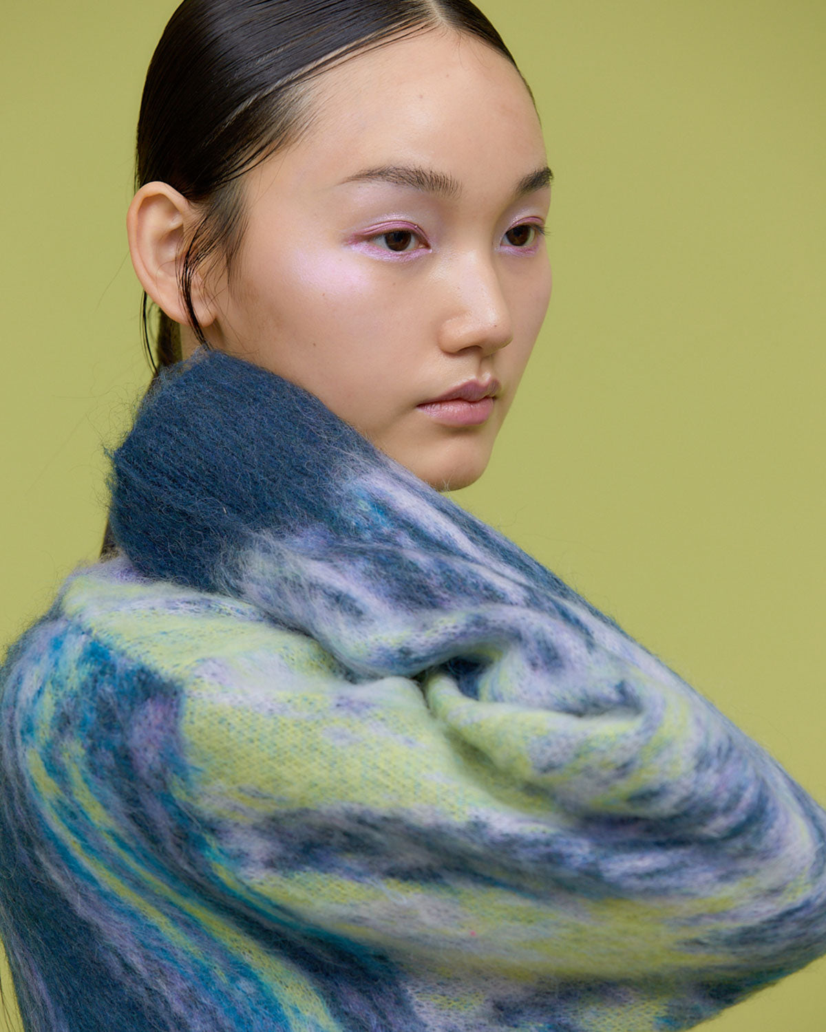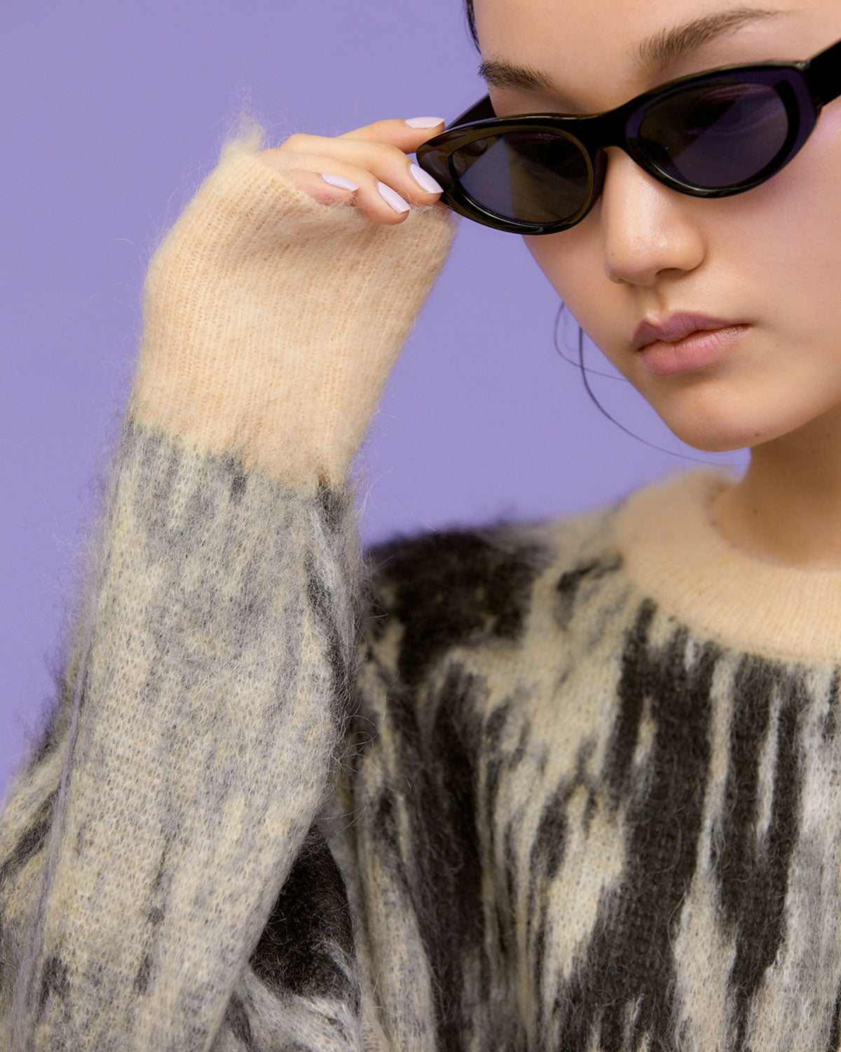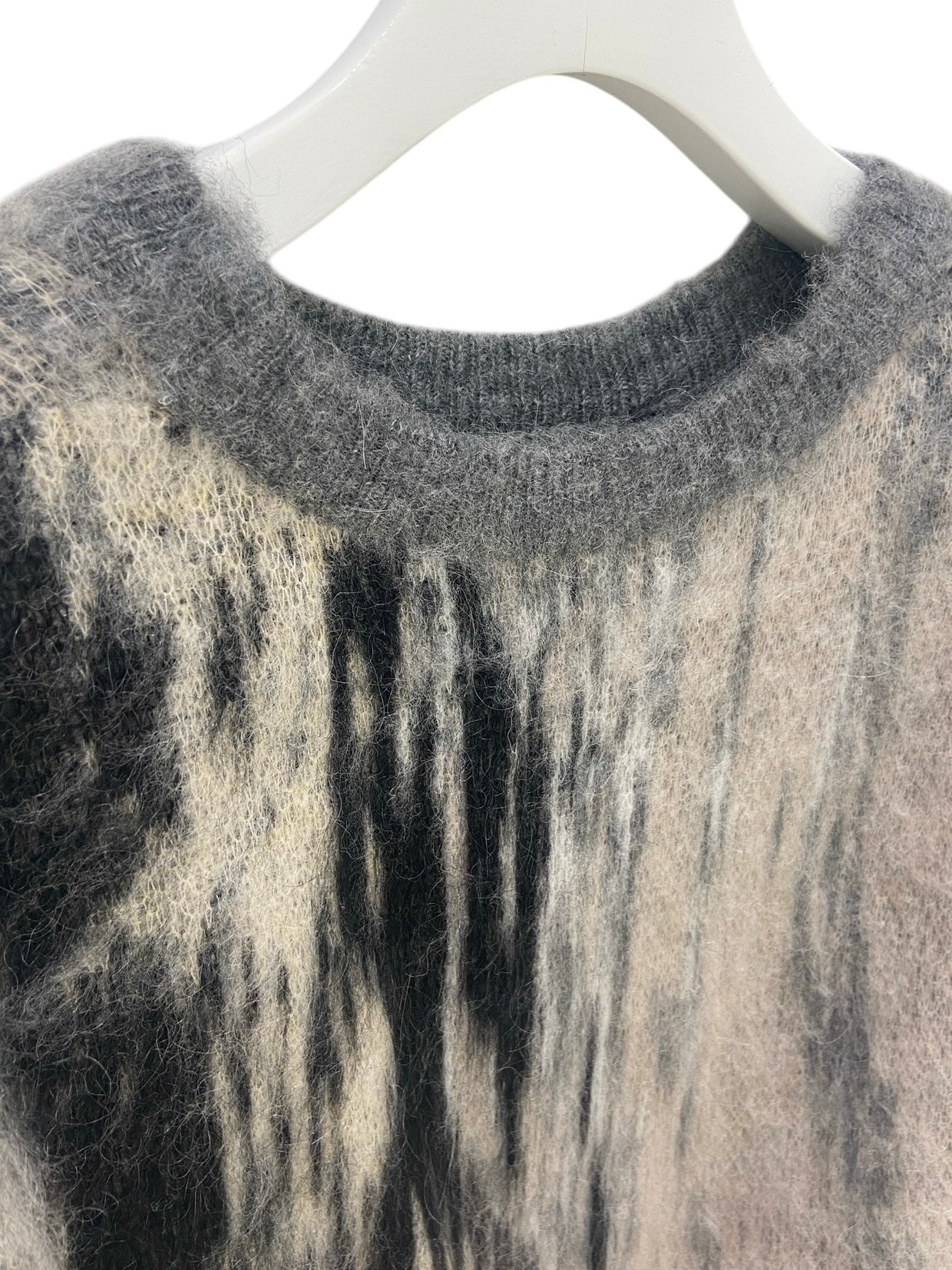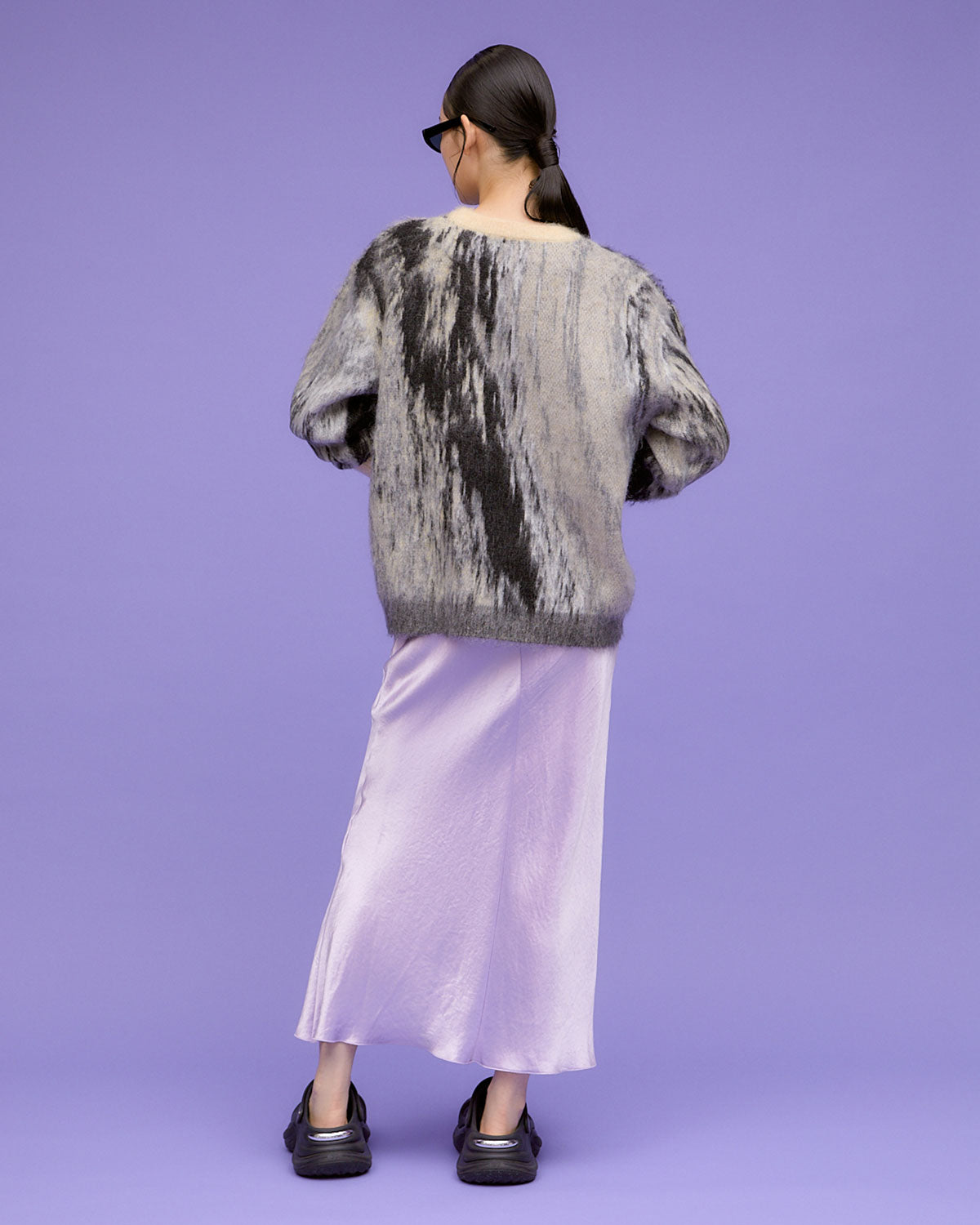 5色のジャガードとモヘヤの柔らかさでニュアンスな柄を表現。配色にこだわり、リブの色や両袖の柄も異なる、存在感のある1着です。