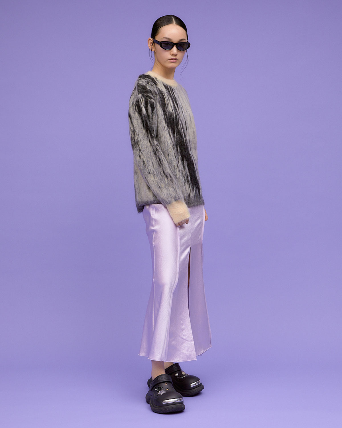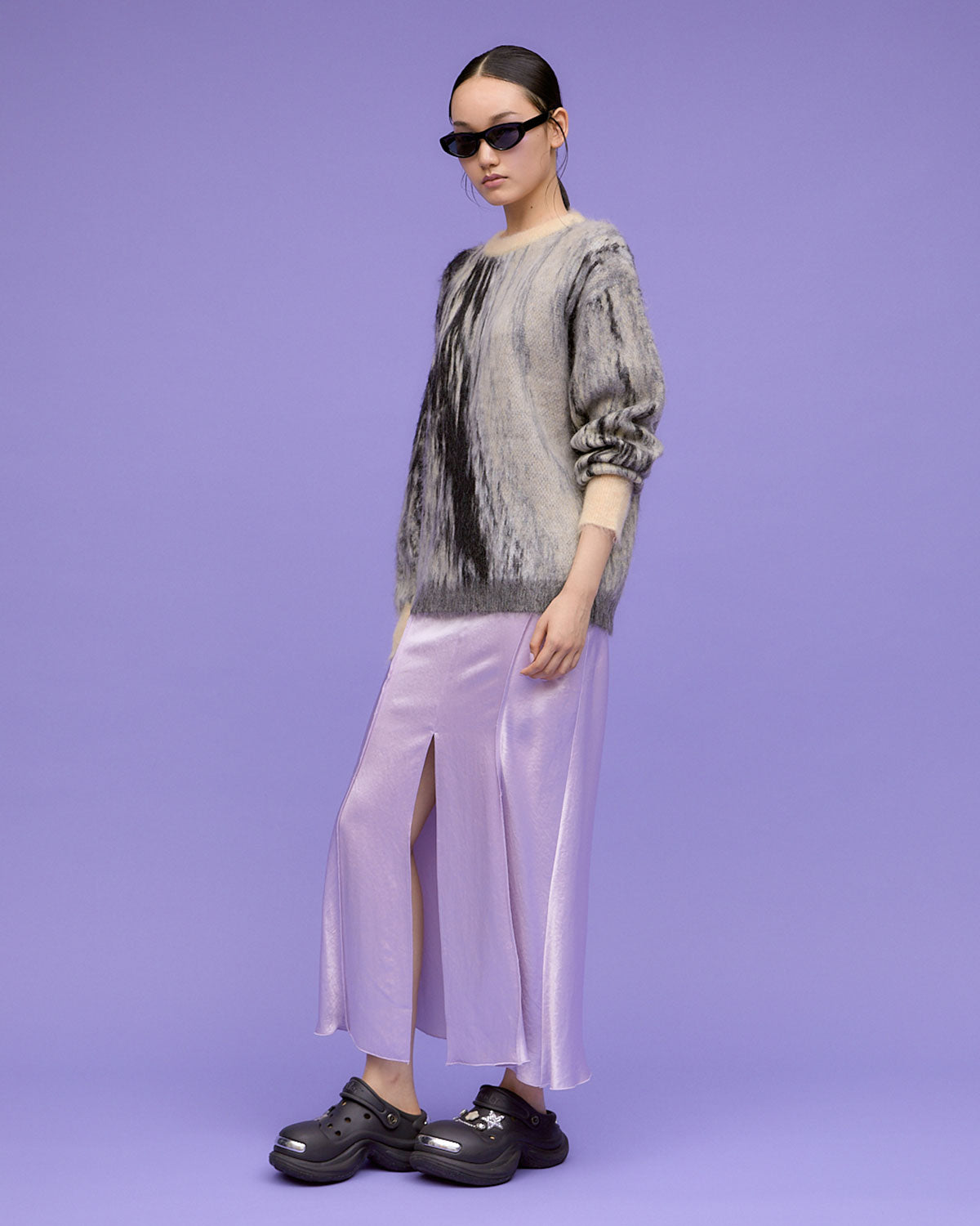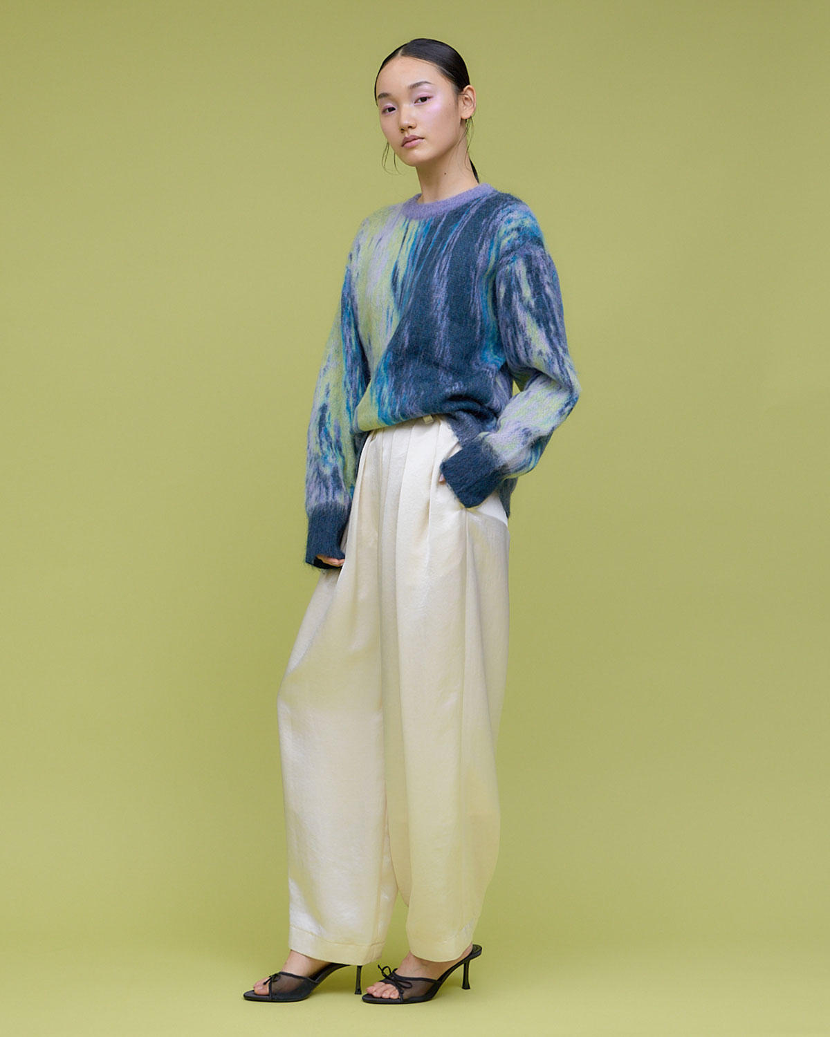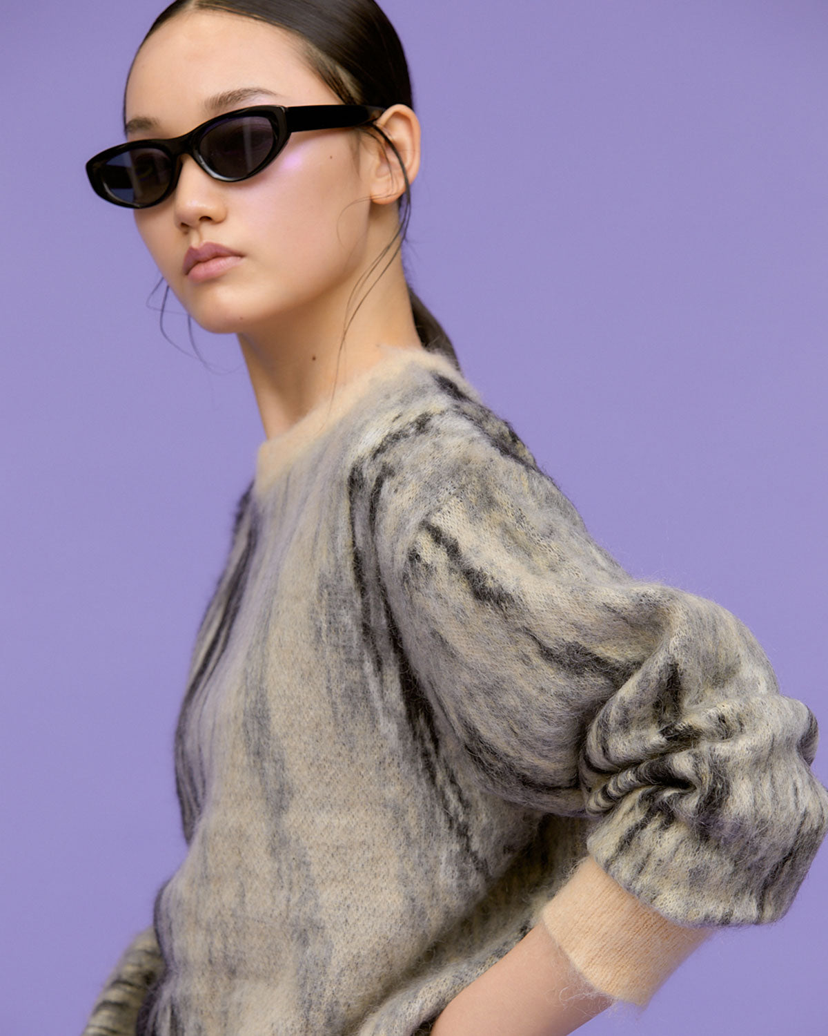 5色のジャガードとモヘヤの柔らかさでニュアンスな柄を表現。配色にこだわり、リブの色や両袖の柄も異なる、存在感のある1着です。