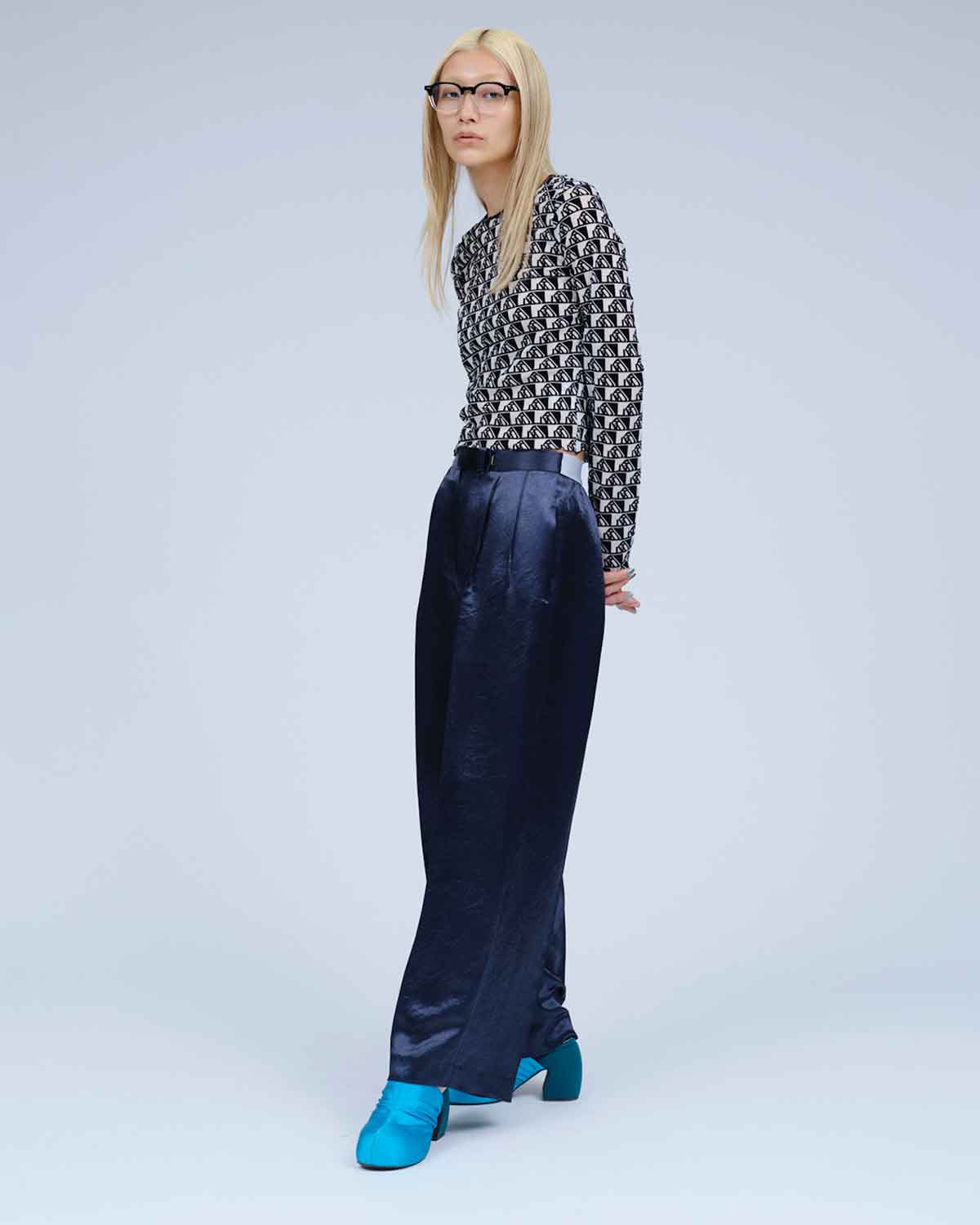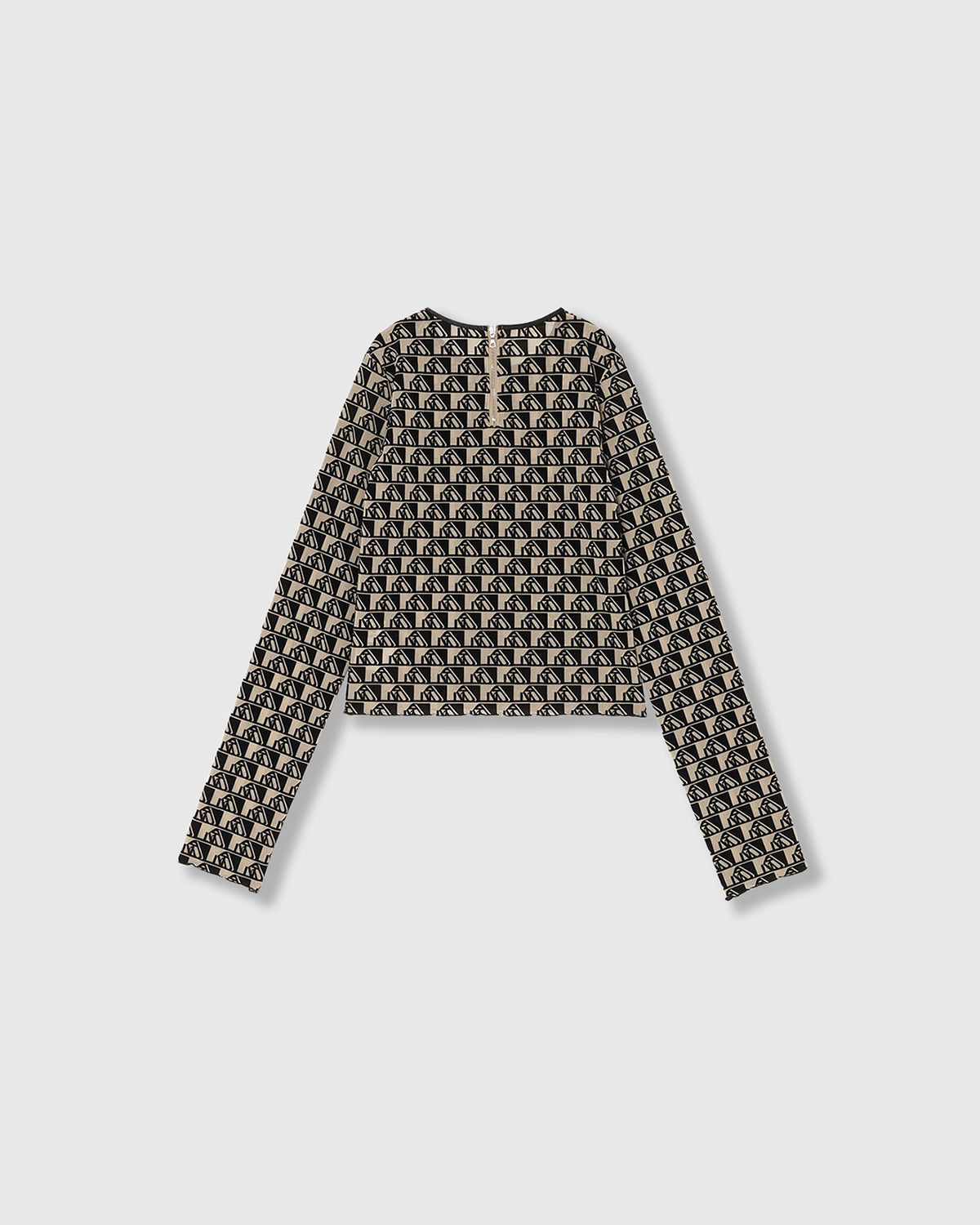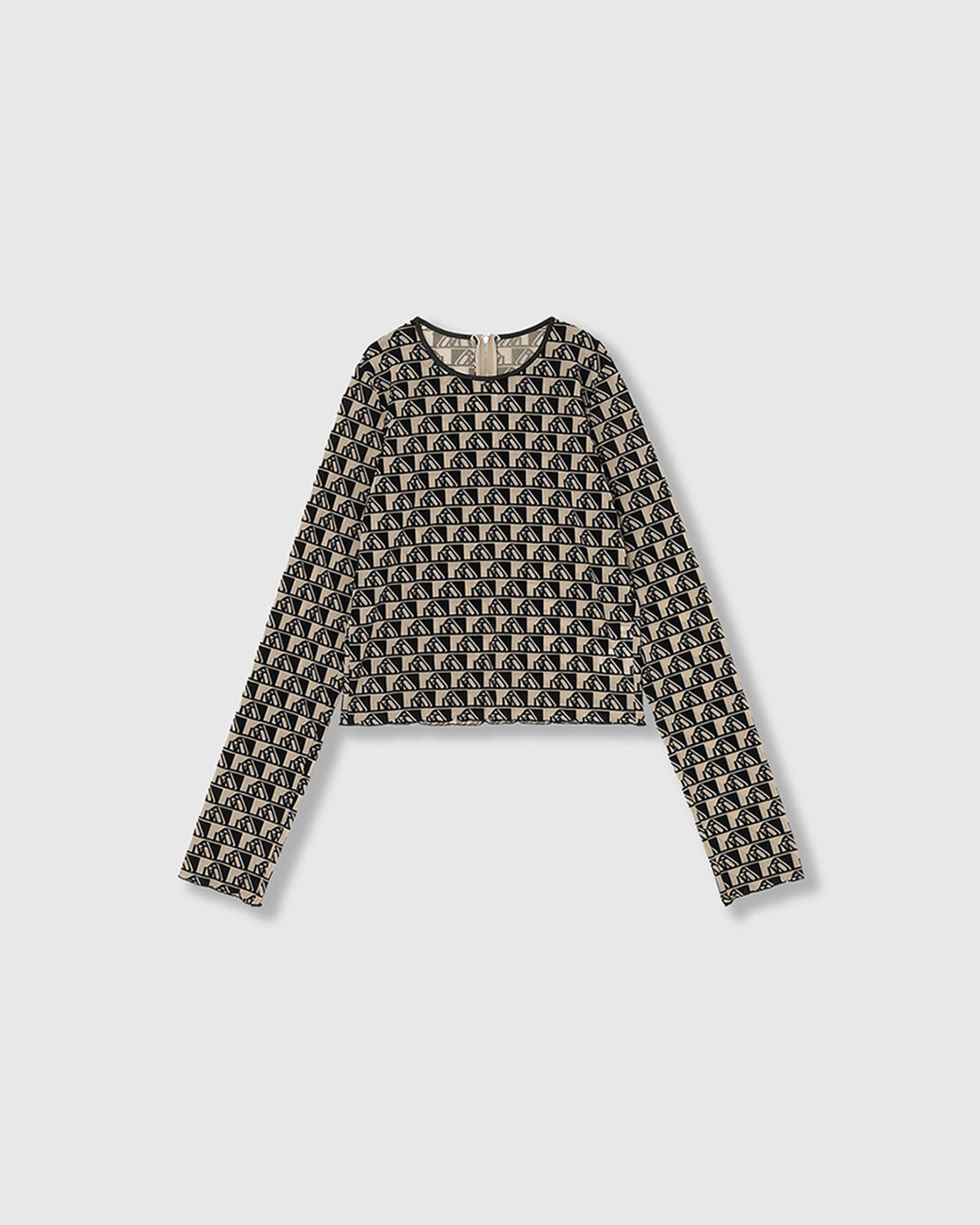 伸縮性のあるソフトチュールにブランドモノグラム柄をフロッキープリントで表現したユニークな一枚。タイトな襟ぐりとクロップド丈とのバランスに拘ったコンパクトなトップスです。一枚でポイントとなるトップスはスタイリングのアクセントに。
