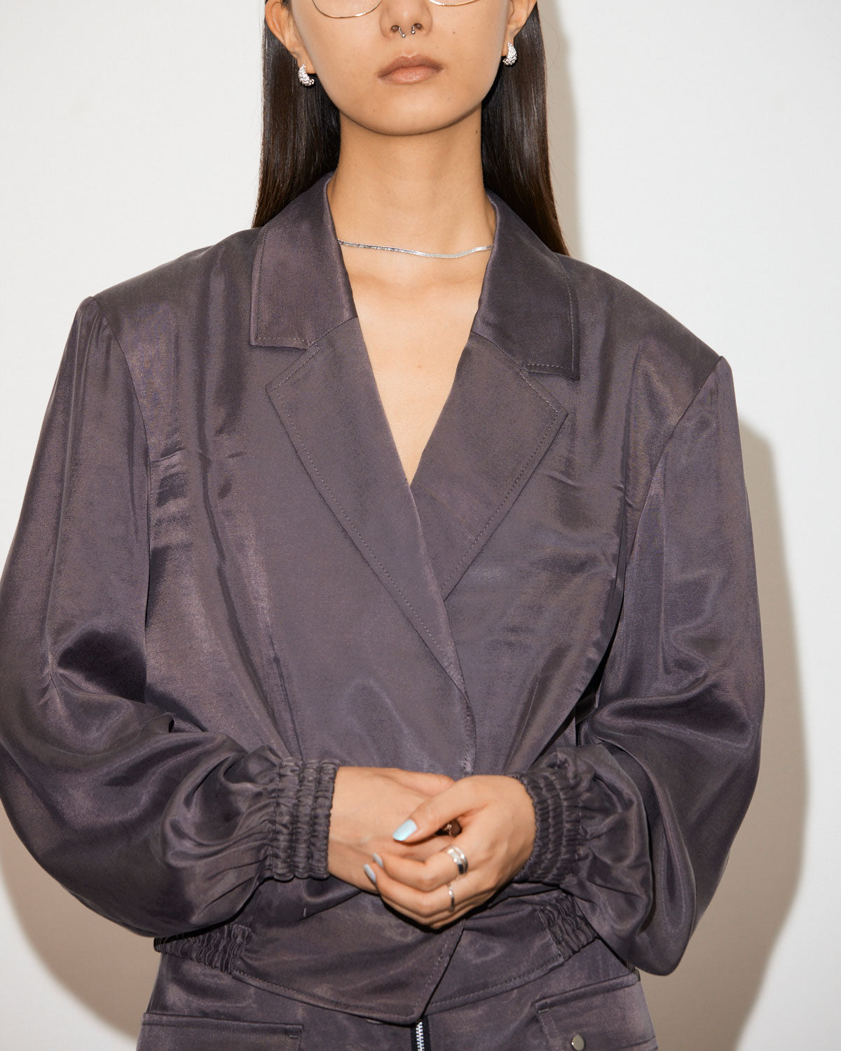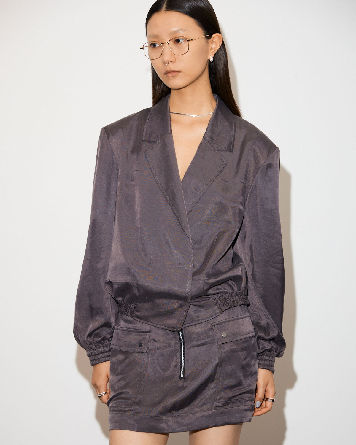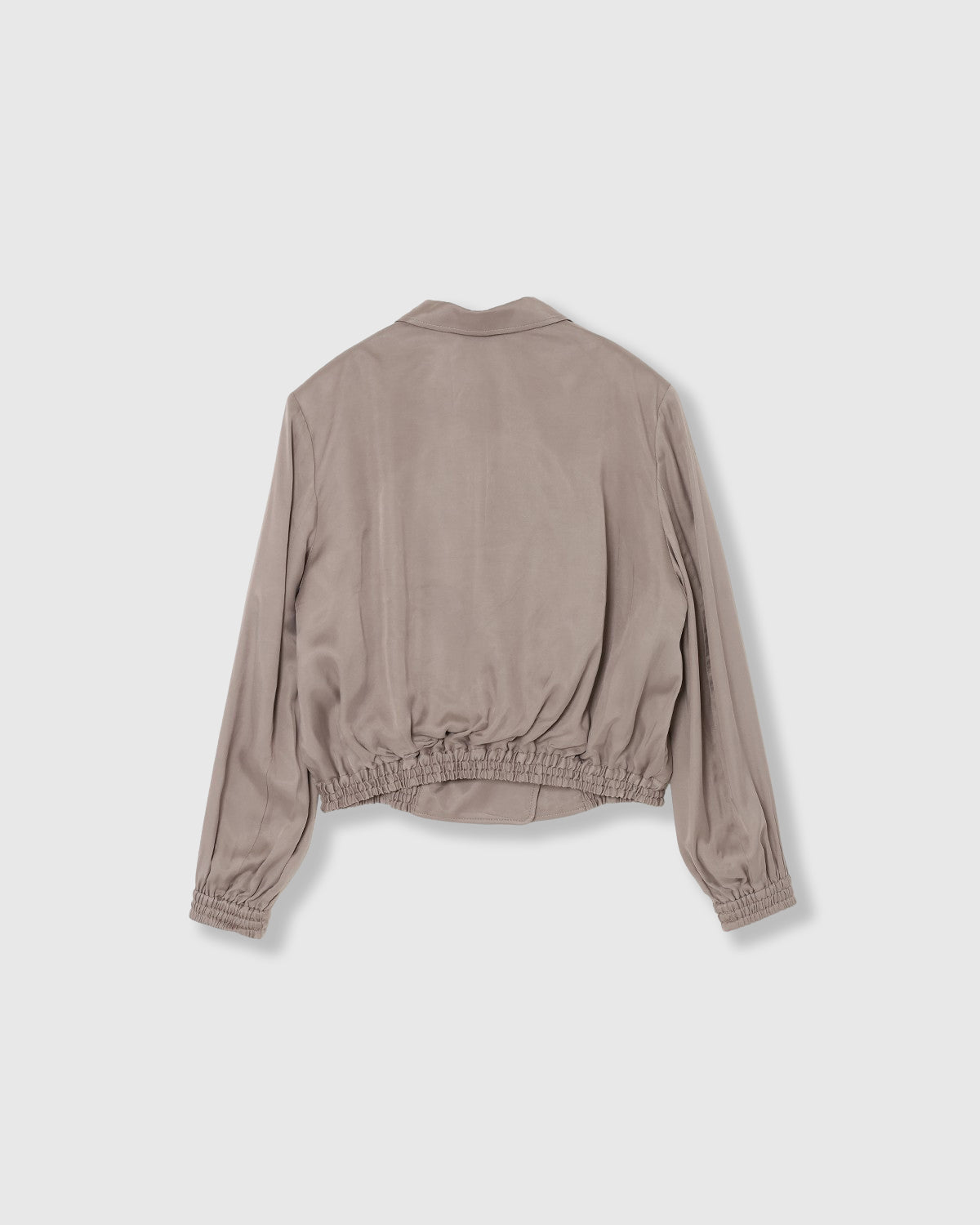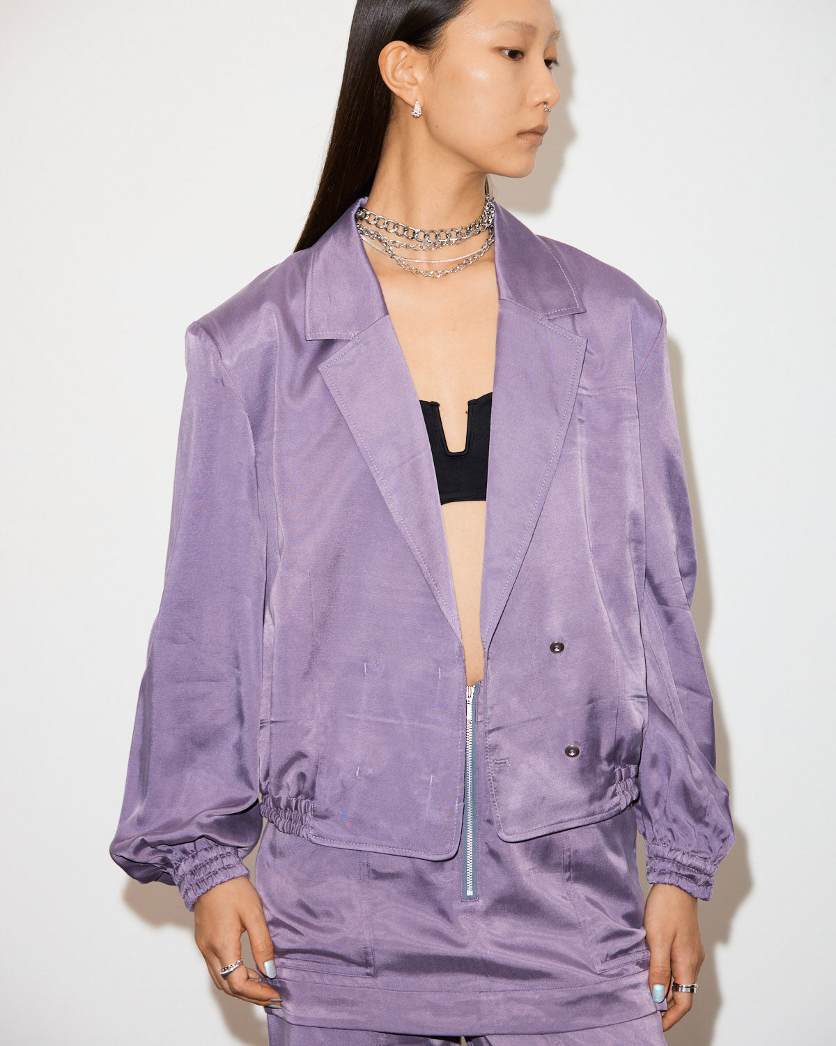 テーラードカラーにフロントがダブルになったサテンジャケットブルゾン。ニュアンスカラーが美しく、モードにもカジュアルにも着こなせるアイテムとなっています。
