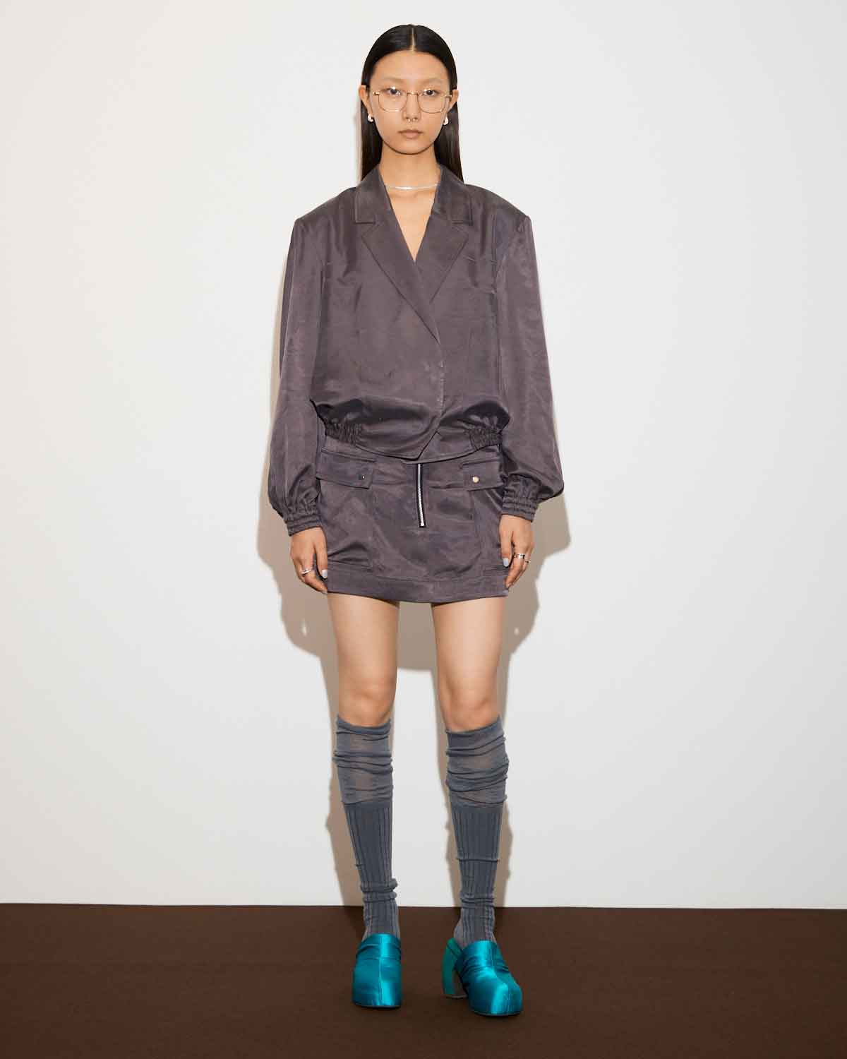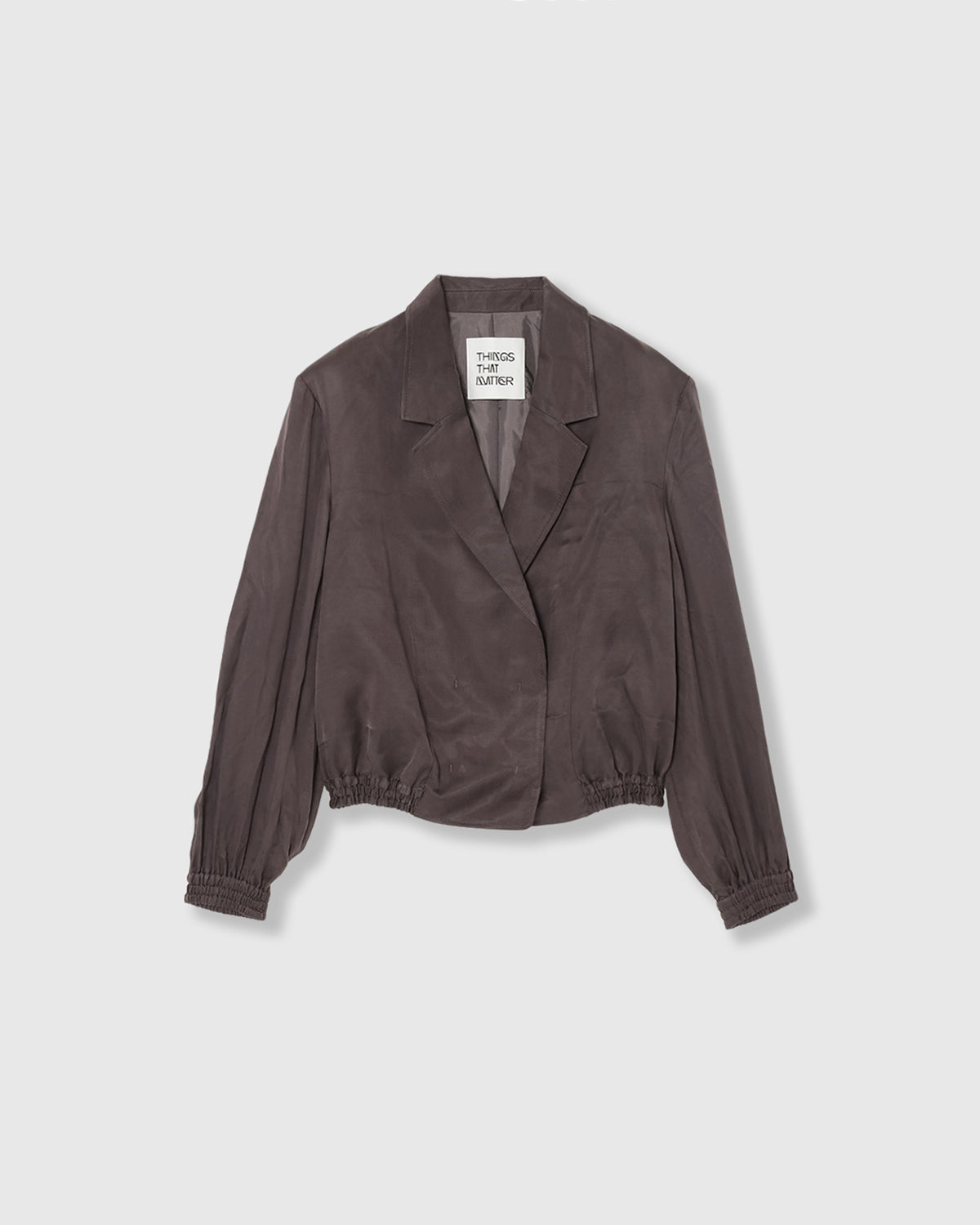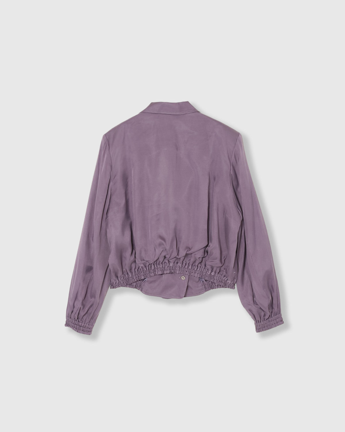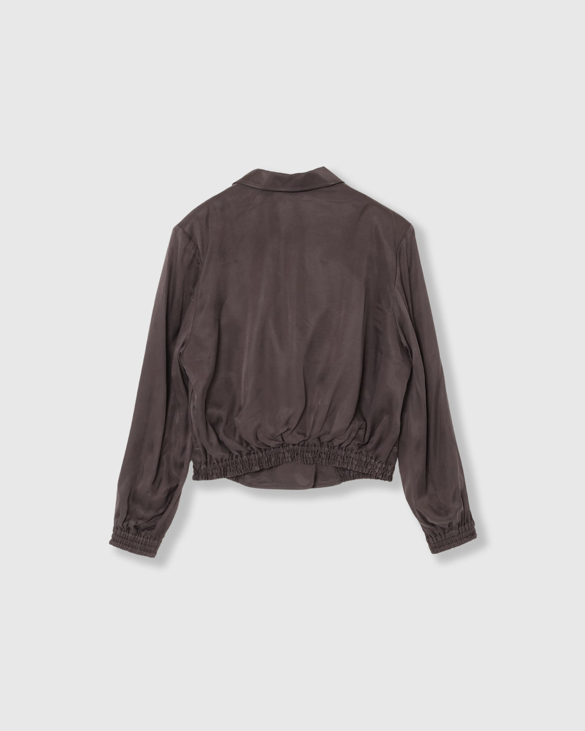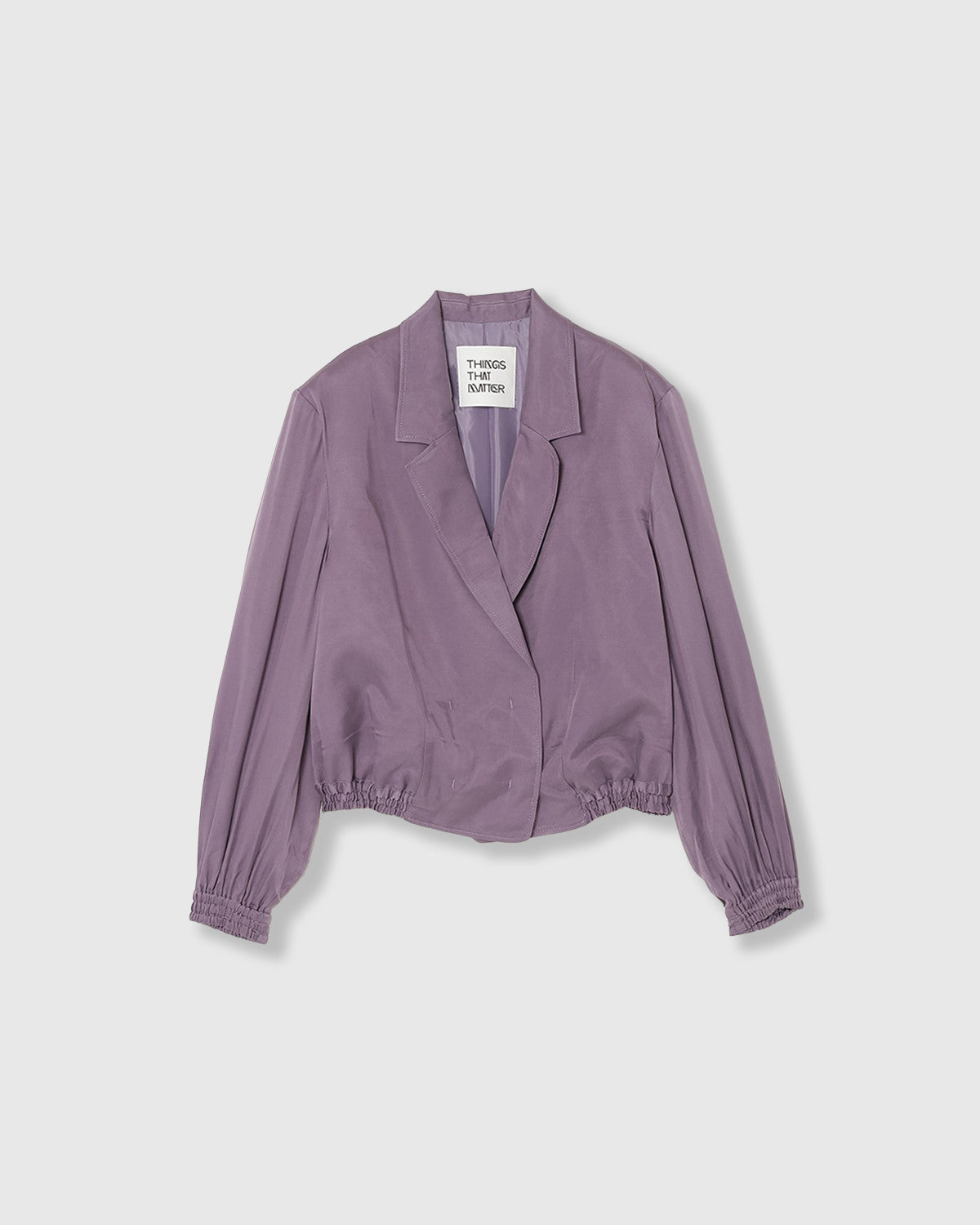 テーラードカラーにフロントがダブルになったサテンジャケットブルゾン。ニュアンスカラーが美しく、モードにもカジュアルにも着こなせるアイテムとなっています。