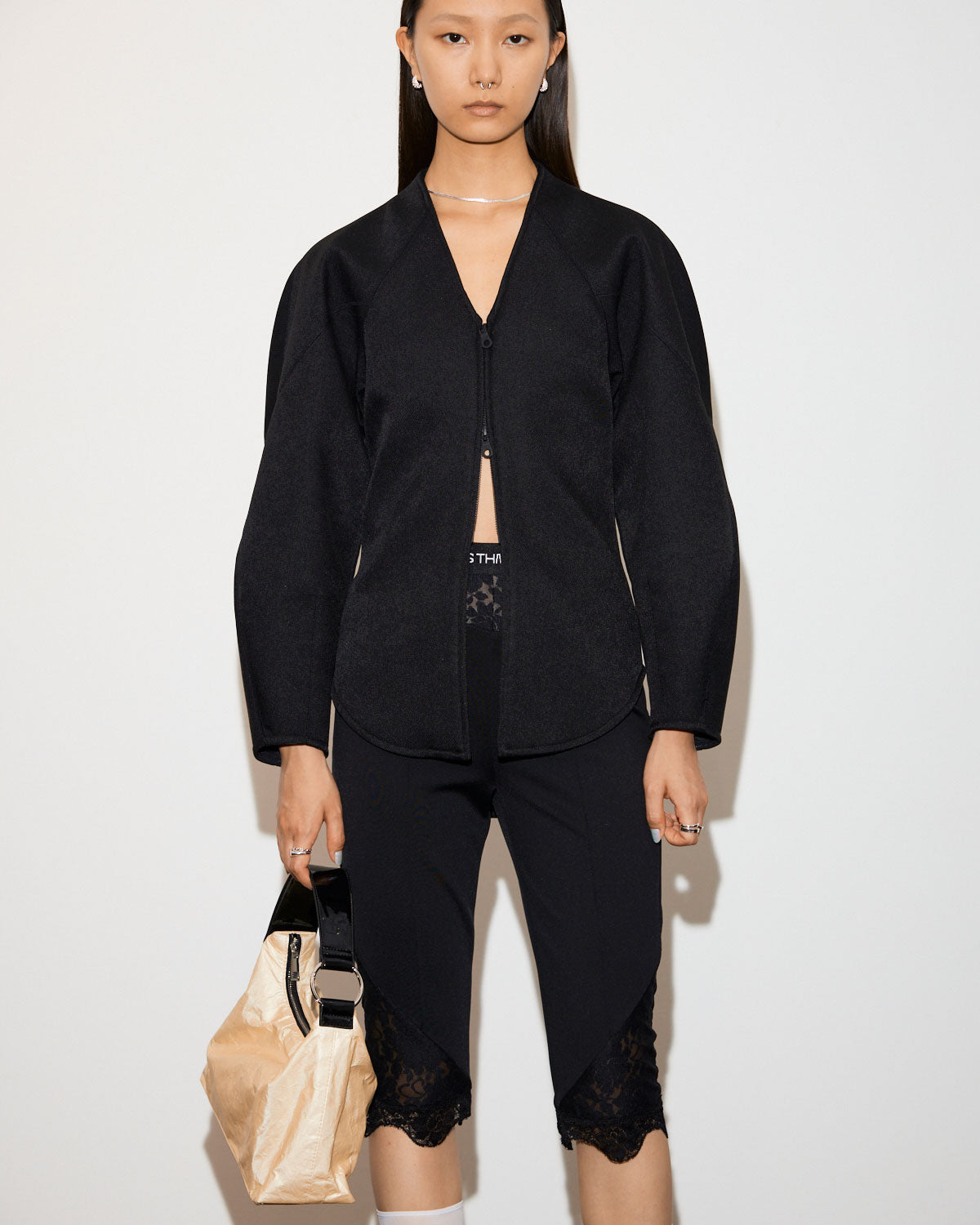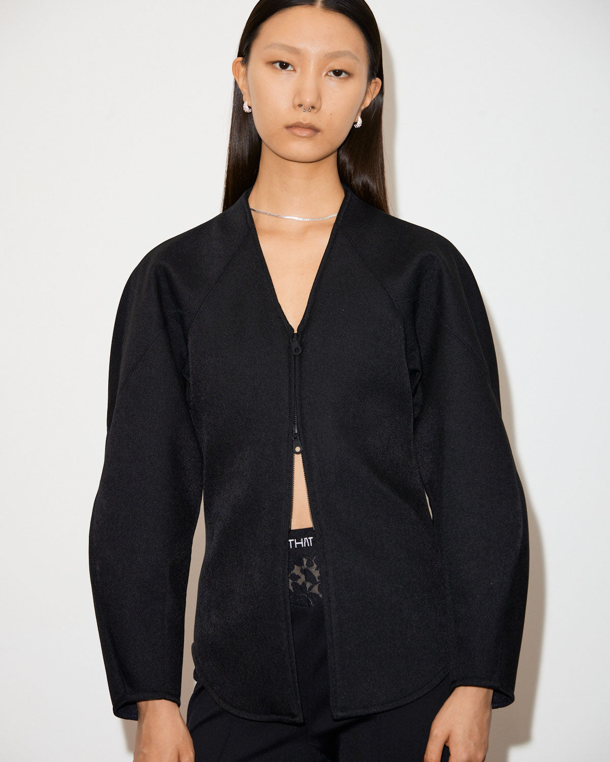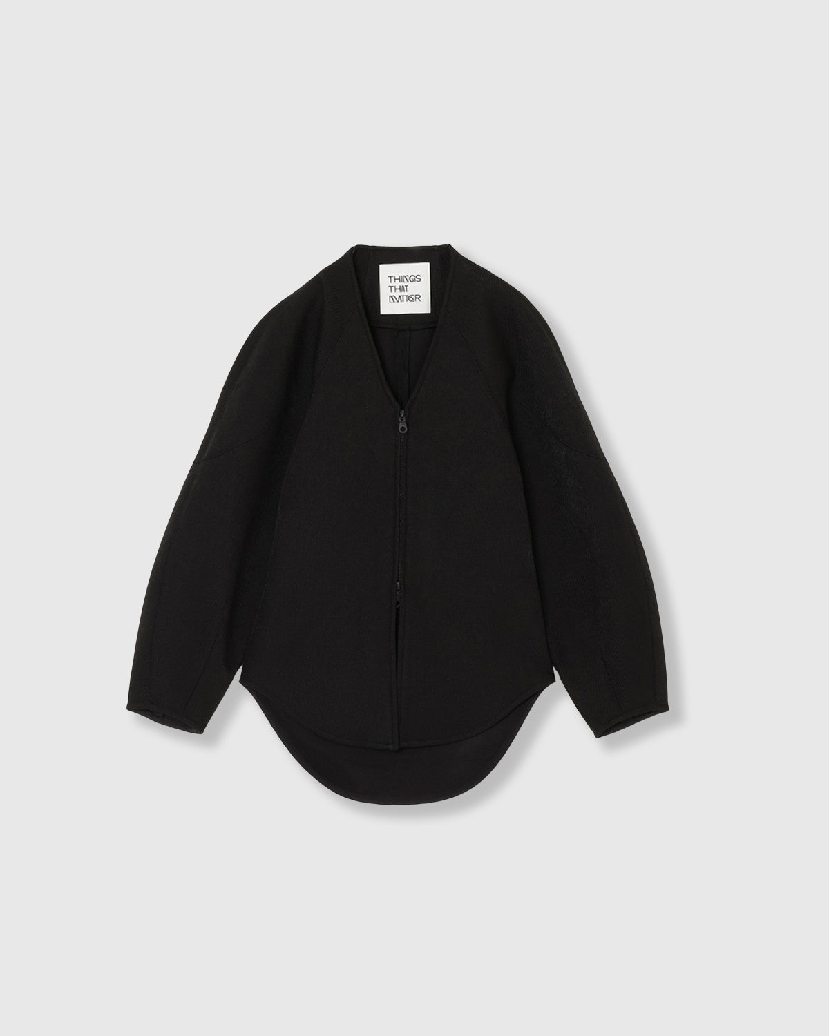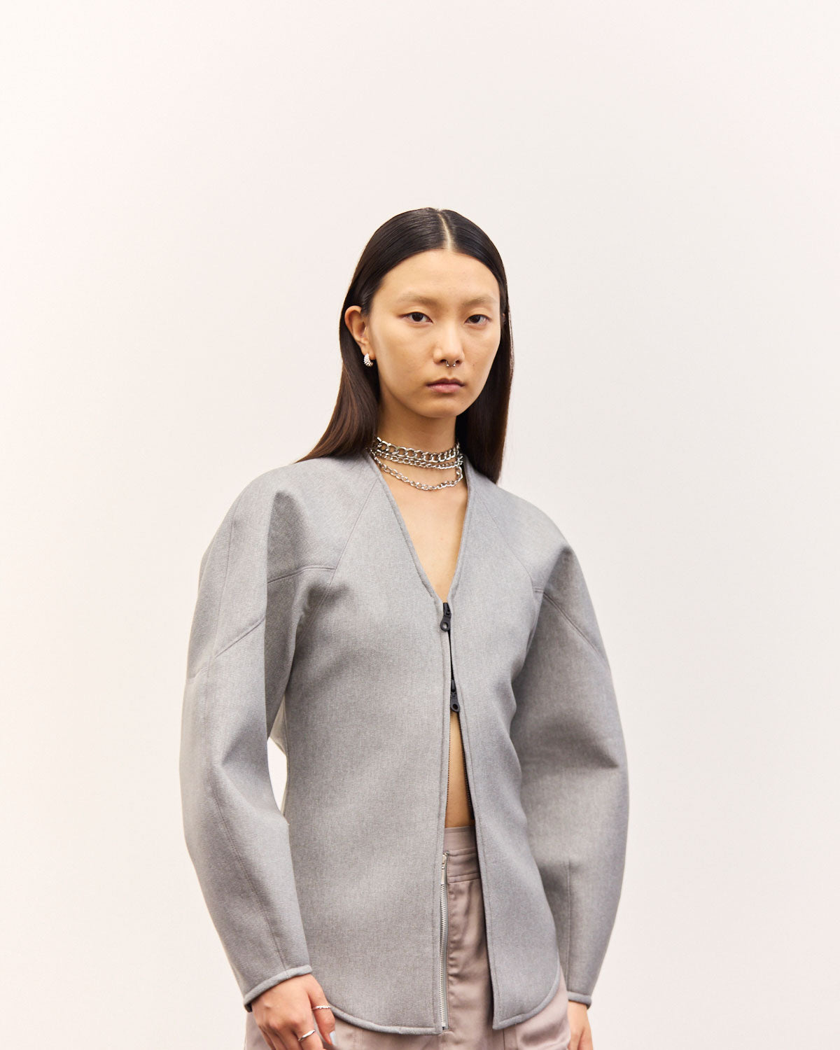 杢調のダンボールニットを使用した構築的なシルエットのVネックジャケット。