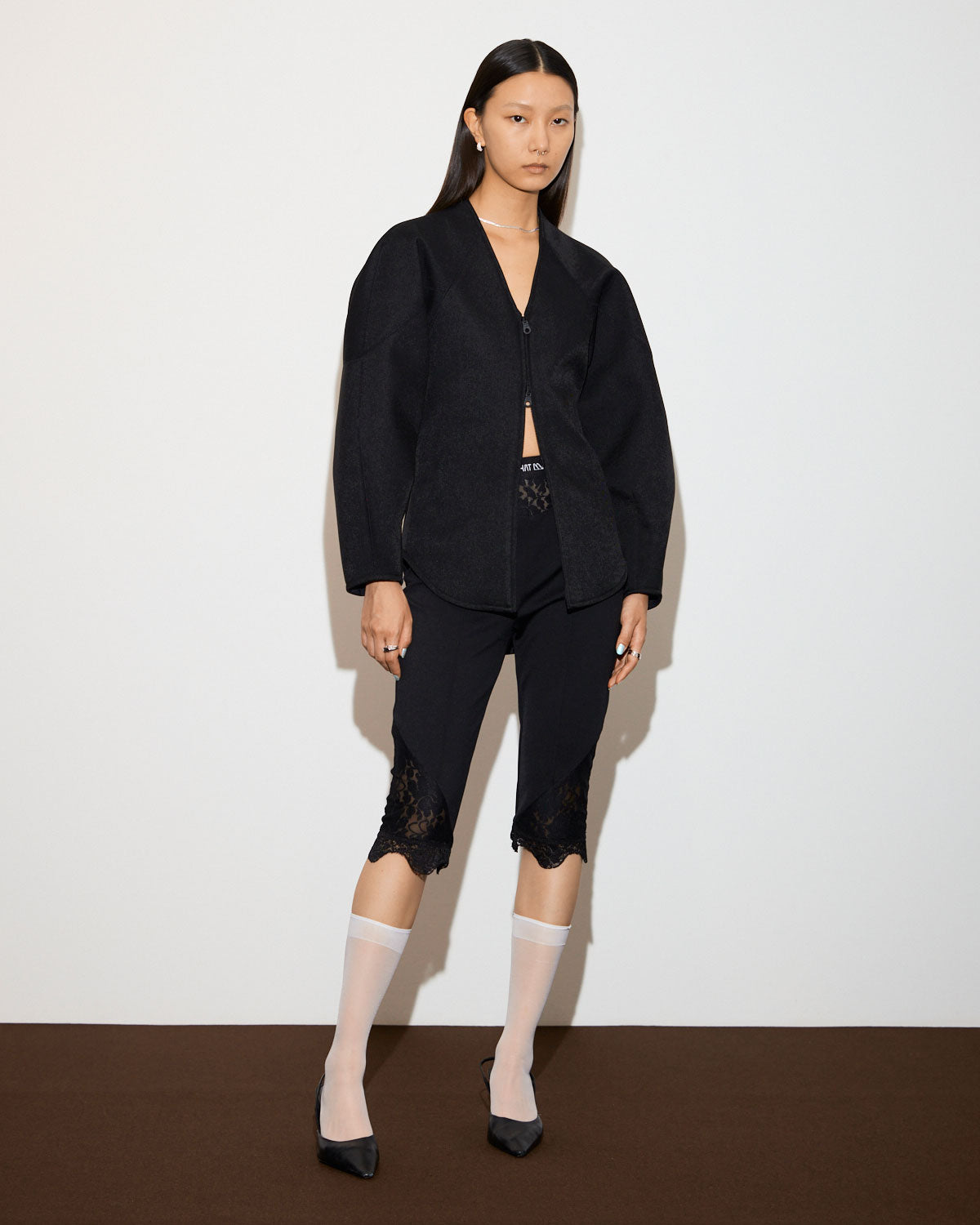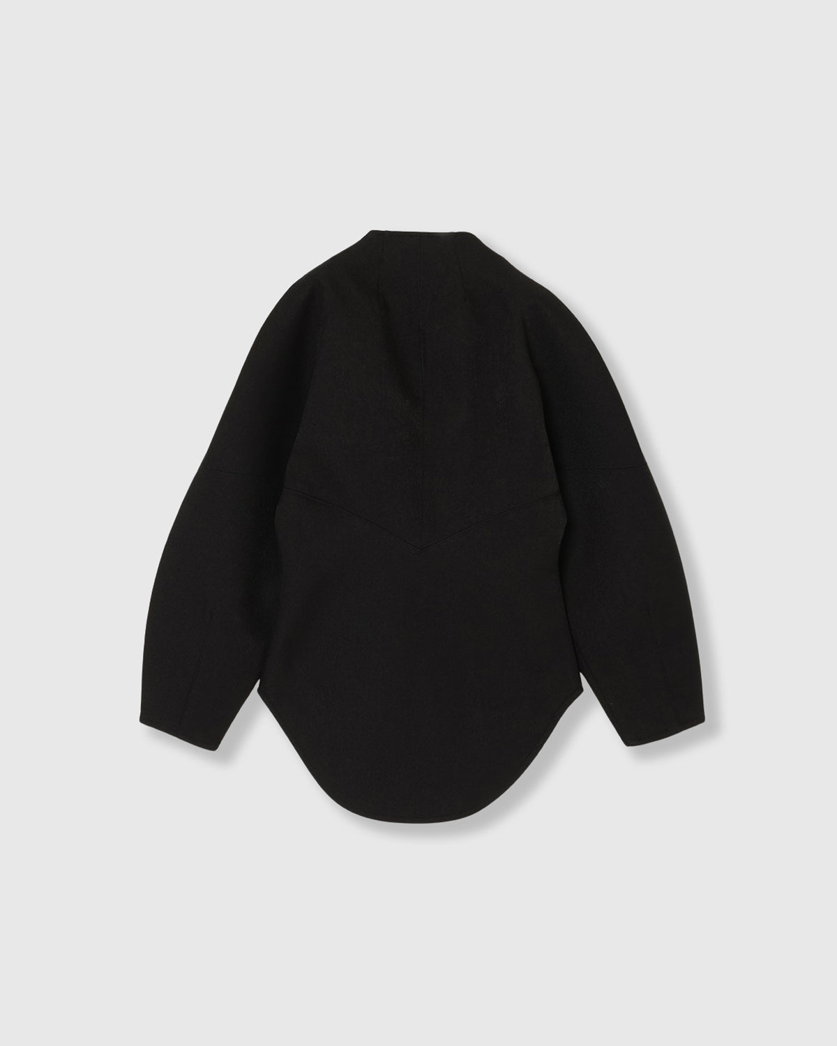 大きく張り出し丸みを帯びた肩からアームにかけてのシルエットとタイトに絞ったウェストラインとのメリハリが個性的なジャケット。同素材のショートパンツのセットアップスタイルがおすすめです。