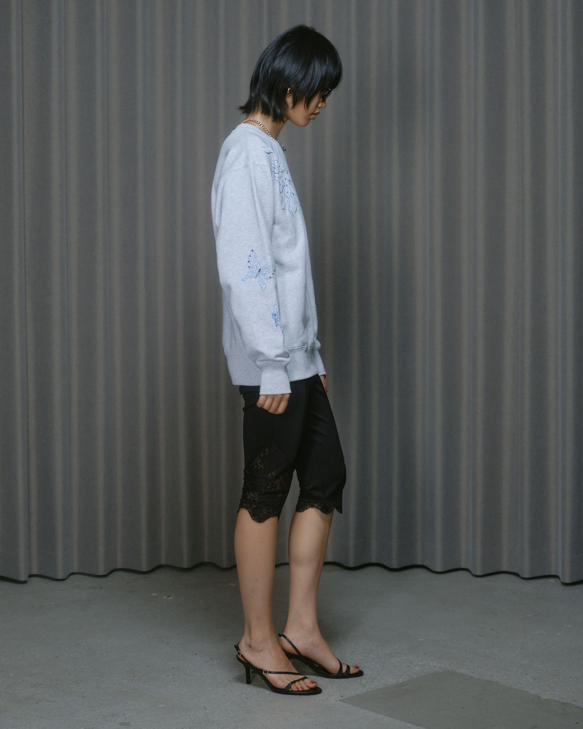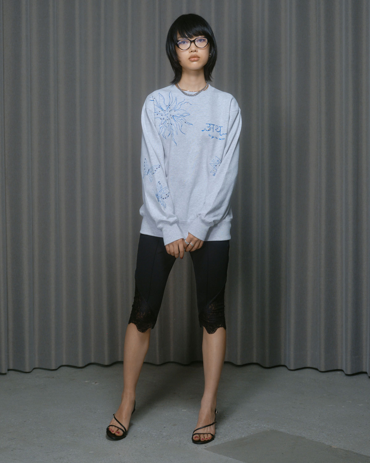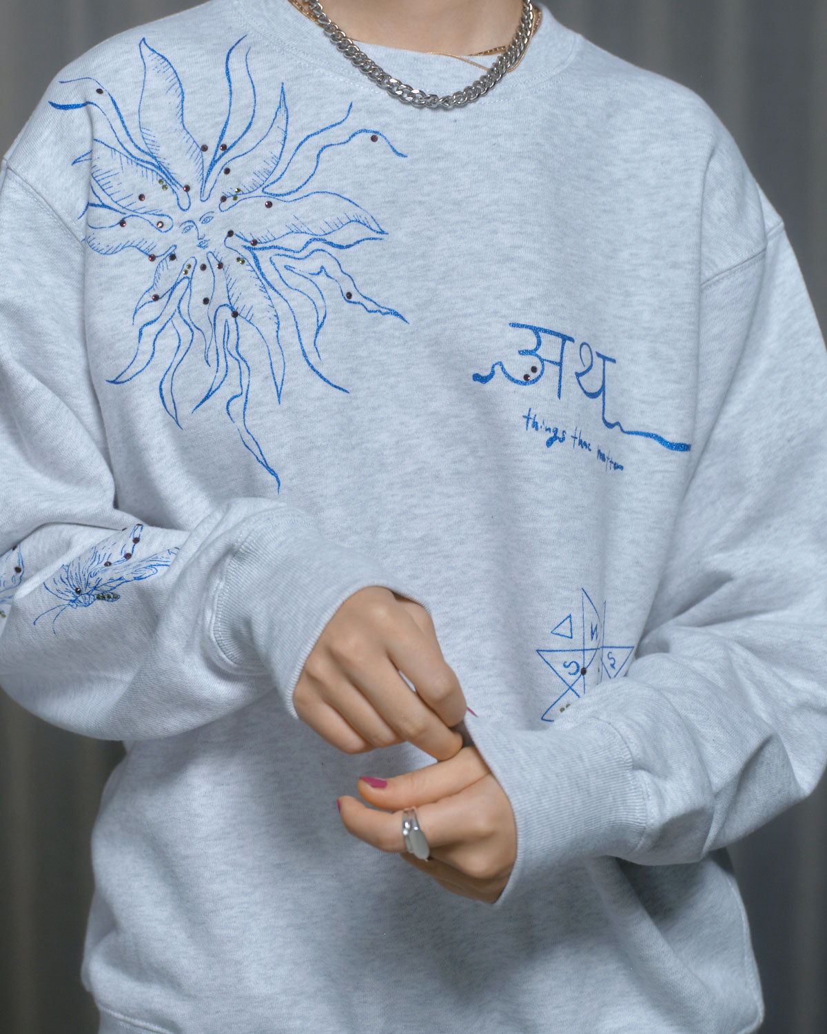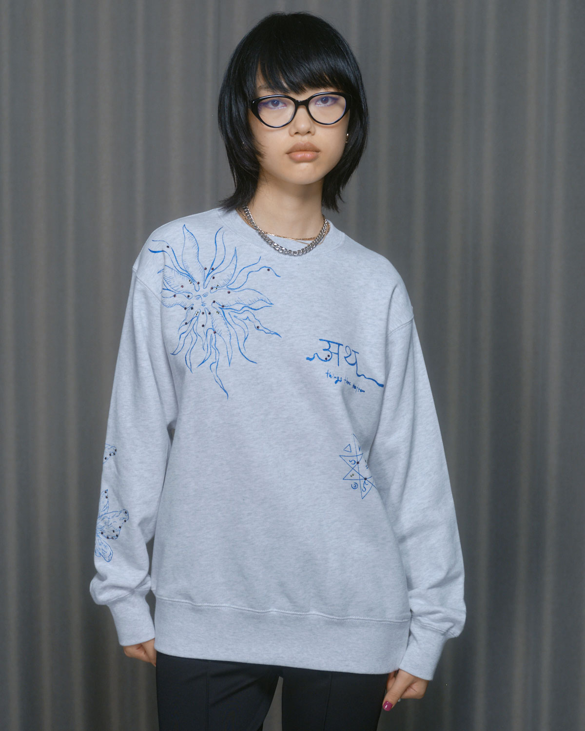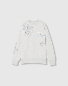 『PRE-SENT』のコンセプトをグリッタープリントとカラーラインストーンで落とし込んだ裏毛プルオーバー。