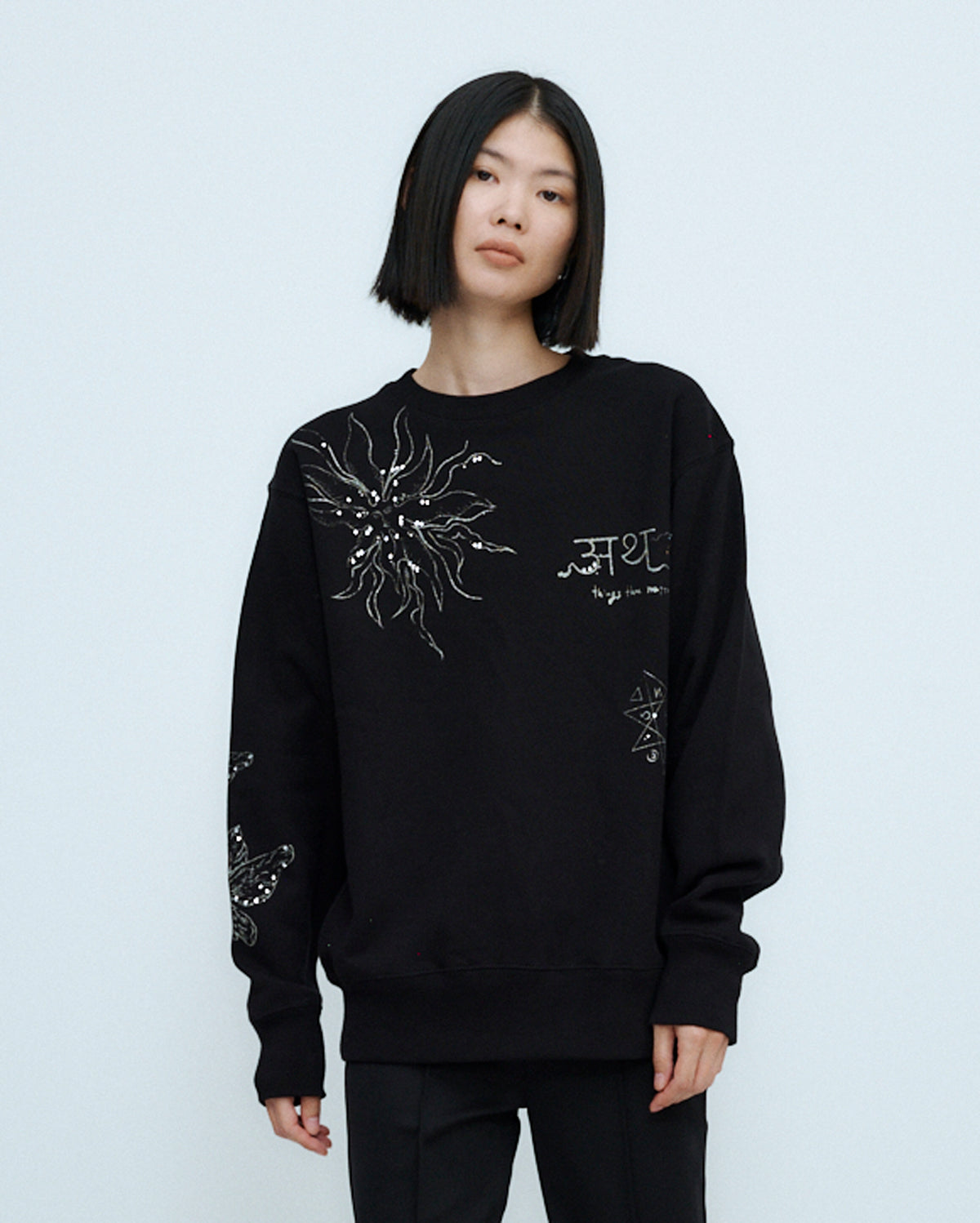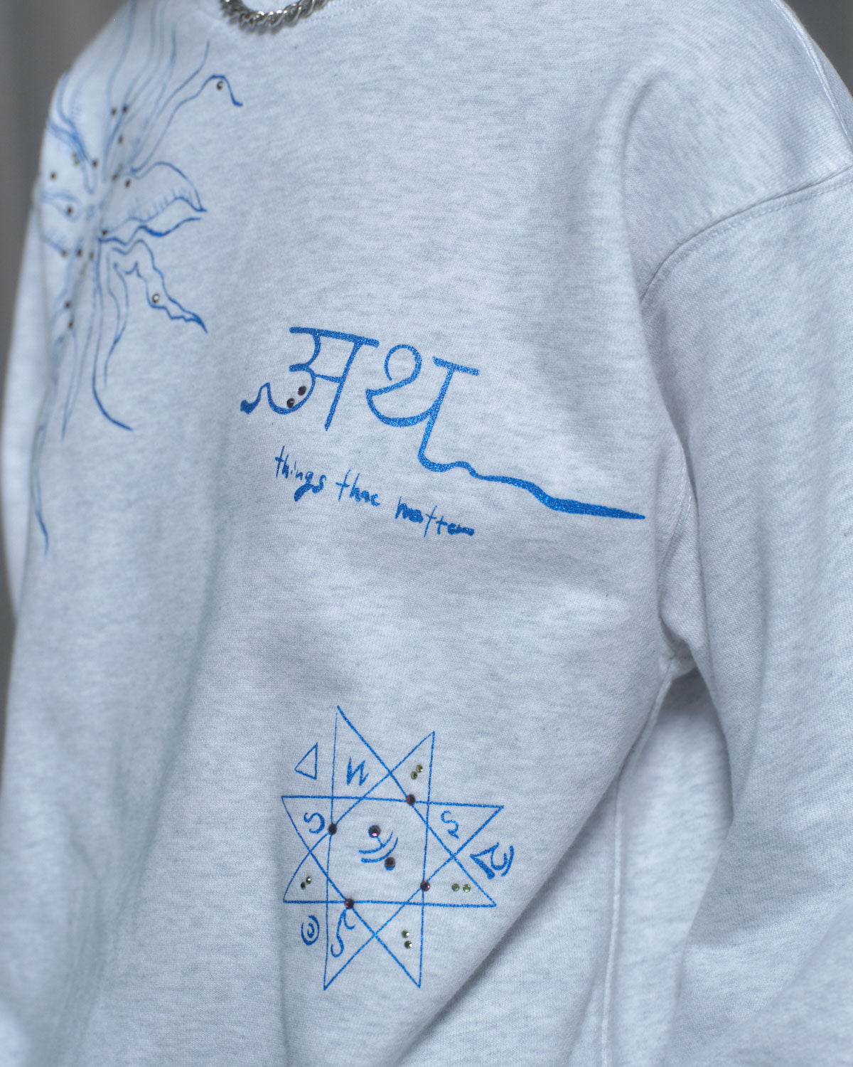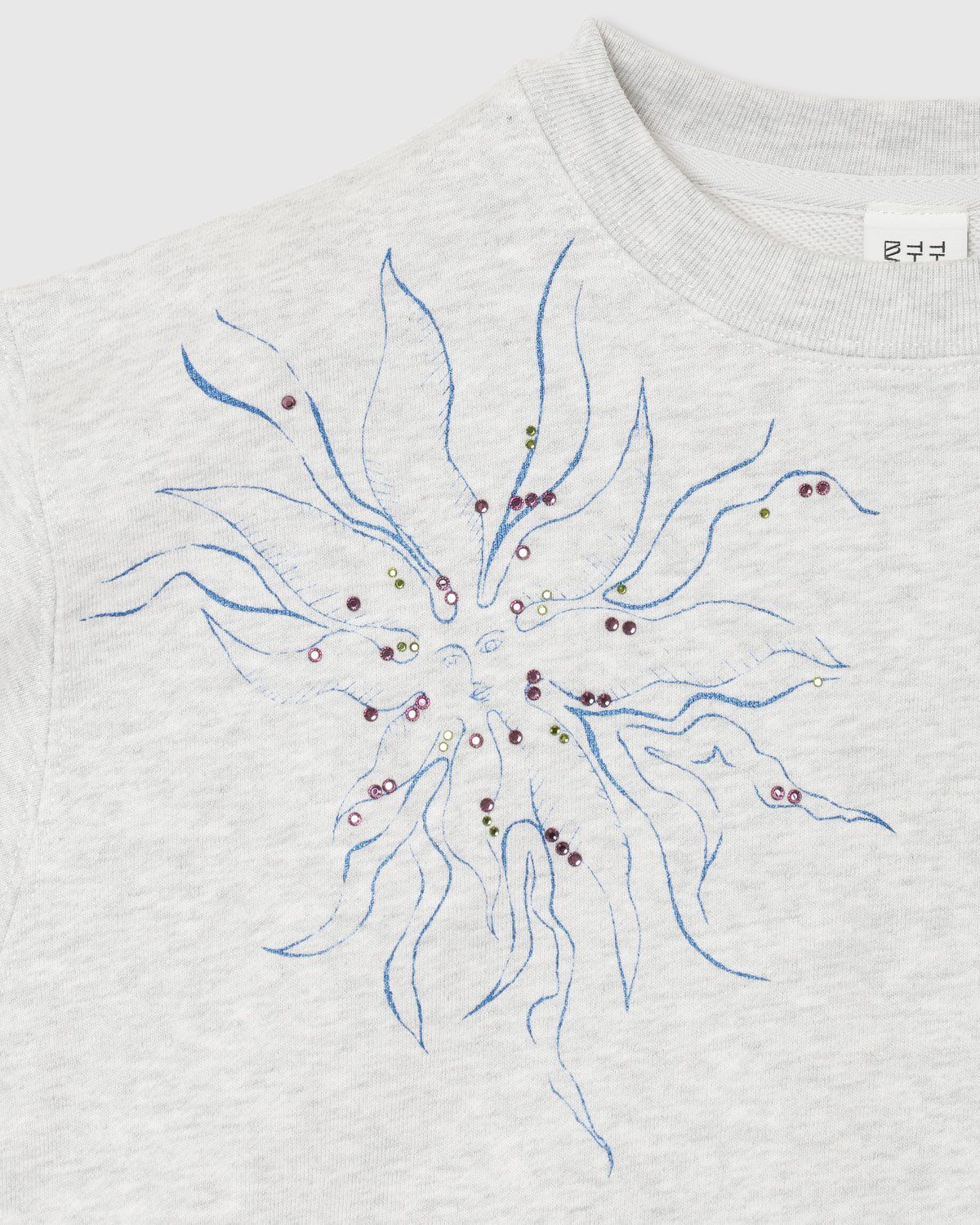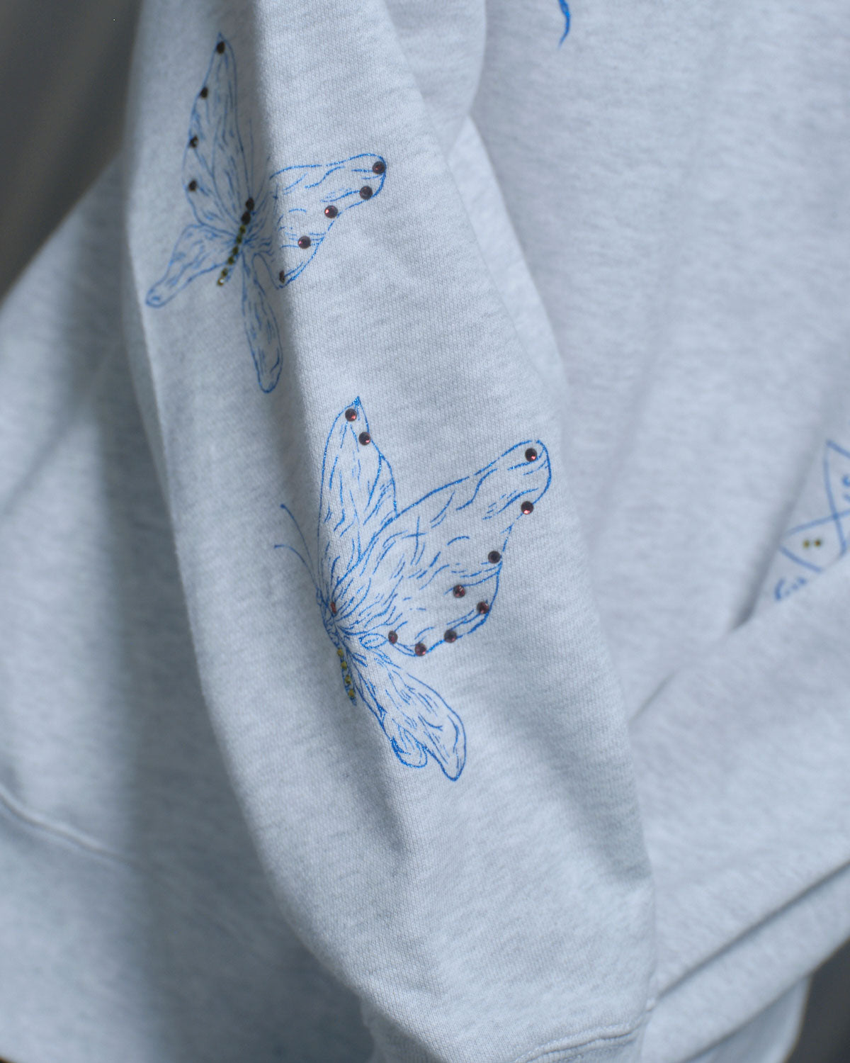 『PRE-SENT』のコンセプトをグリッタープリントとカラーラインストーンで落とし込んだ裏毛プルオーバー。