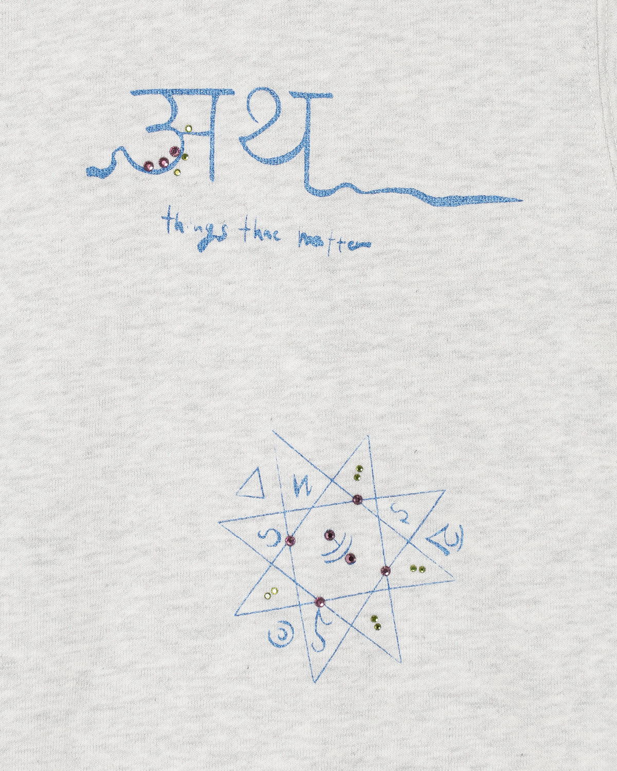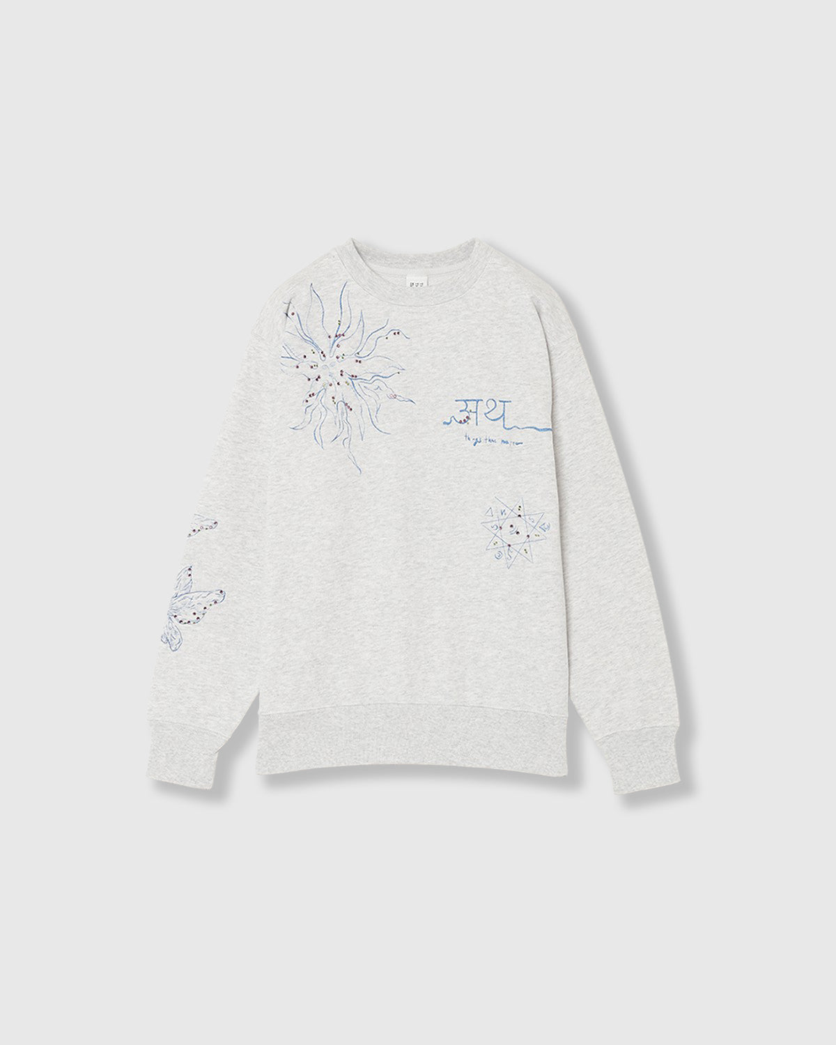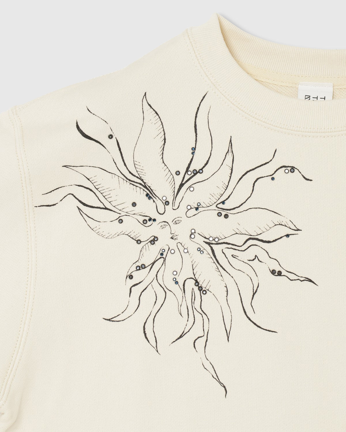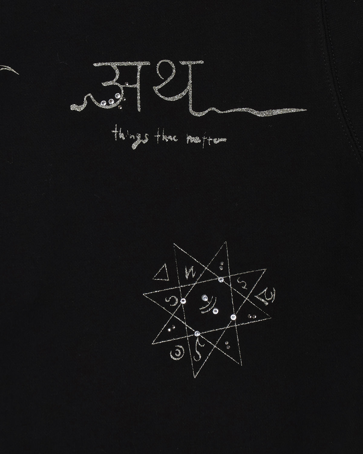 『PRE-SENT』のコンセプトをグリッタープリントとカラーラインストーンで落とし込んだ裏毛プルオーバー。