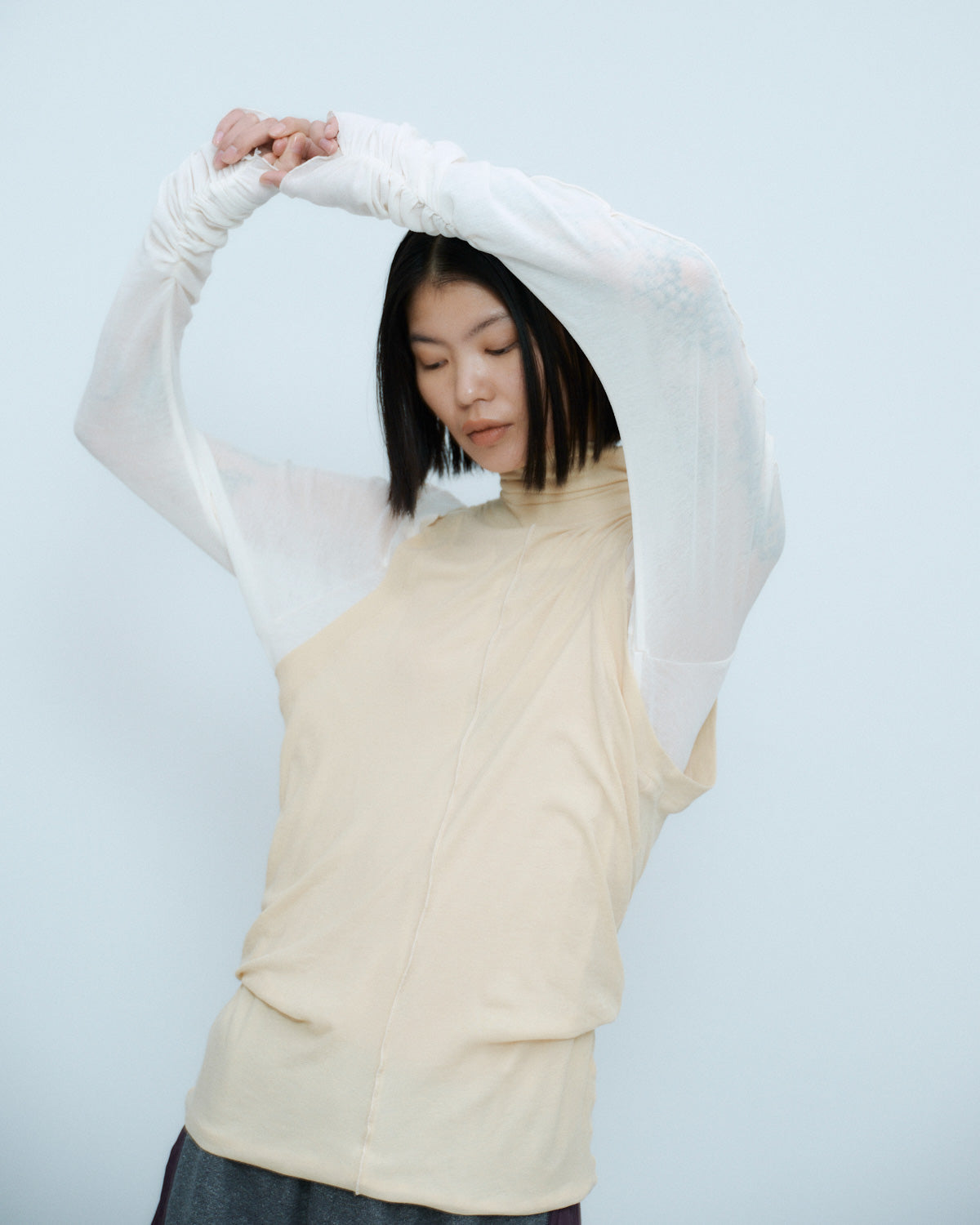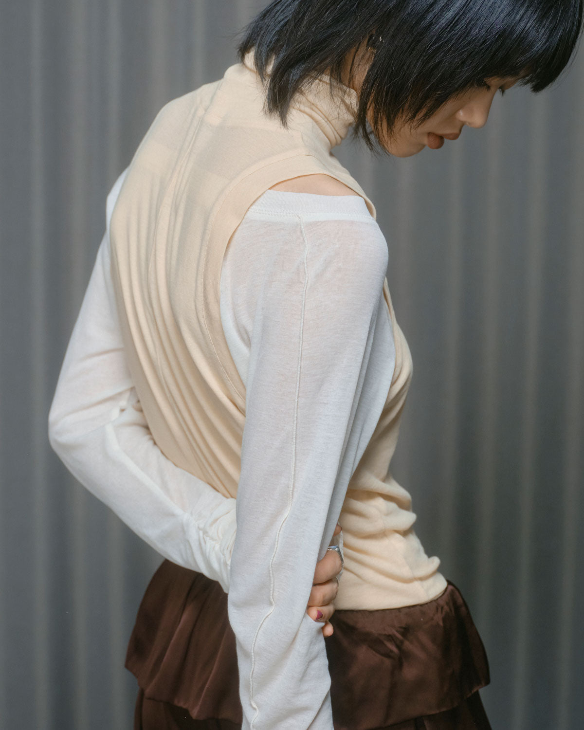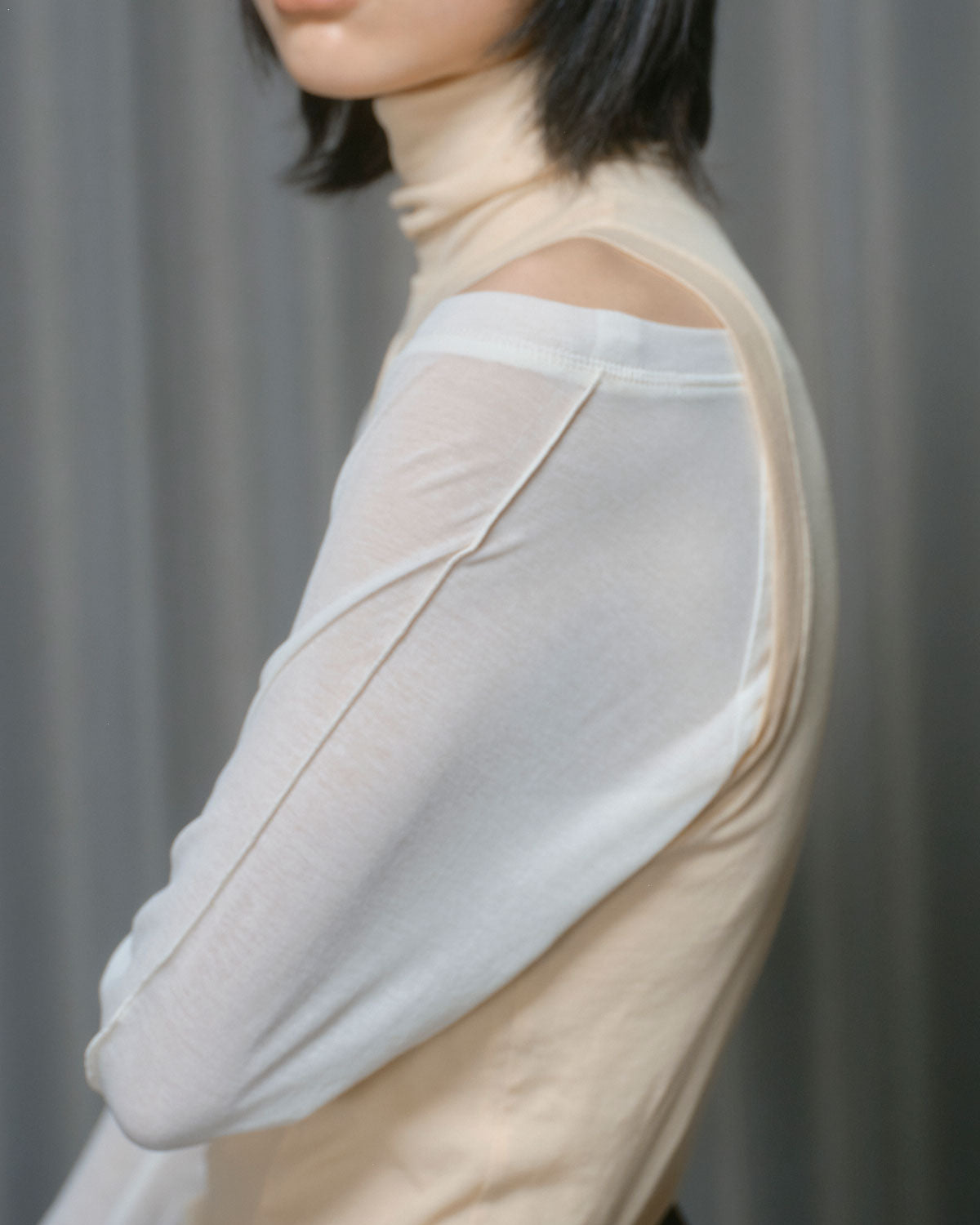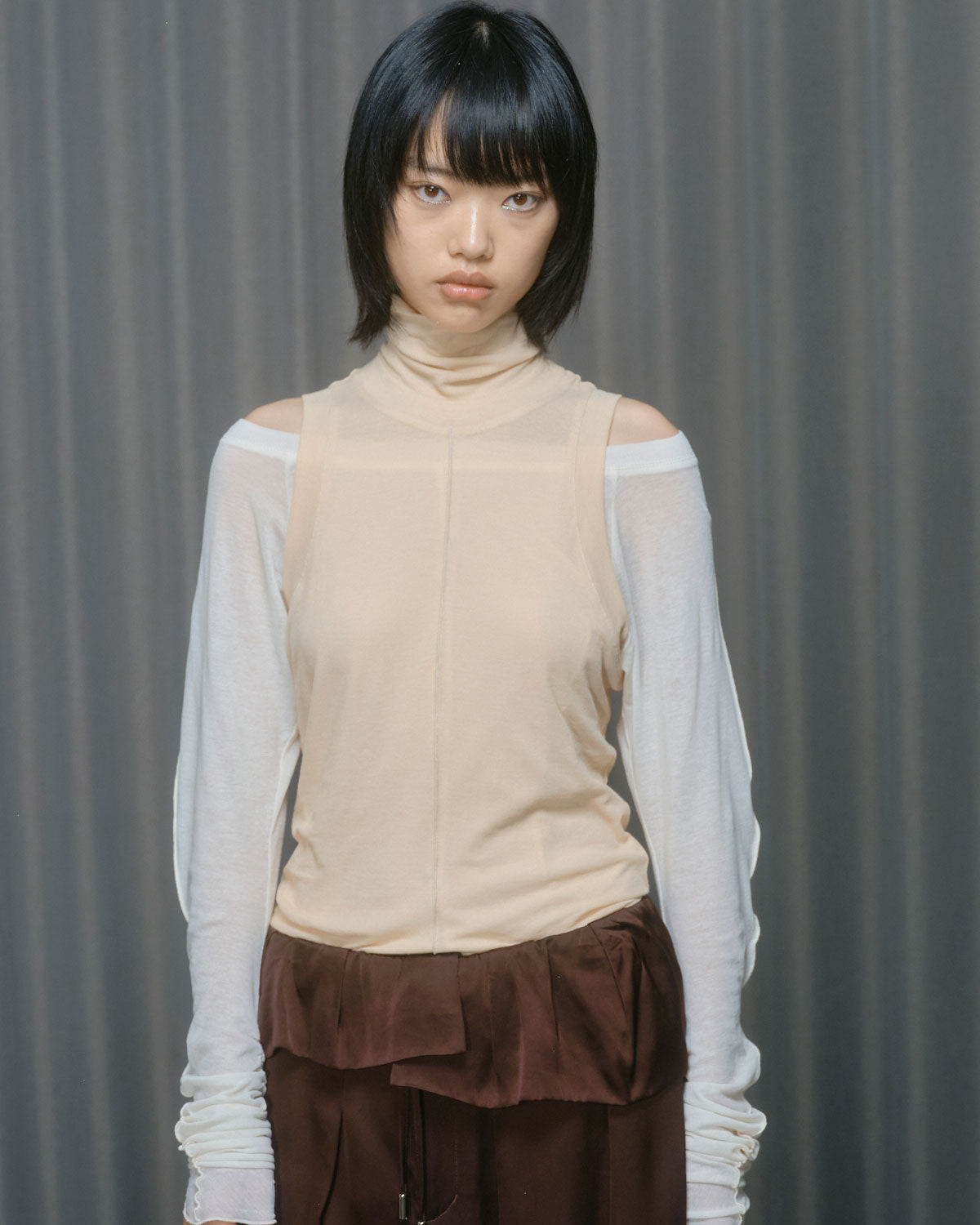 カッティングやシルエットにこだわった2つのトップスを重ねたようなデザインが、TTMらしい1枚。透け感のある素材同士が重なり合うことで生まれる、色の奥行きや肌見せのニュアンスが美しく、スタイリングに抜け感をプラスします。