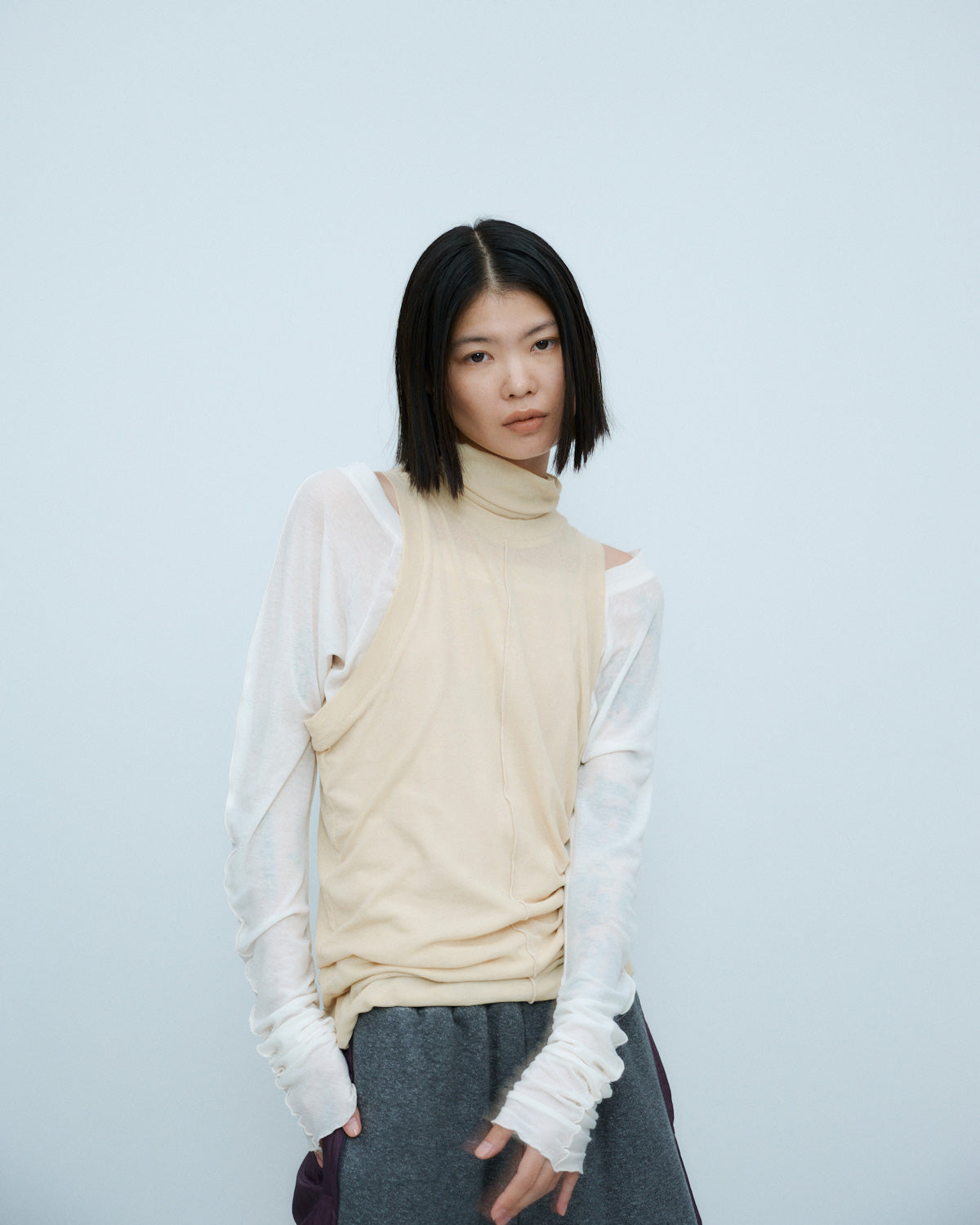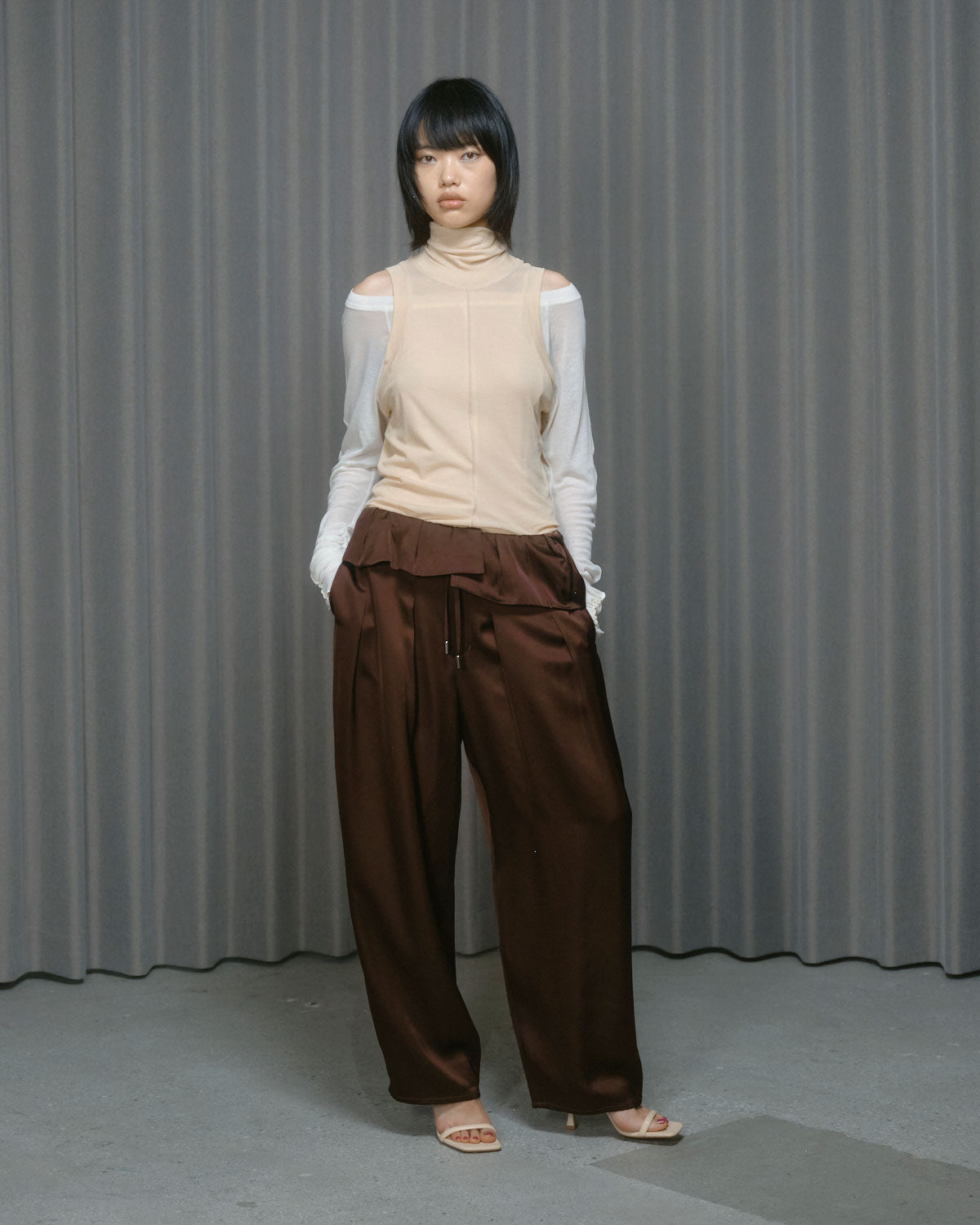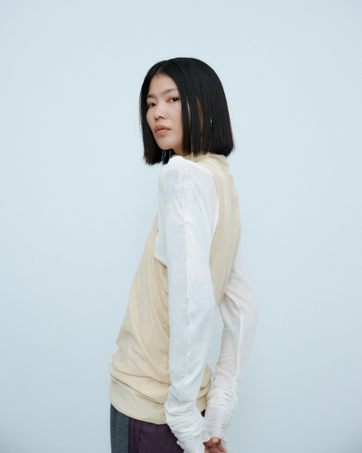 カッティングやシルエットにこだわった2つのトップスを重ねたようなデザインが、TTMらしい1枚。透け感のある素材同士が重なり合うことで生まれる、色の奥行きや肌見せのニュアンスが美しく、スタイリングに抜け感をプラスします。