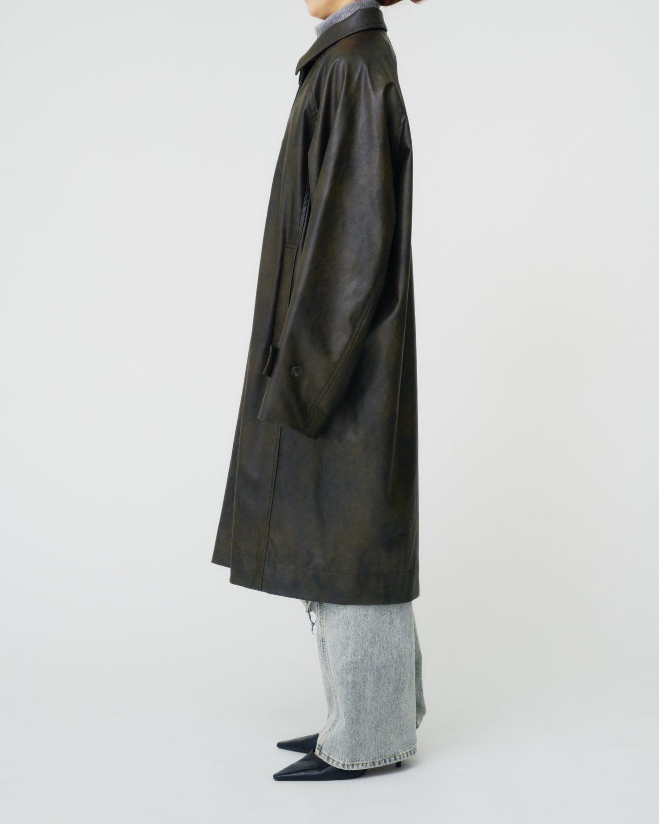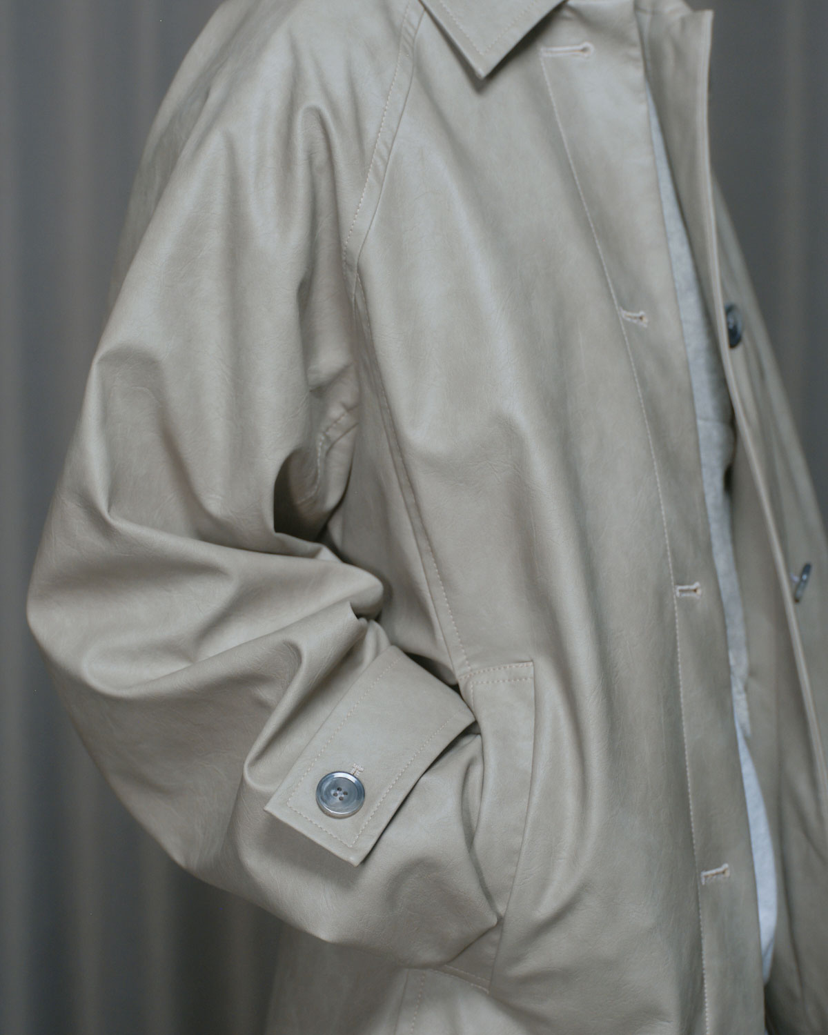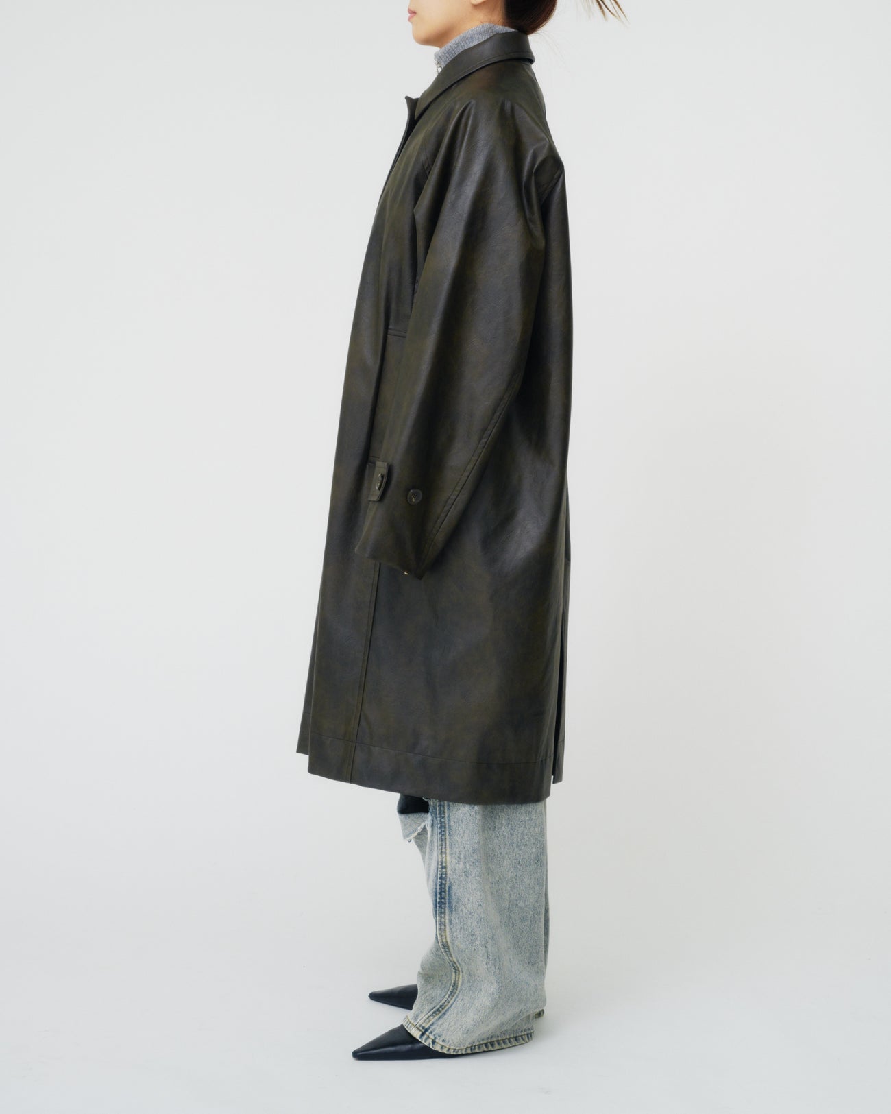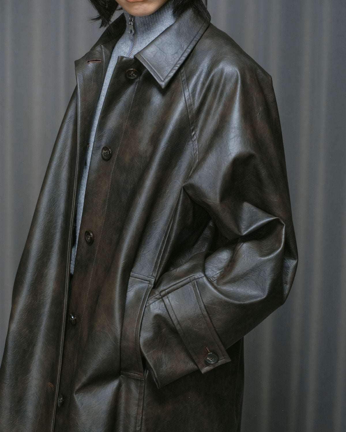 ヴィンテージライクな風合いとレイヤードスタイルを楽しめる、合成皮革のロングコート。