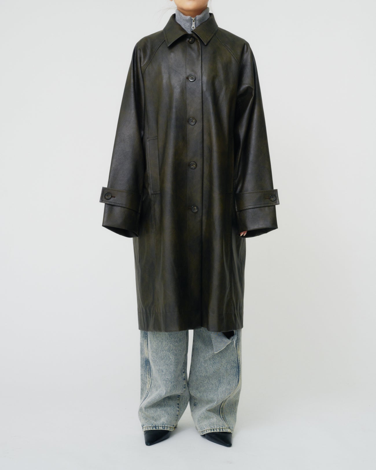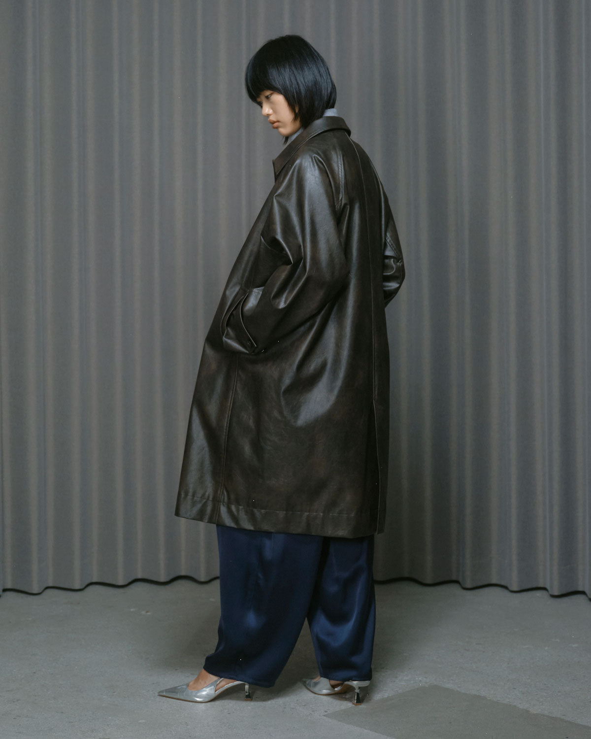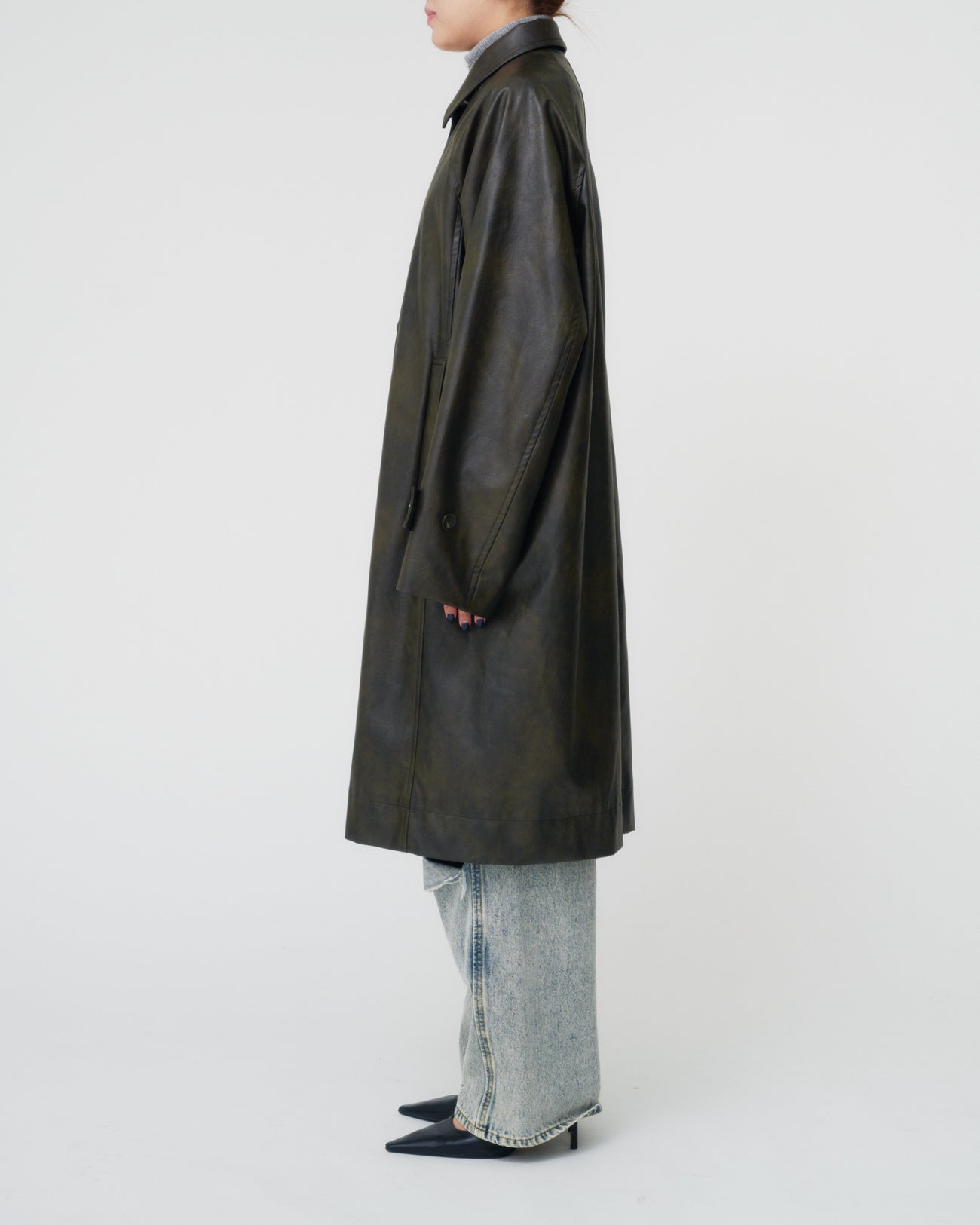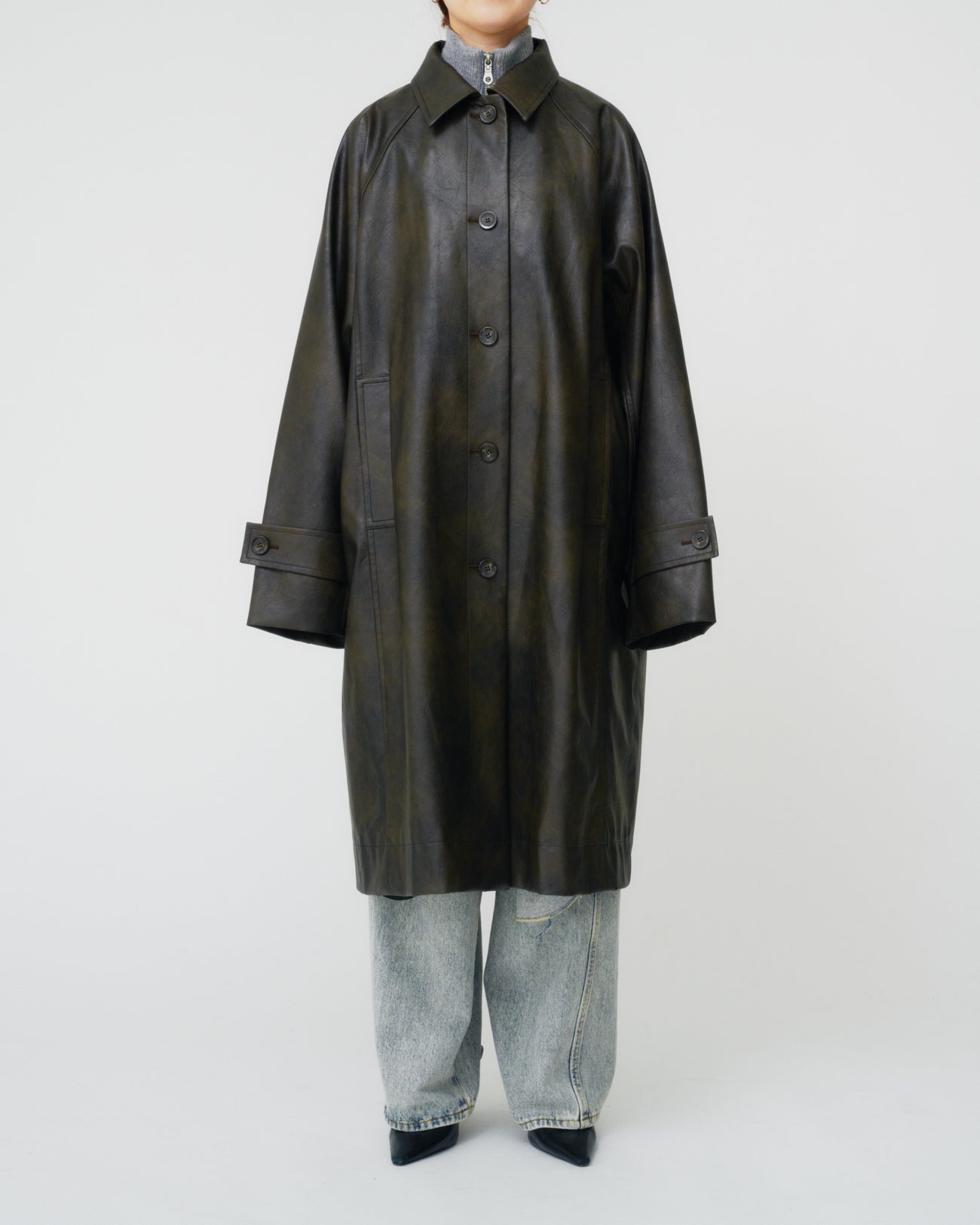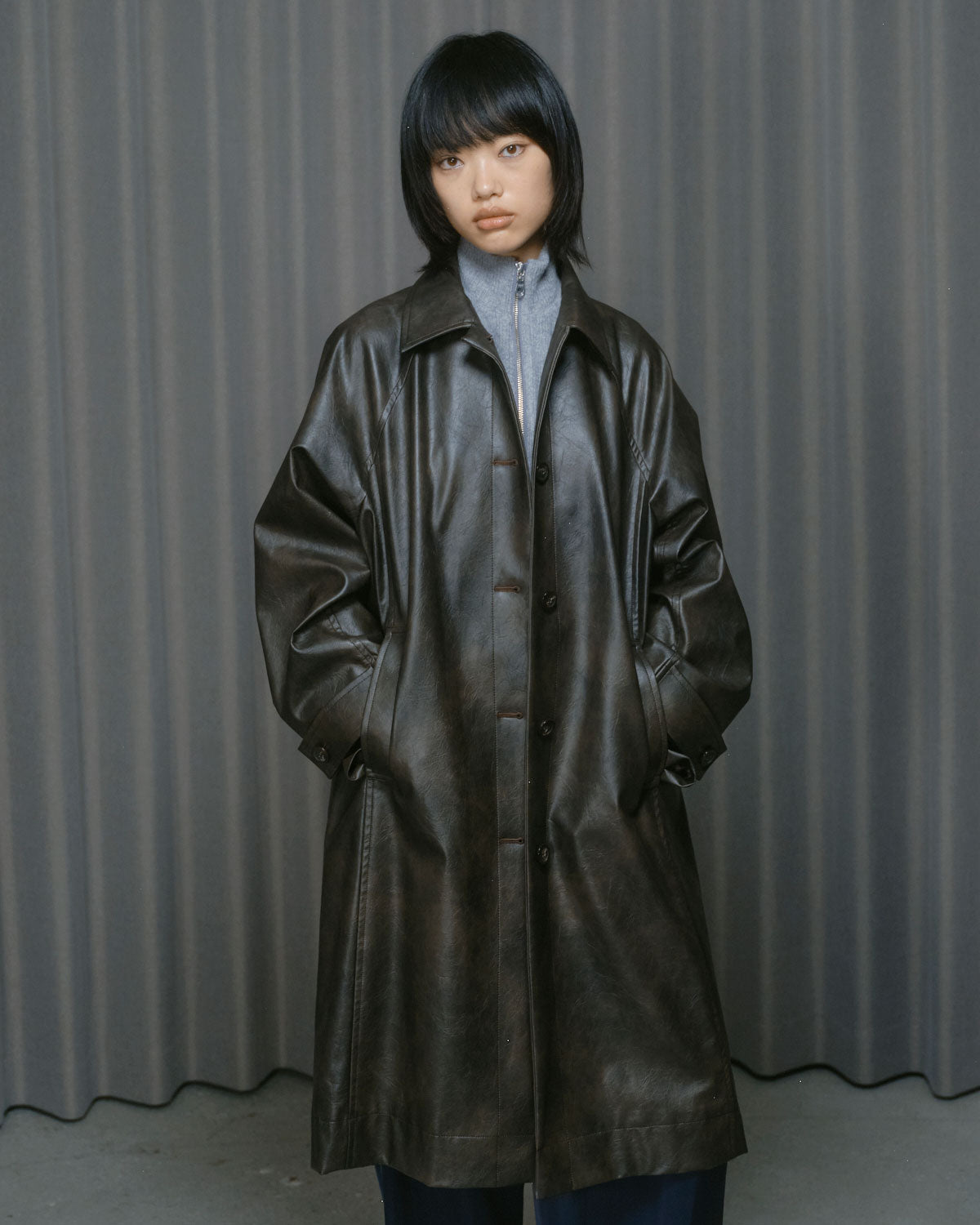 ヴィンテージライクな風合いとレイヤードスタイルを楽しめる、合成皮革のロングコート。