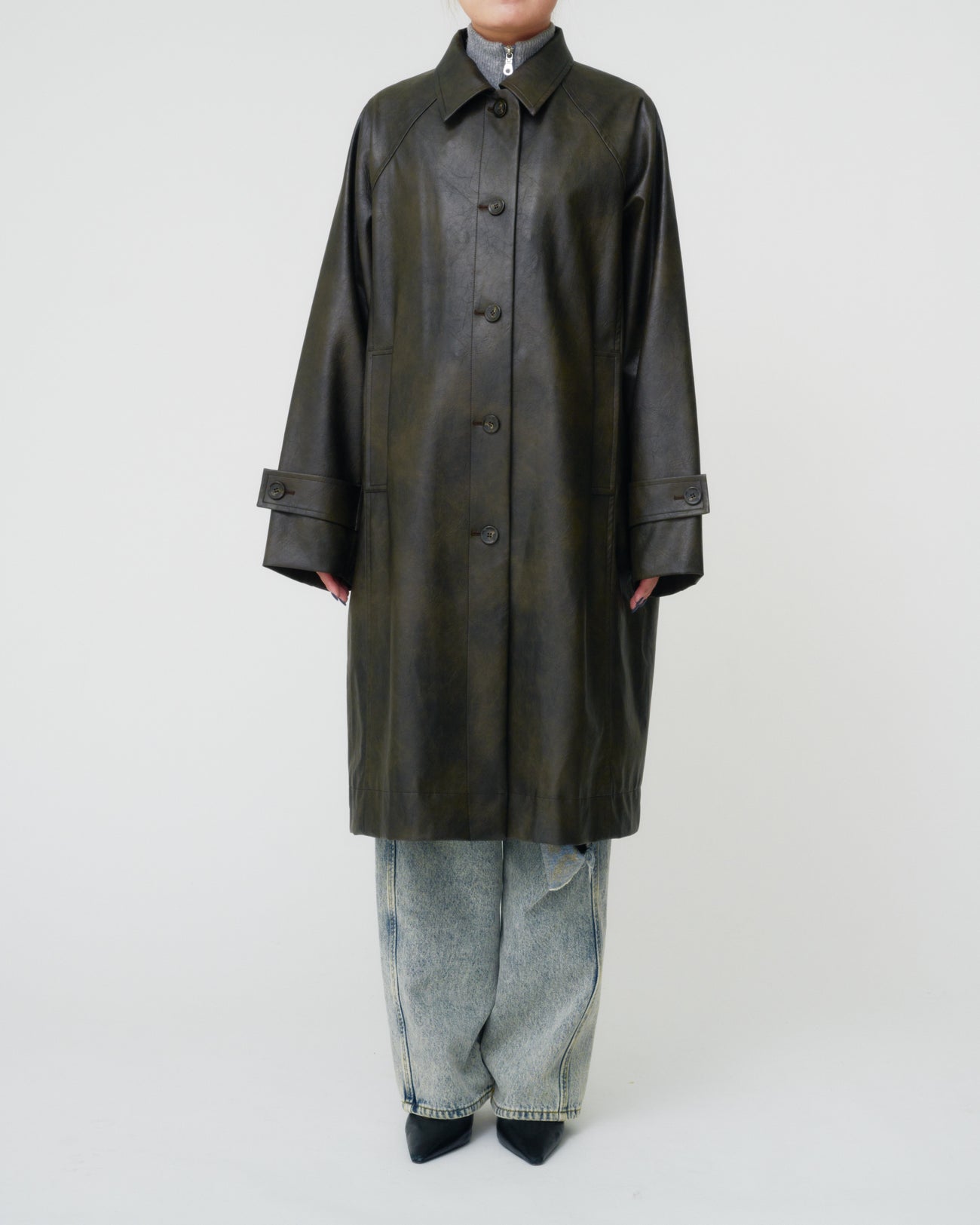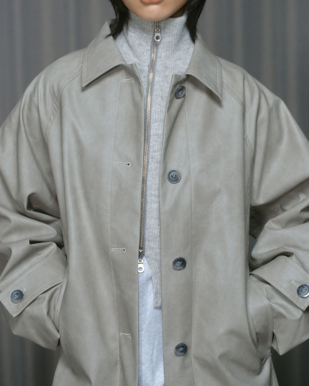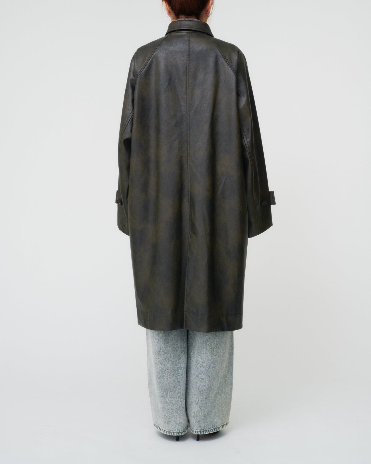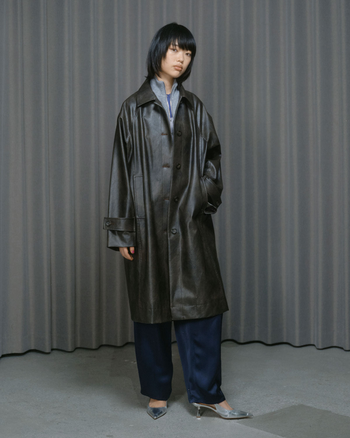 ヴィンテージライクな風合いとレイヤードスタイルを楽しめる、合成皮革のロングコート。