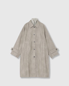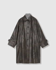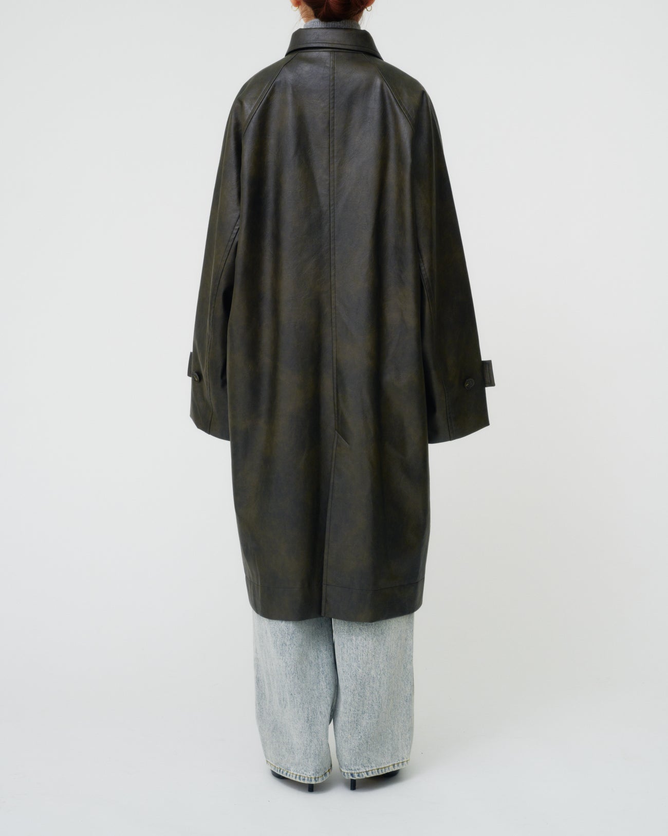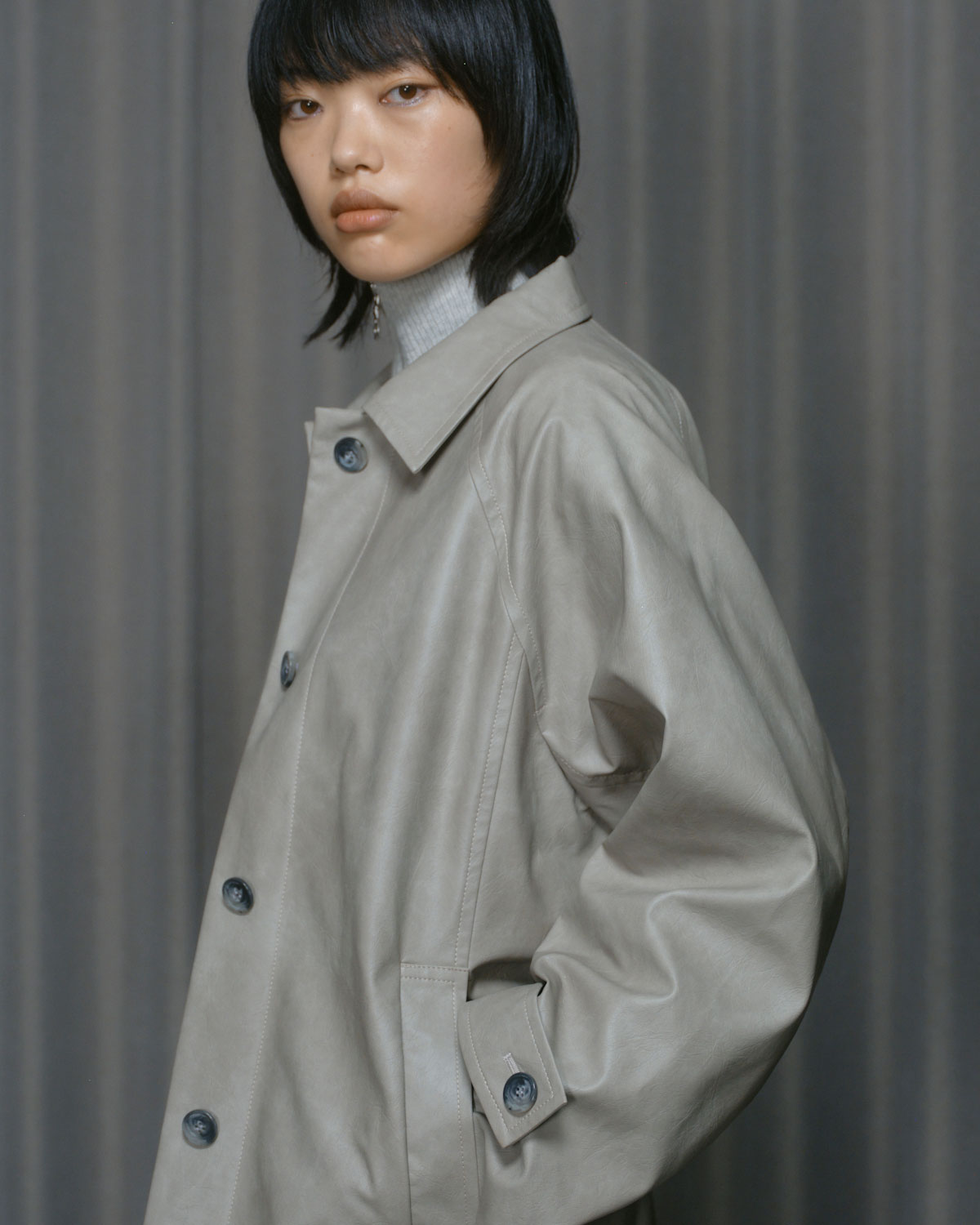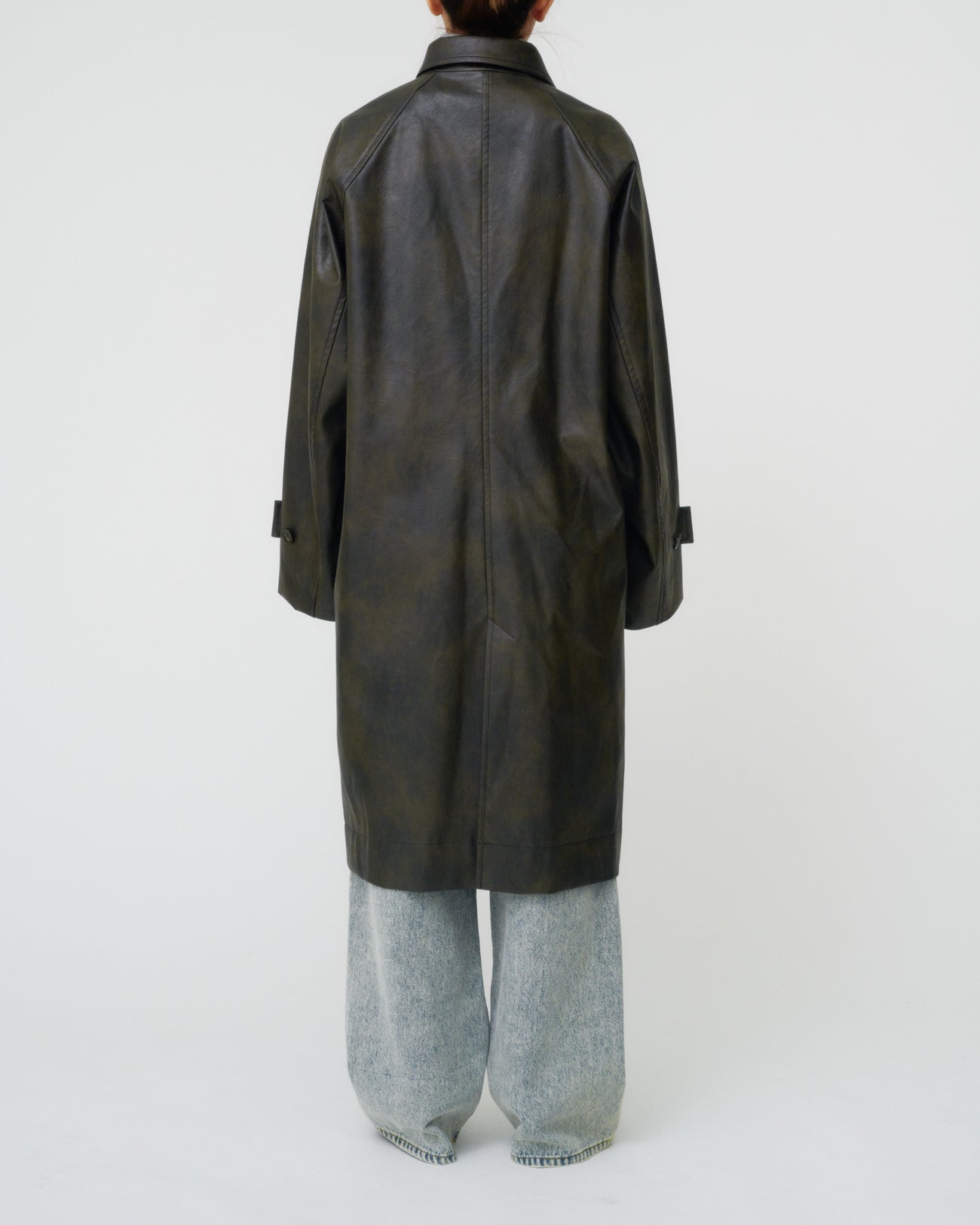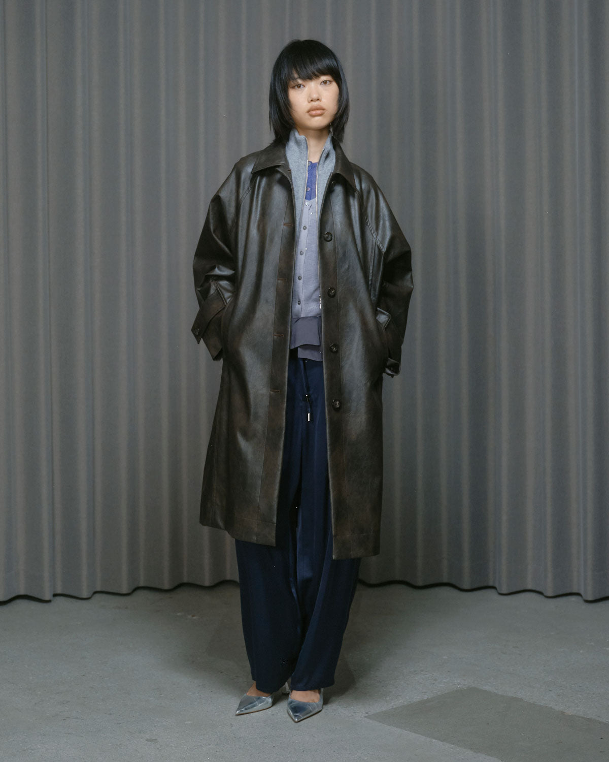 ヴィンテージライクな風合いとレイヤードスタイルを楽しめる、合成皮革のロングコート。