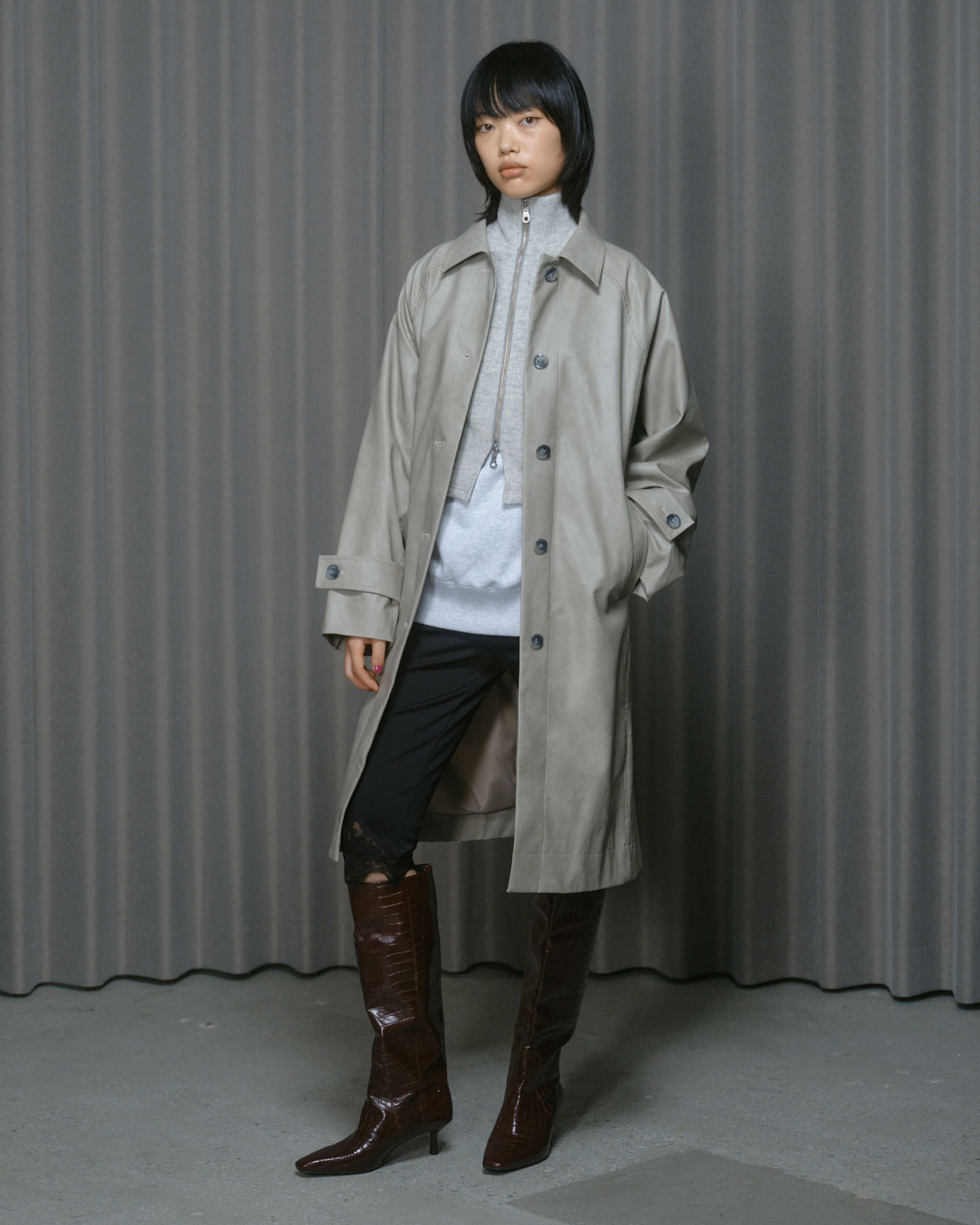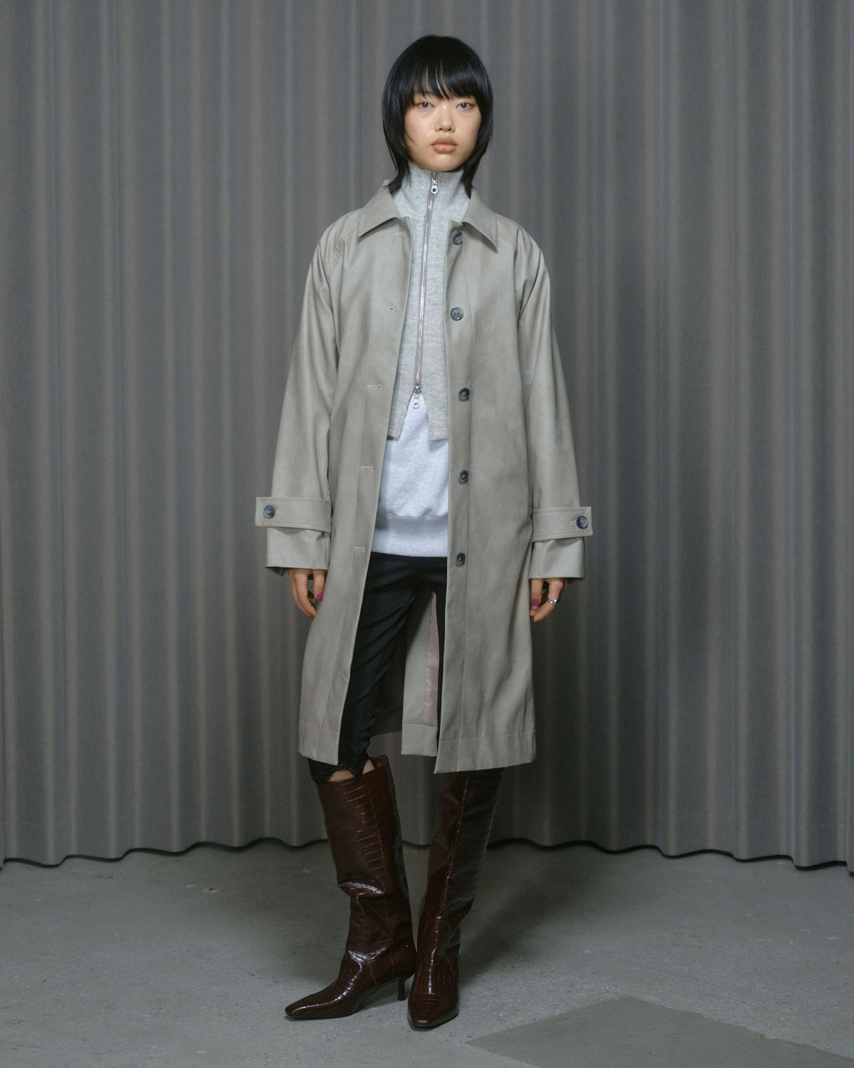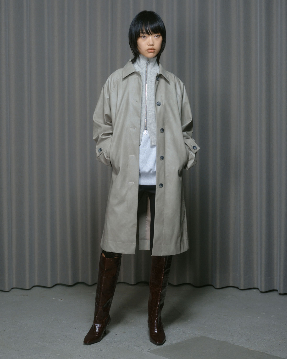 独特な質感を活かしたミニマルなシルエットに、取り外し可能なタートルネックをセットした、ギミックの効いた一着です。