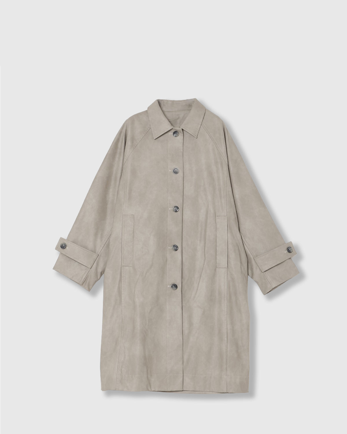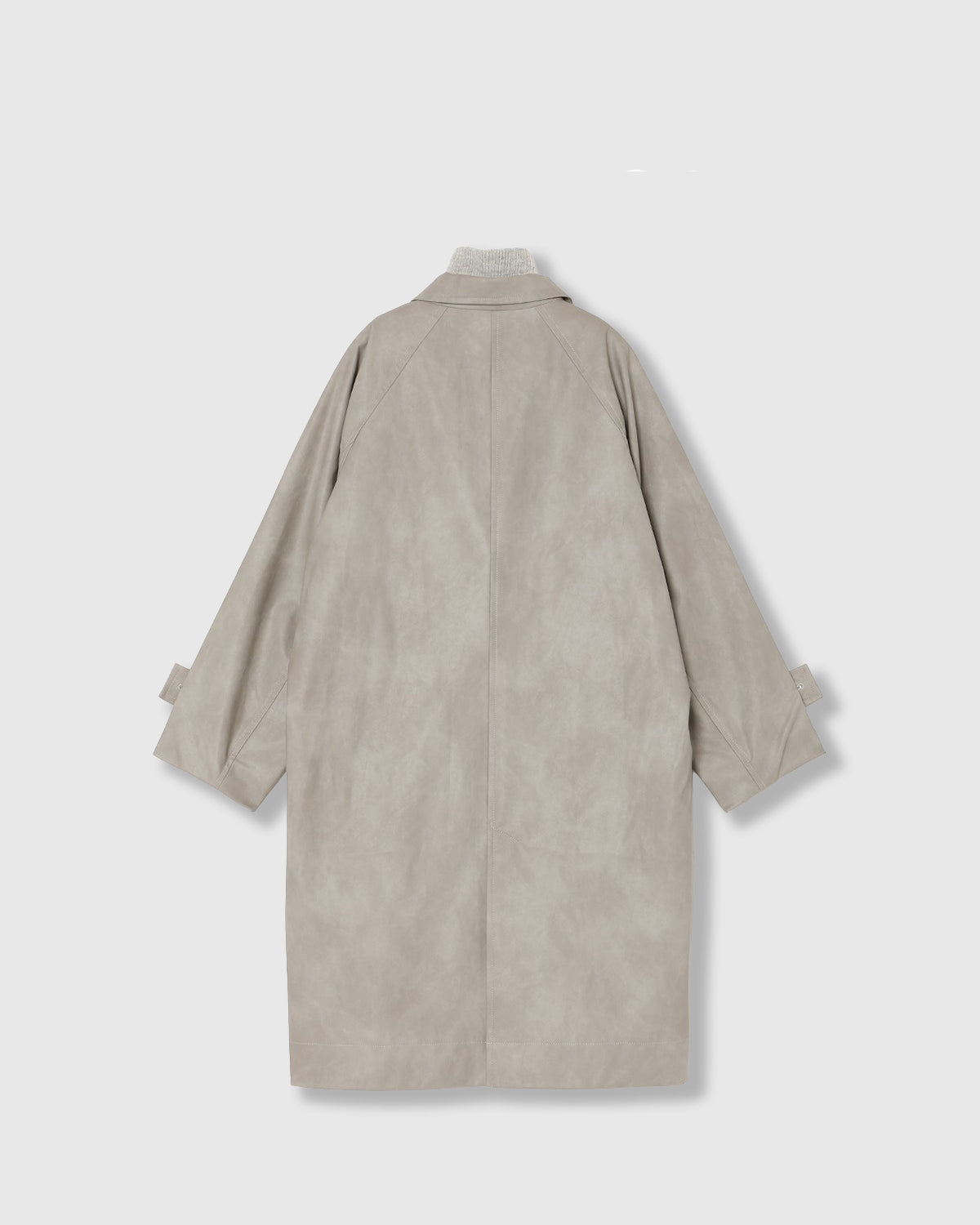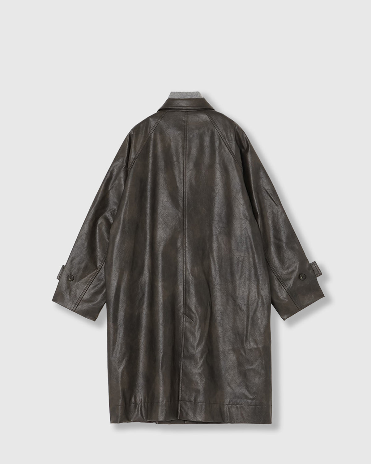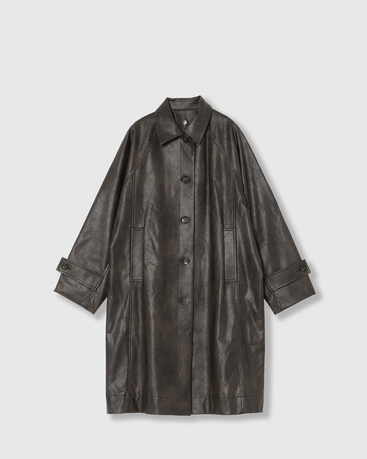 ヴィンテージライクな風合いとレイヤードスタイルを楽しめる、合成皮革のロングコート。