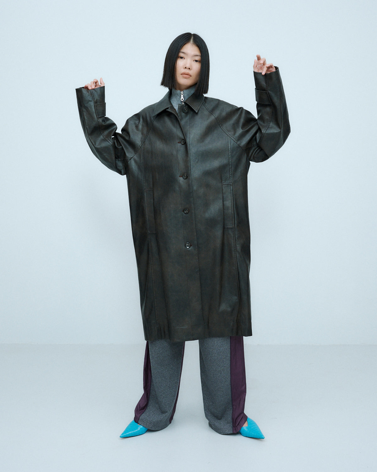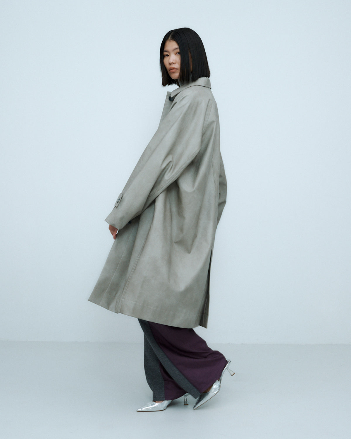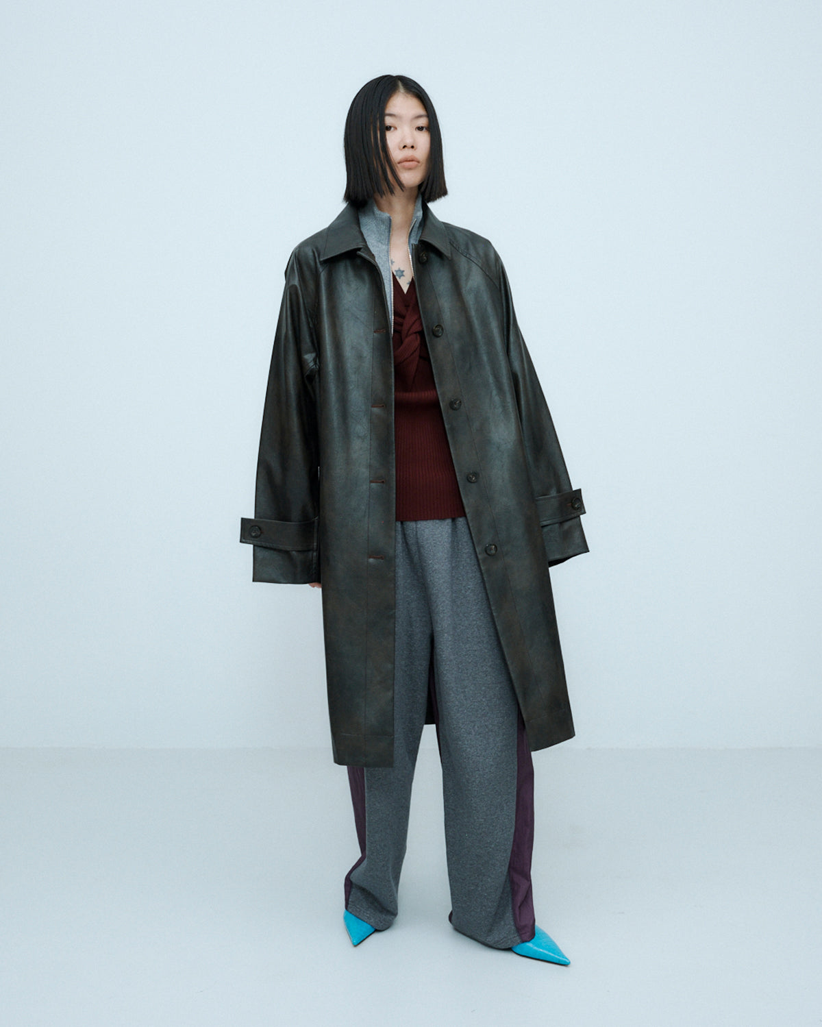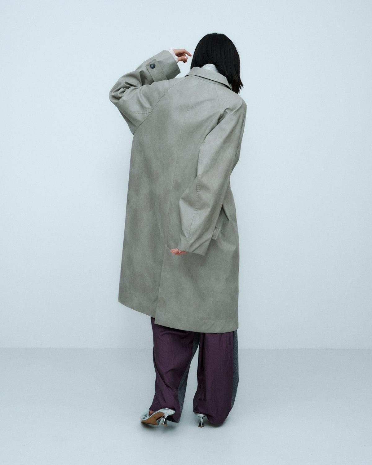 ヴィンテージライクな風合いとレイヤードスタイルを楽しめる、合成皮革のロングコート。
