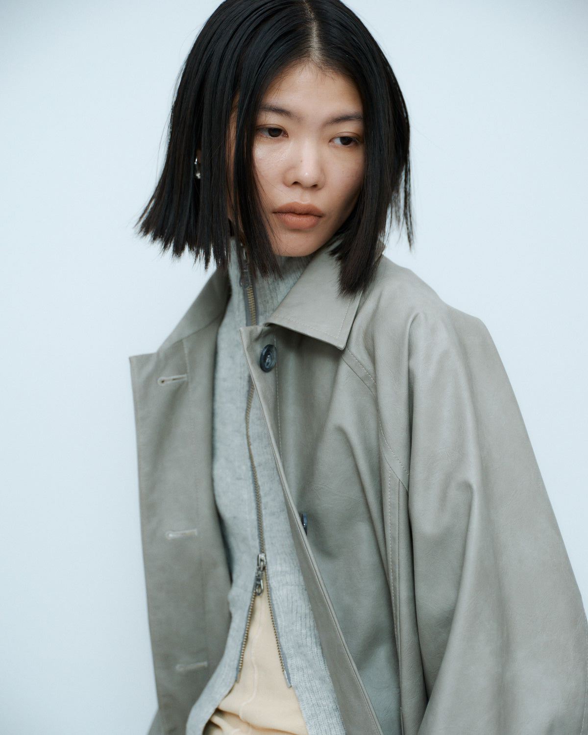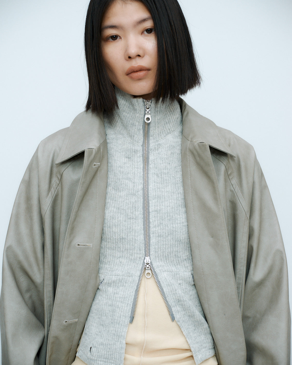 独特な質感を活かしたミニマルなシルエットに、取り外し可能なタートルネックをセットした、ギミックの効いた一着です。