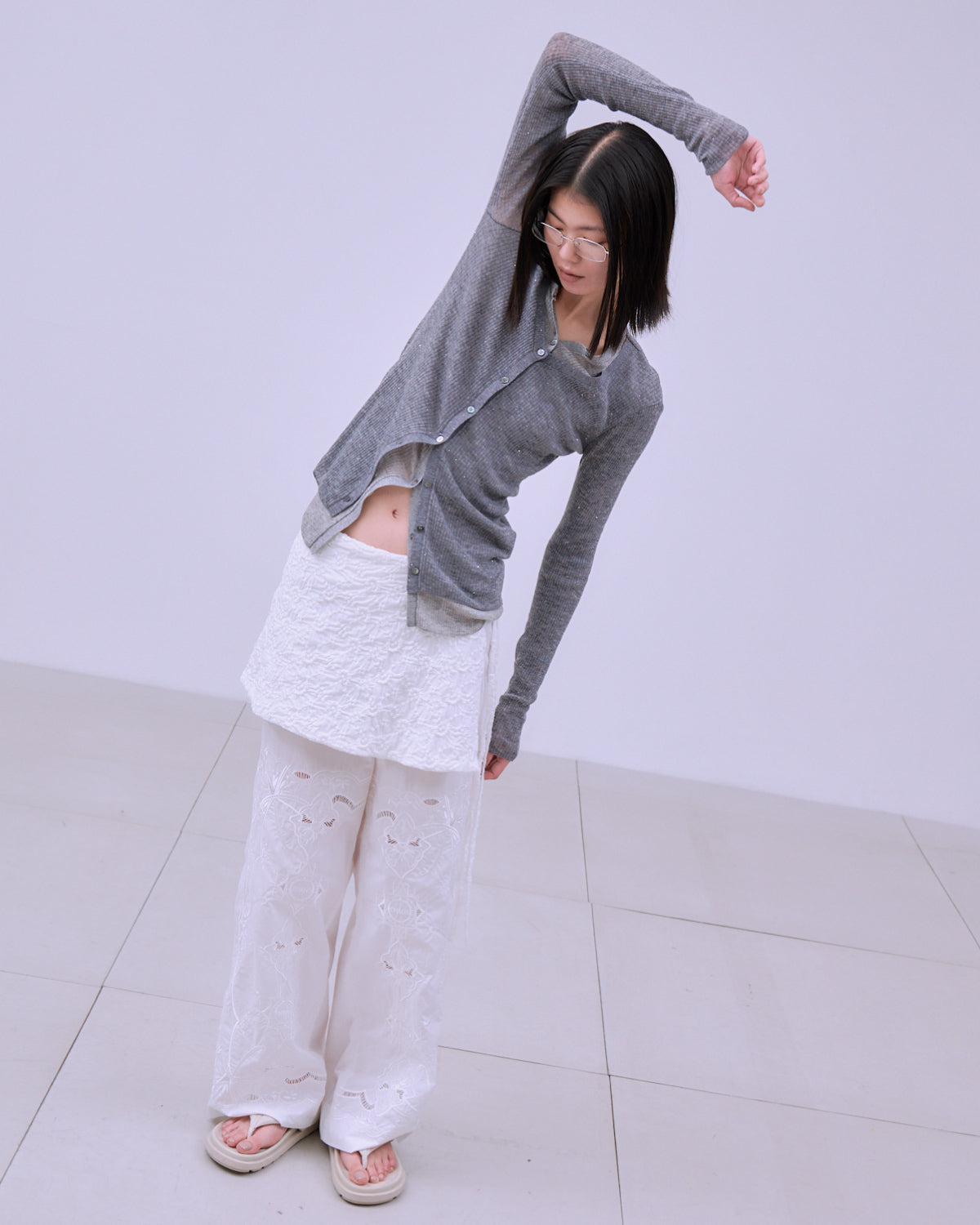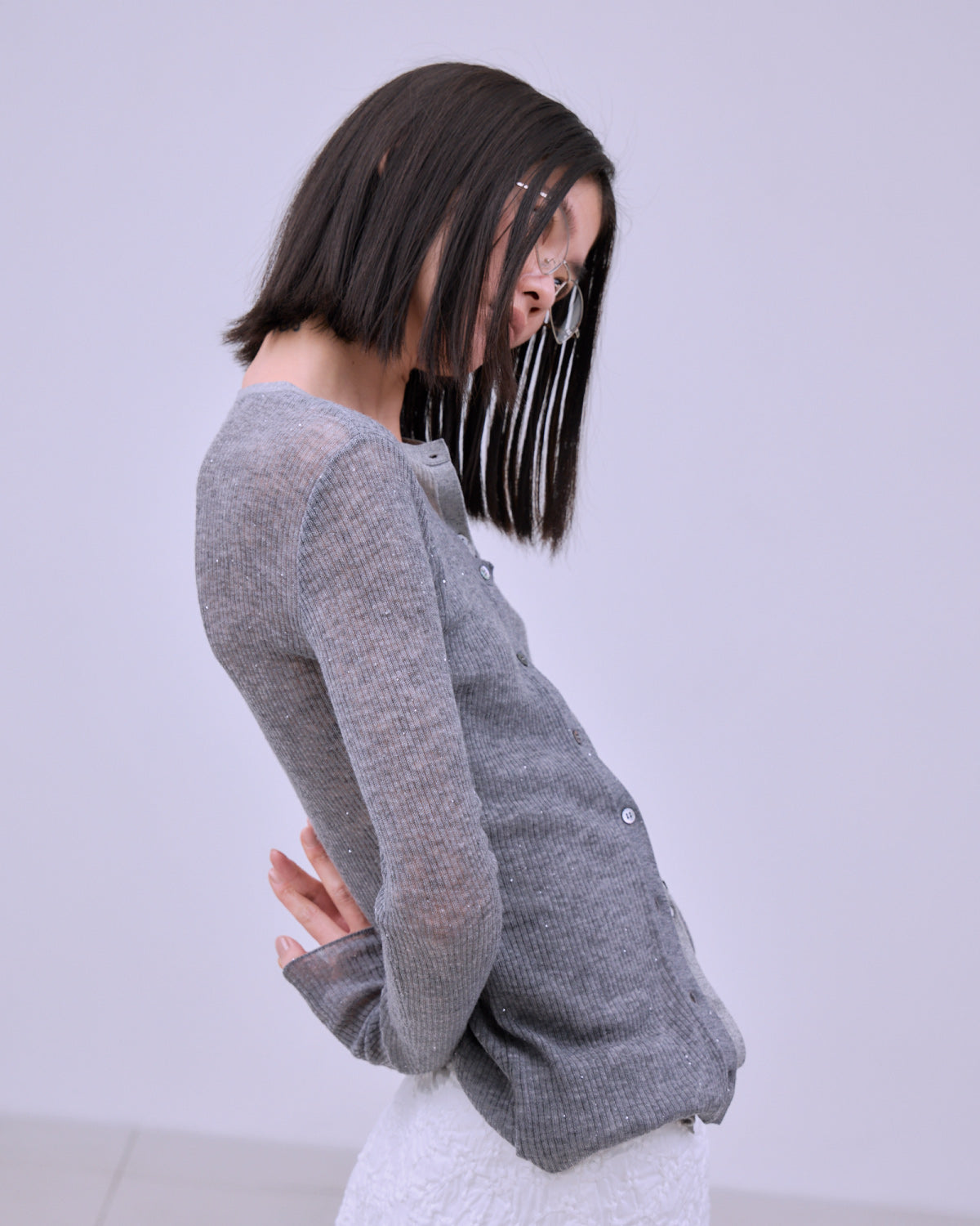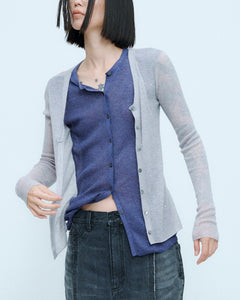 レイヤード風のシアーカーディガン。 前身頃は二重仕立て、後身頃は透け感のある一枚仕立てで、繊細さを感じられるデザインです。