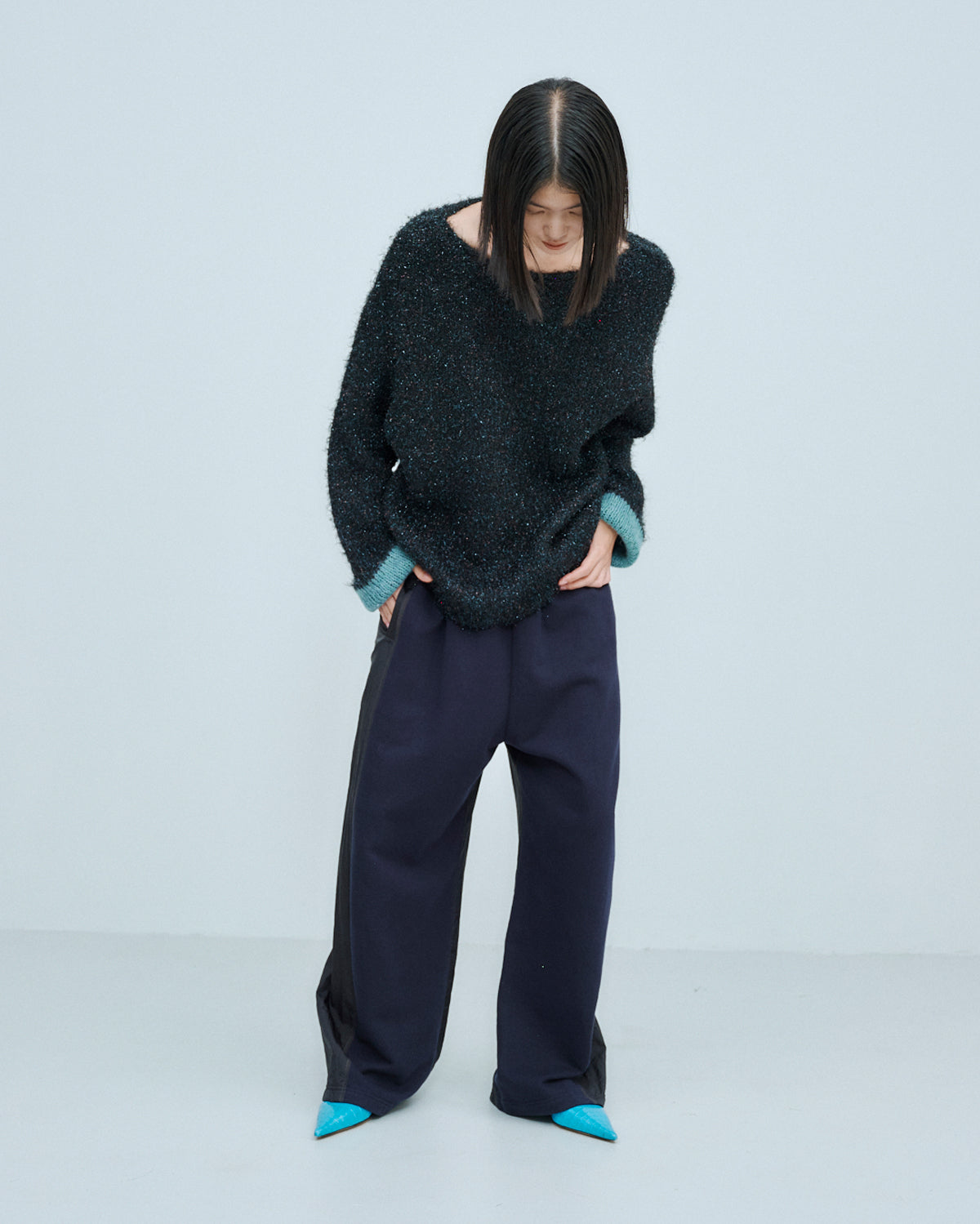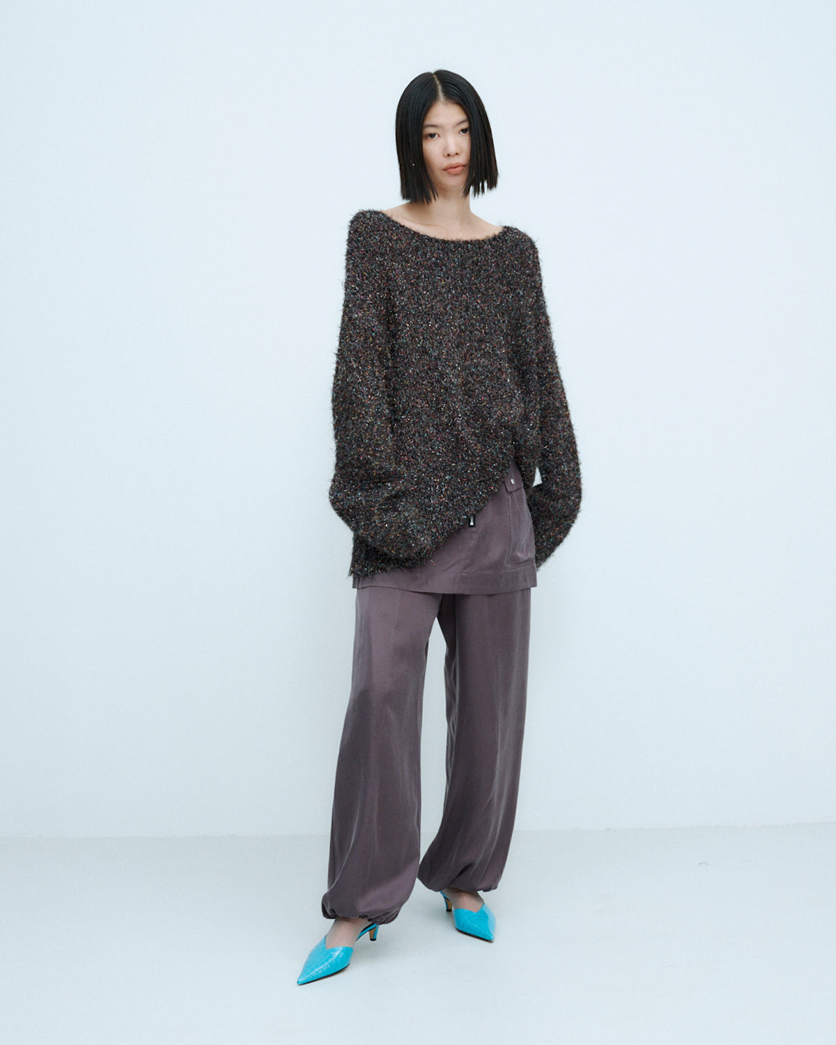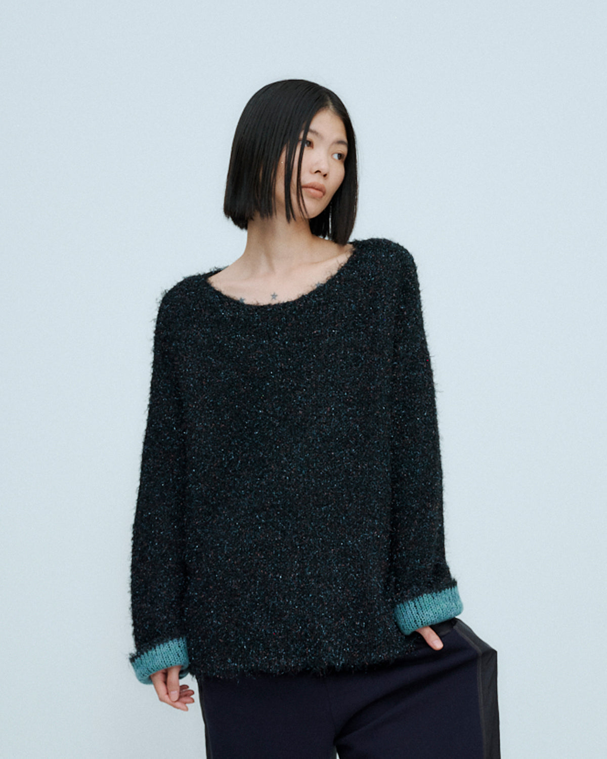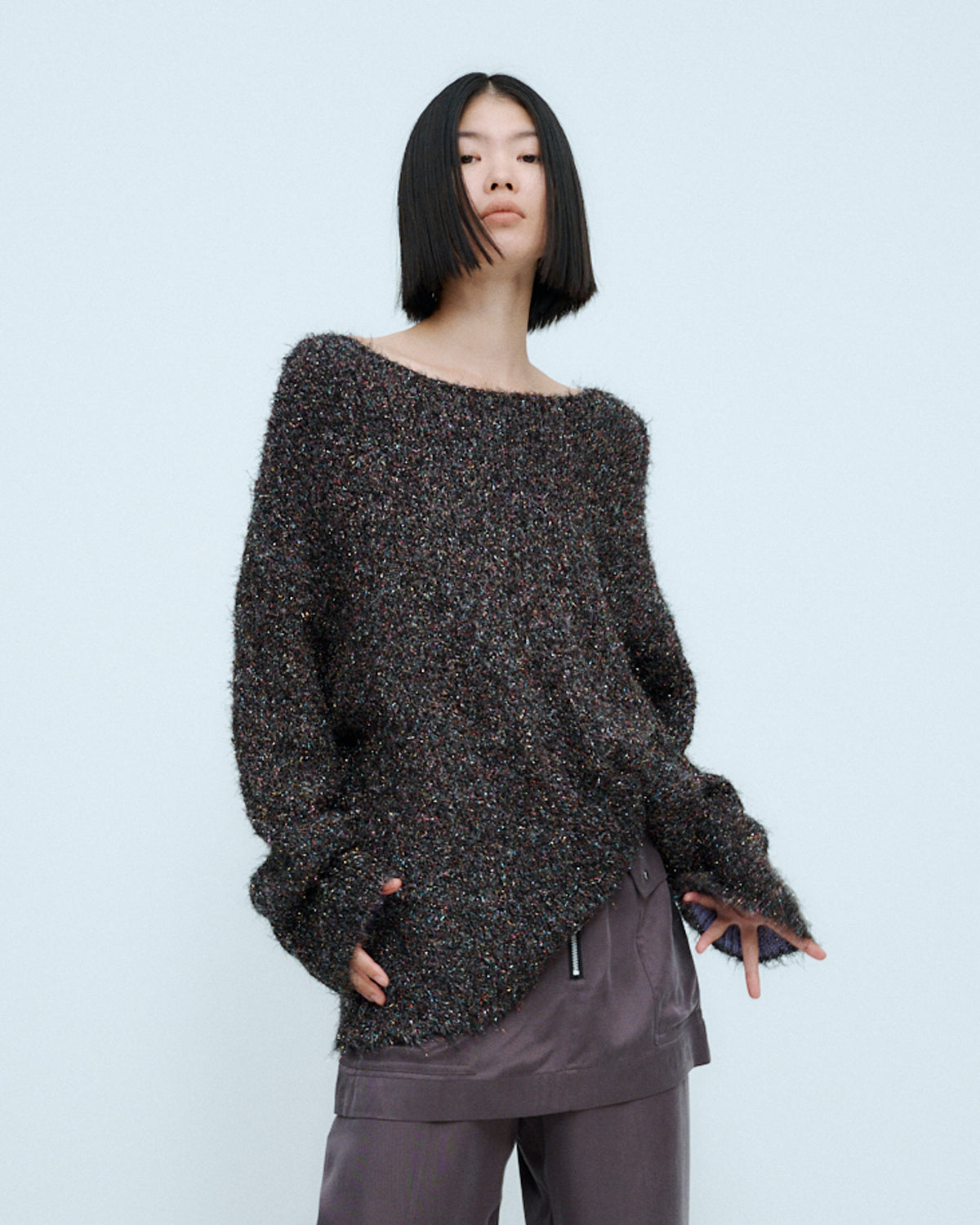 ラメファーがしっかりときらめく、ブランドらしい存在感のあるニットプルオーバー。