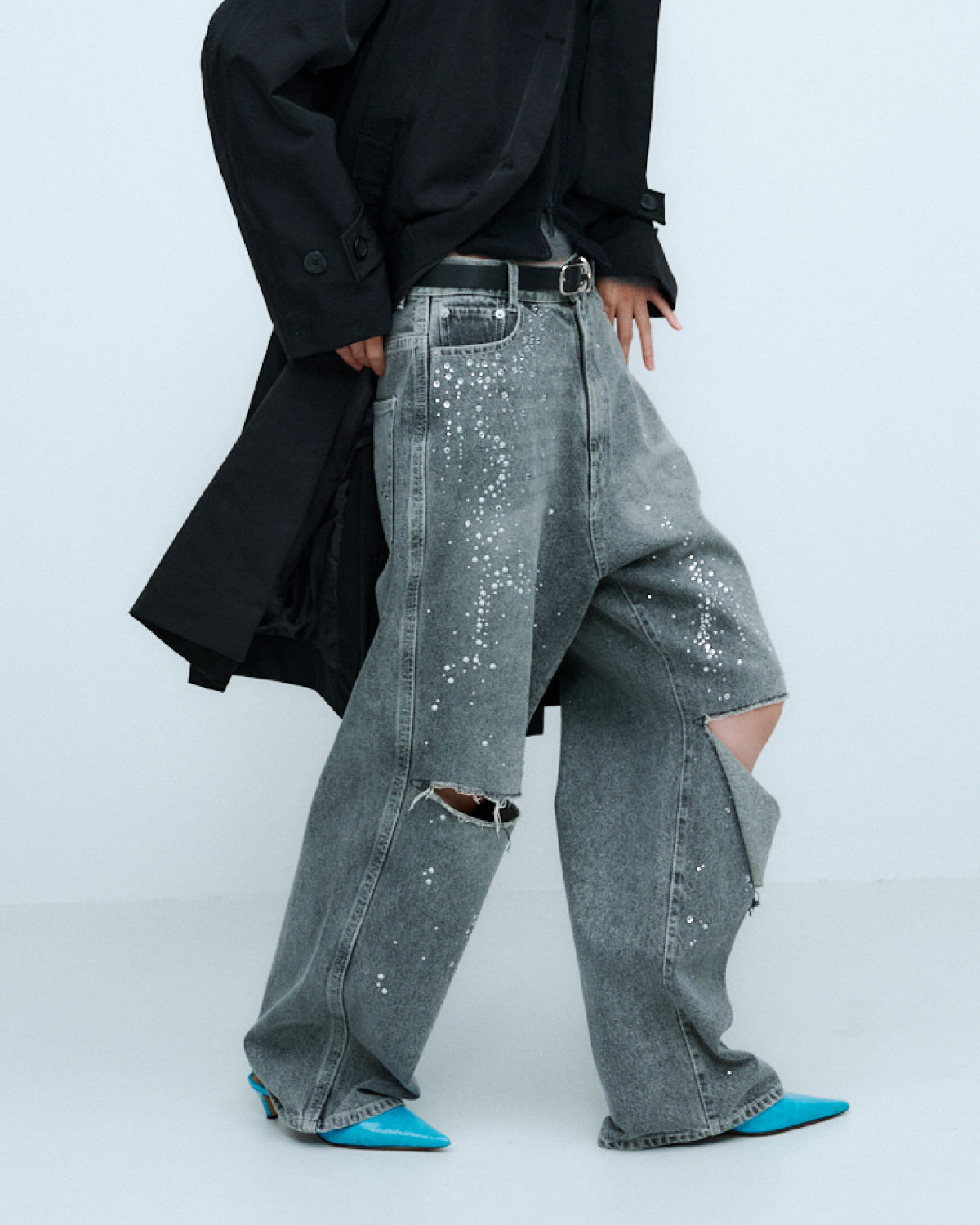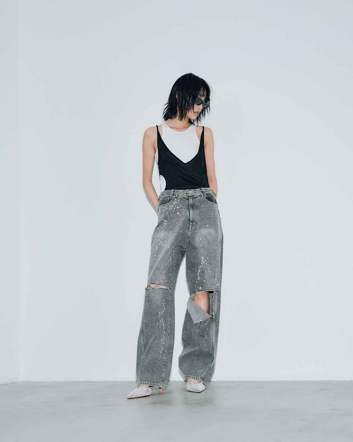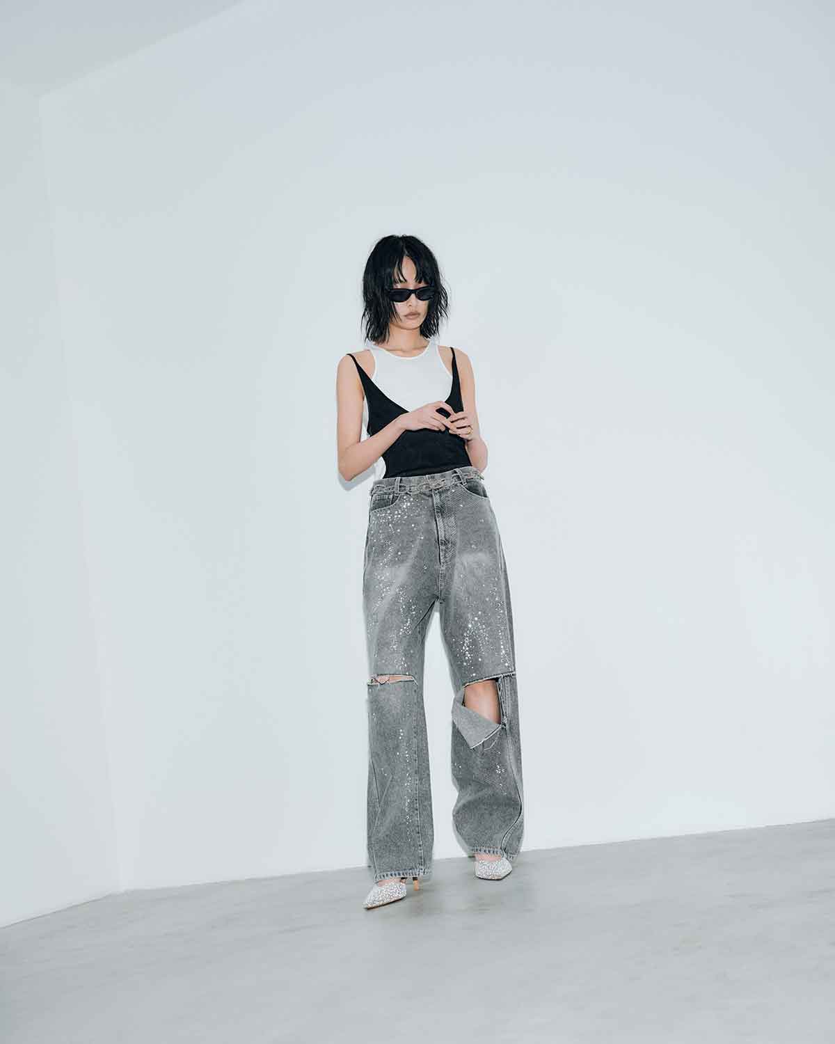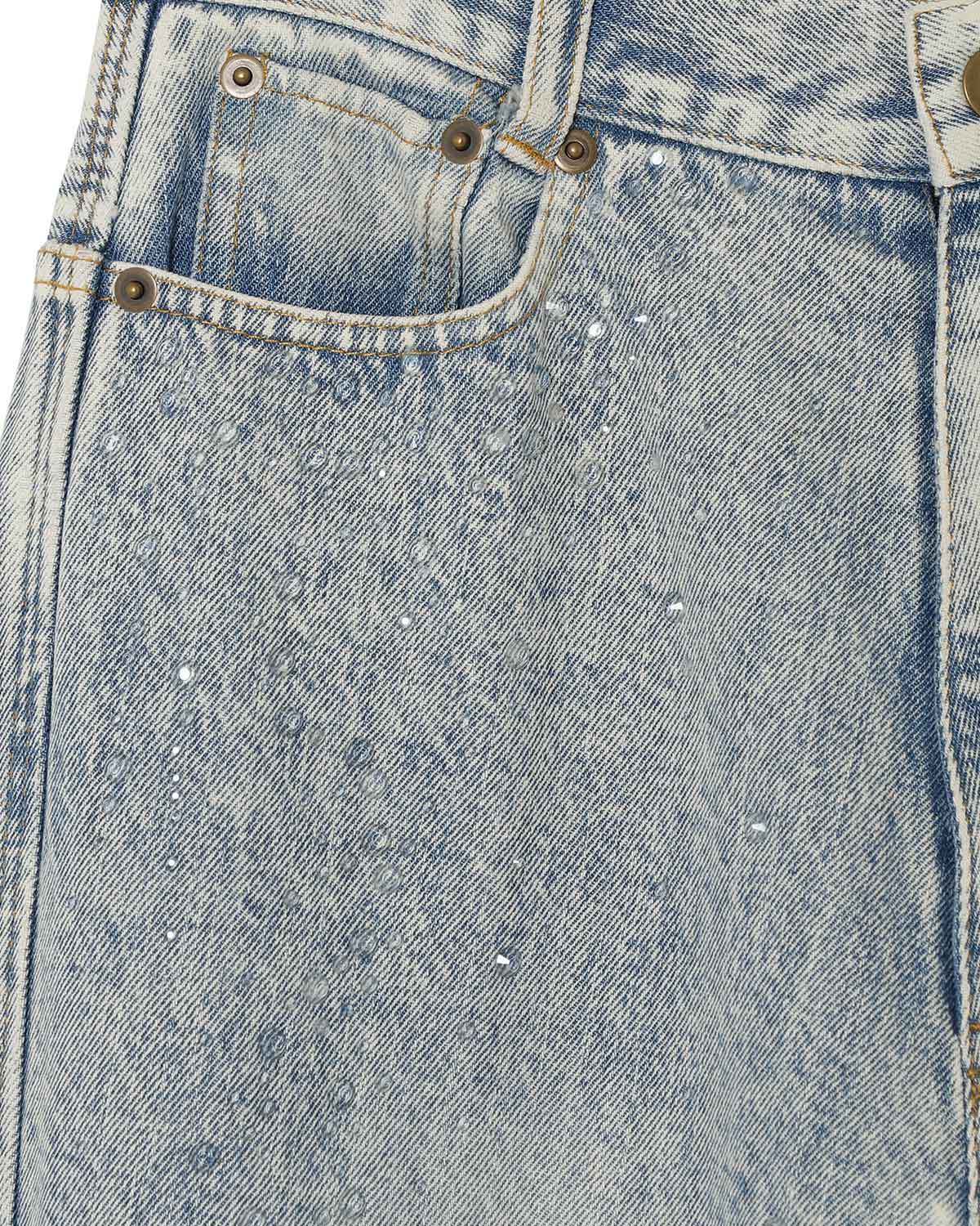 ブルーには控えめな輝きを放つクリアーのラインストーンを、ブラックには上品な輝きを放つクリスタルのラインストーンを使用。大小異なるラインストーンをアシンメトリーに大胆に散りばめた特別なデニムパンツとなっています。