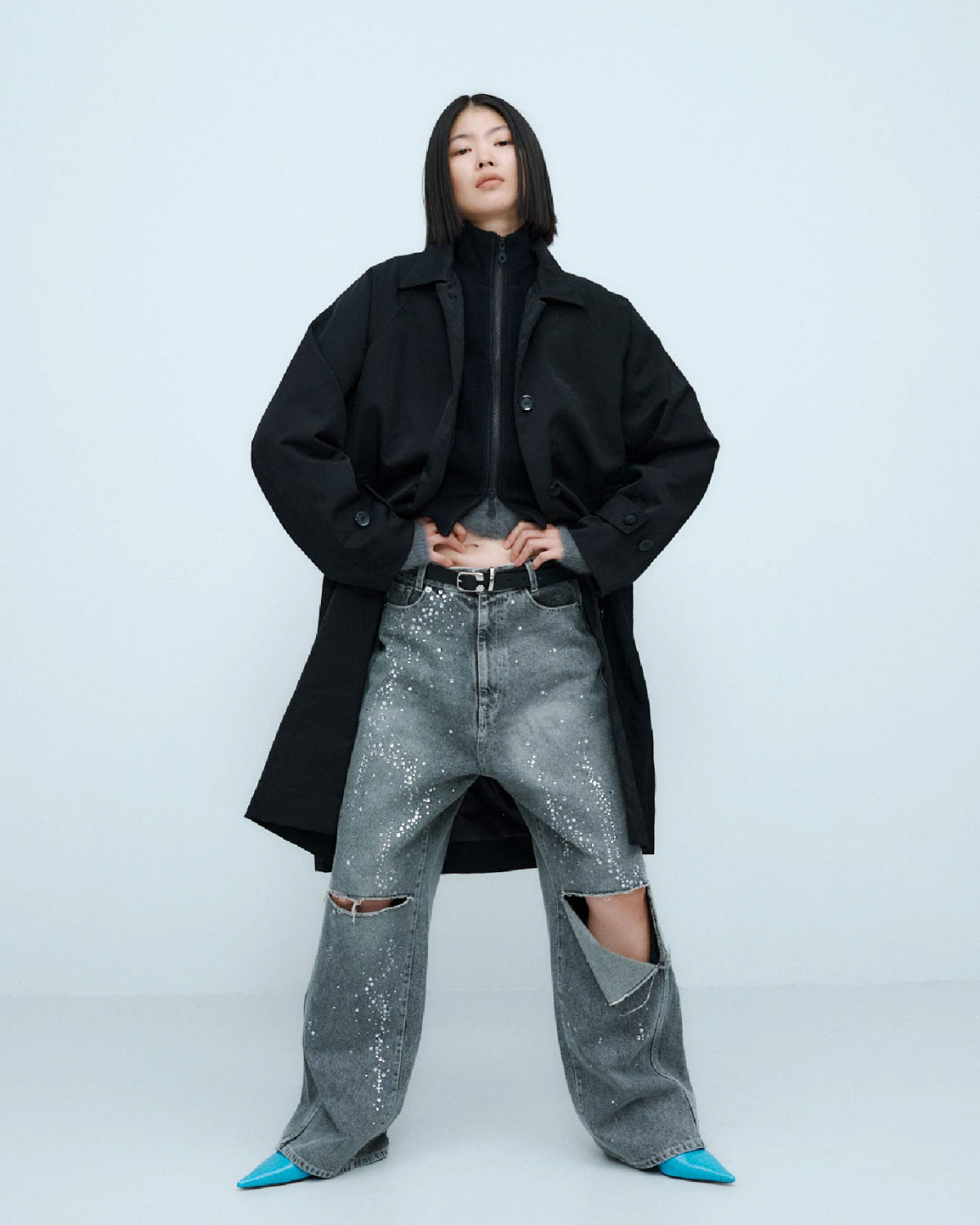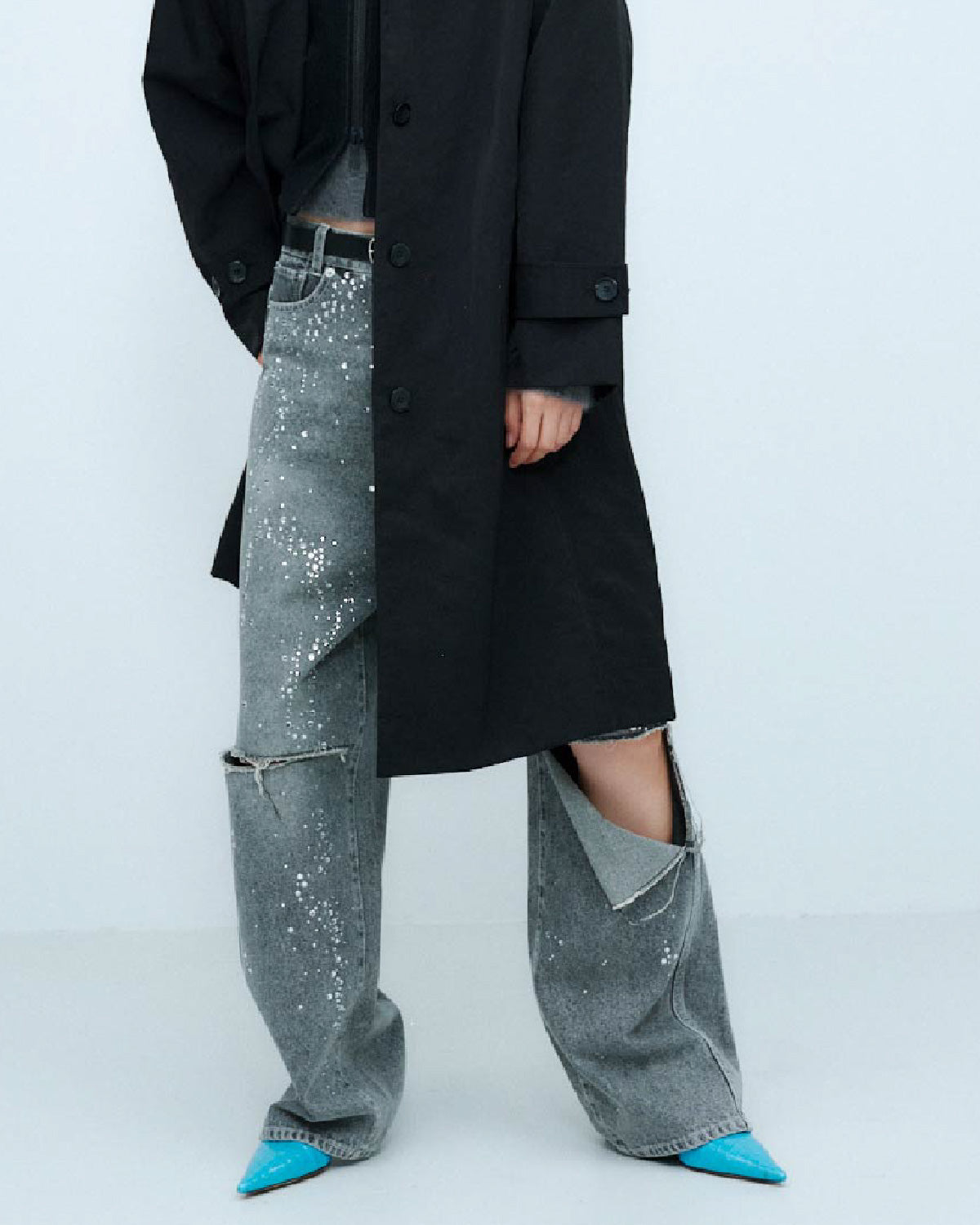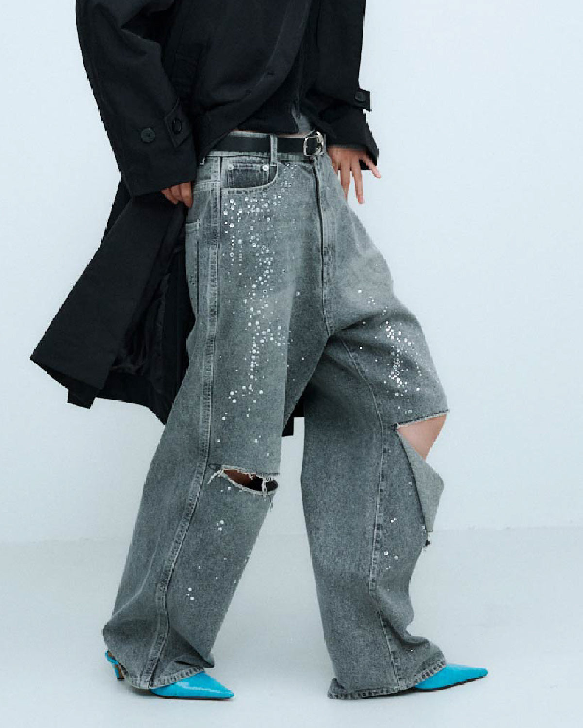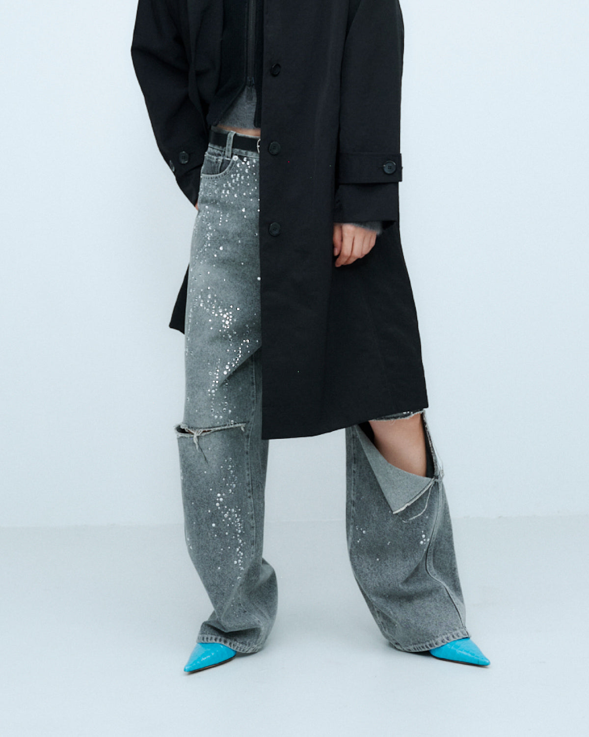 ブルーには控えめな輝きを放つクリアーのラインストーンを、ブラックには上品な輝きを放つクリスタルのラインストーンを使用。大小異なるラインストーンをアシンメトリーに大胆に散りばめた特別なデニムパンツとなっています。