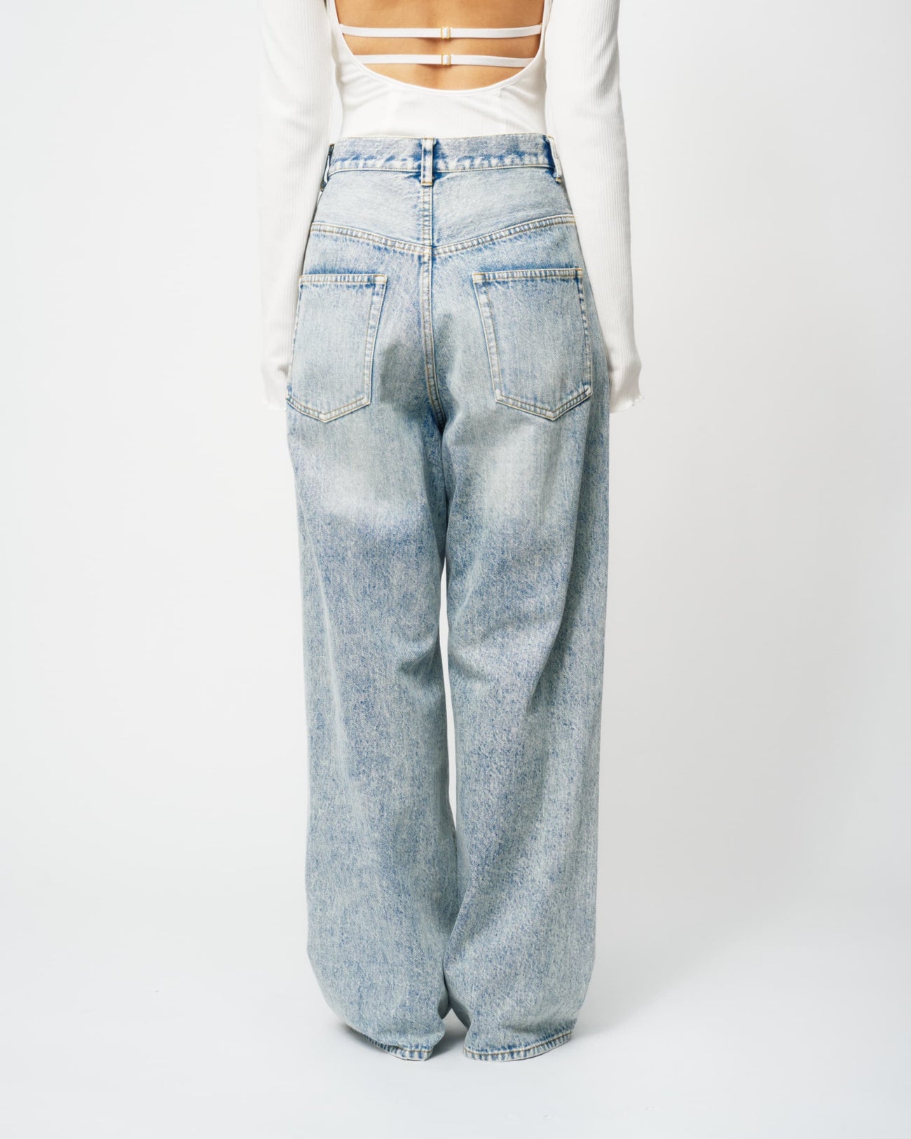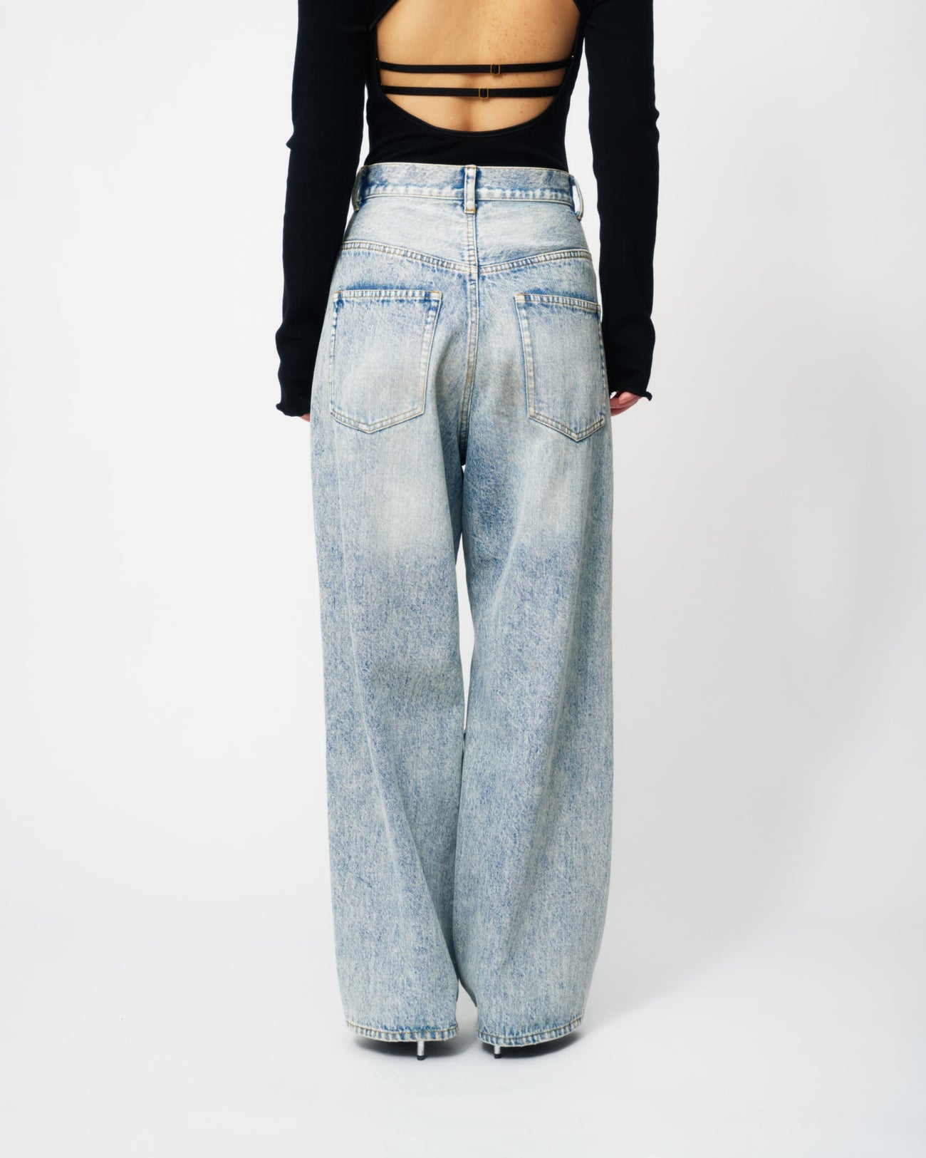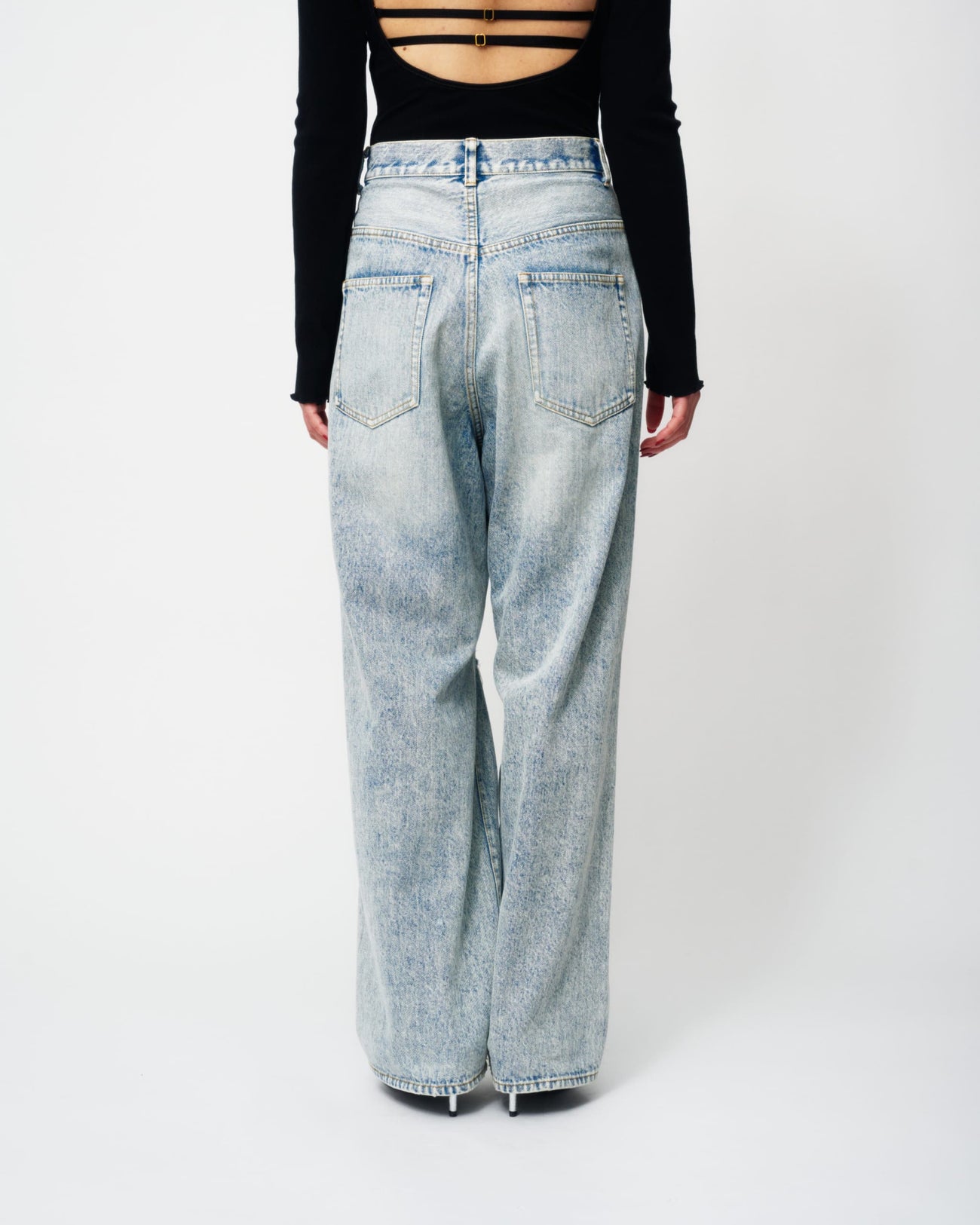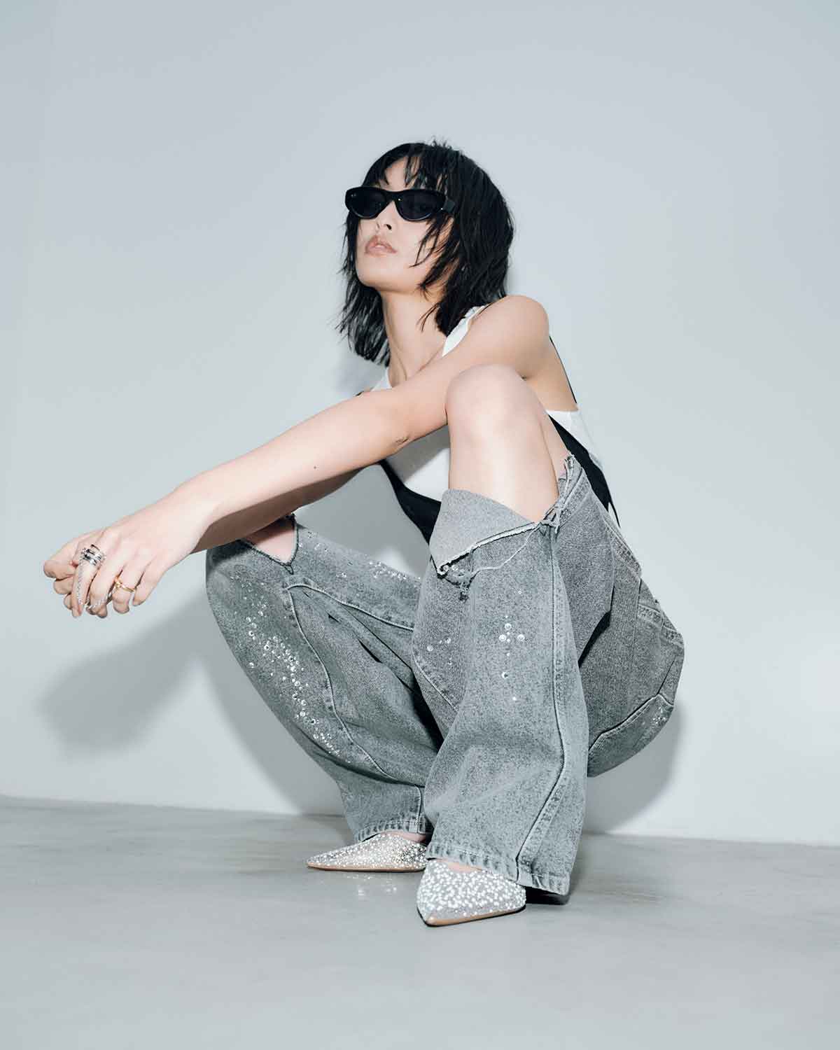 ブルーには控えめな輝きを放つクリアーのラインストーンを、ブラックには上品な輝きを放つクリスタルのラインストーンを使用。大小異なるラインストーンをアシンメトリーに大胆に散りばめた特別なデニムパンツとなっています。