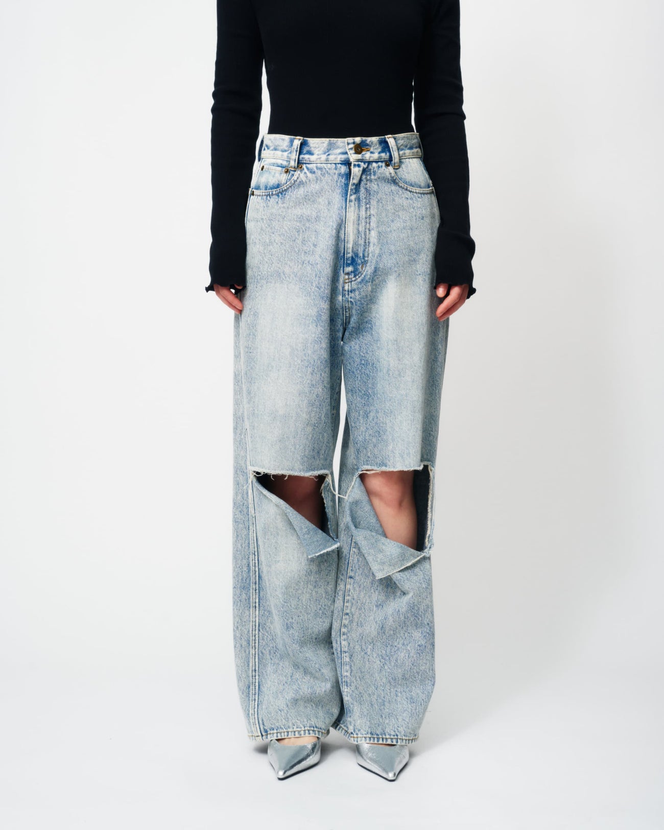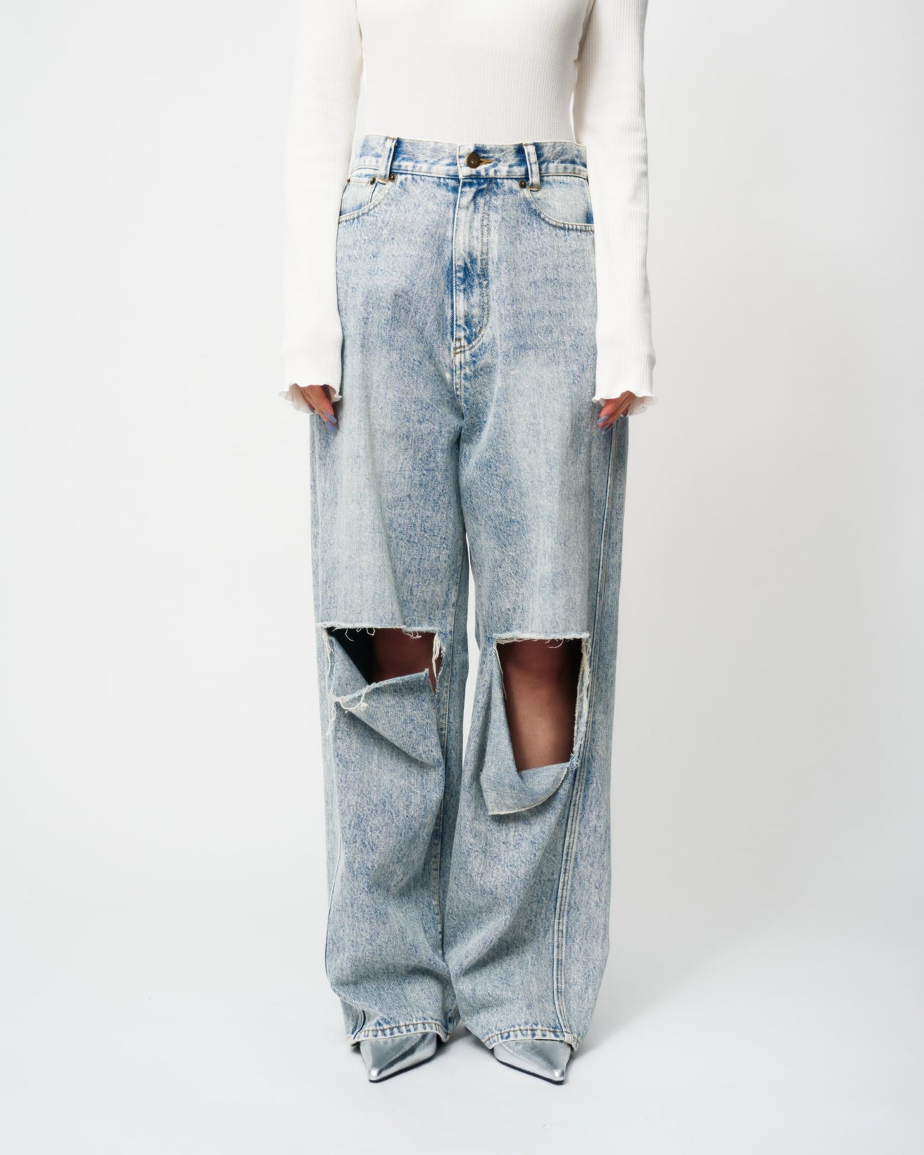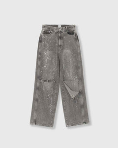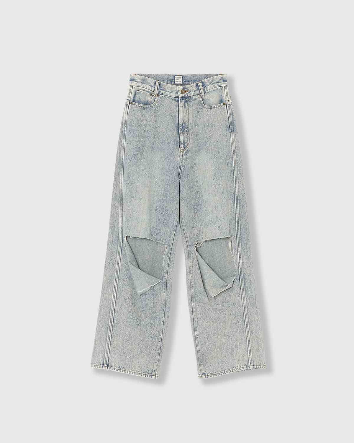 KNEE CUTTING DENIM PANTSにラインストーンを散りばめたスペシャルなデニムパンツ。