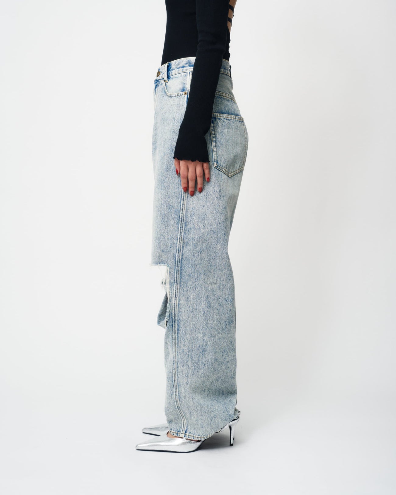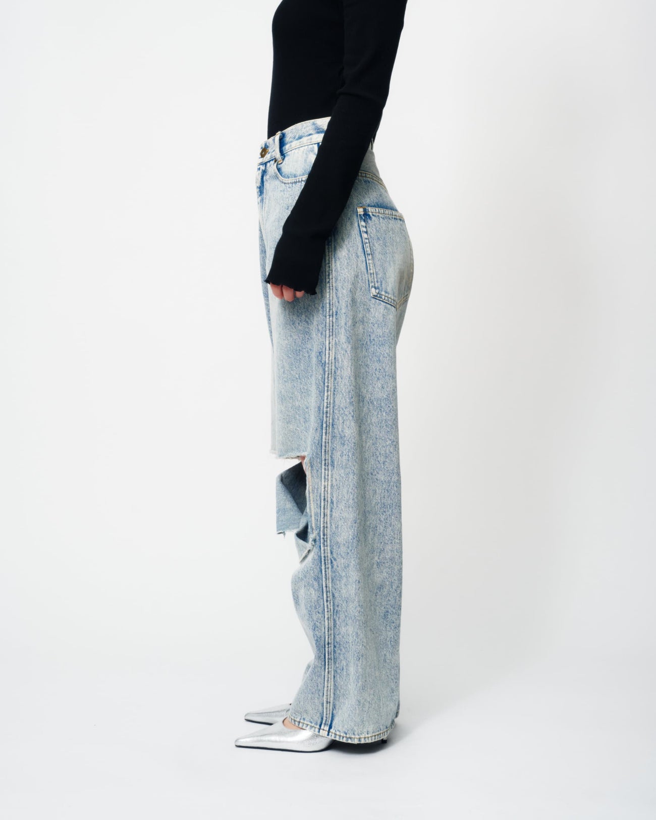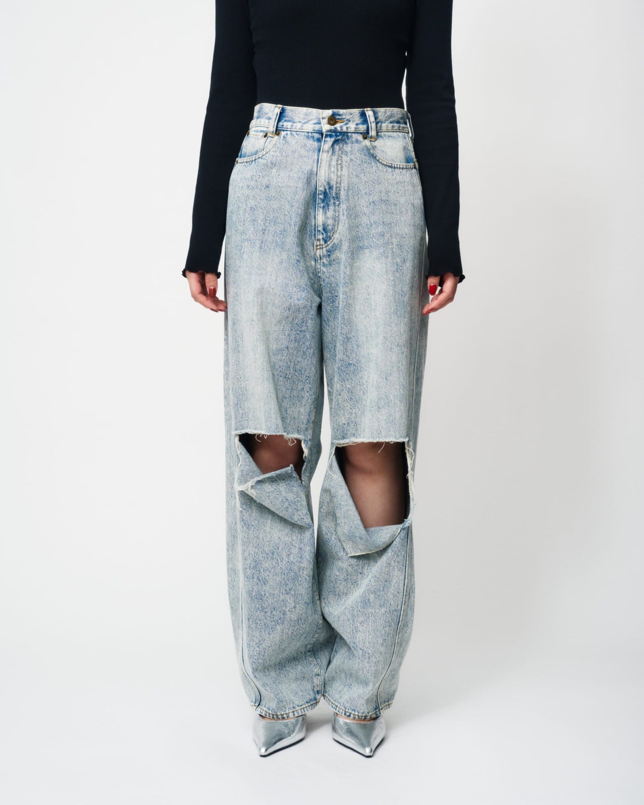 KNEE CUTTING DENIM PANTSにラインストーンを散りばめたスペシャルなデニムパンツ。