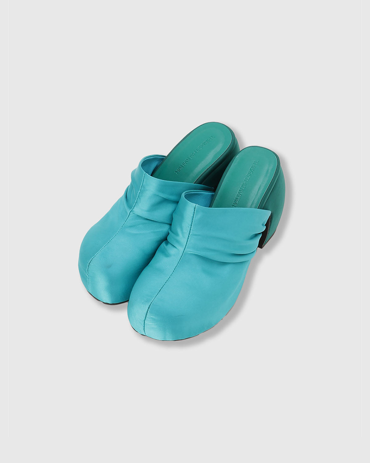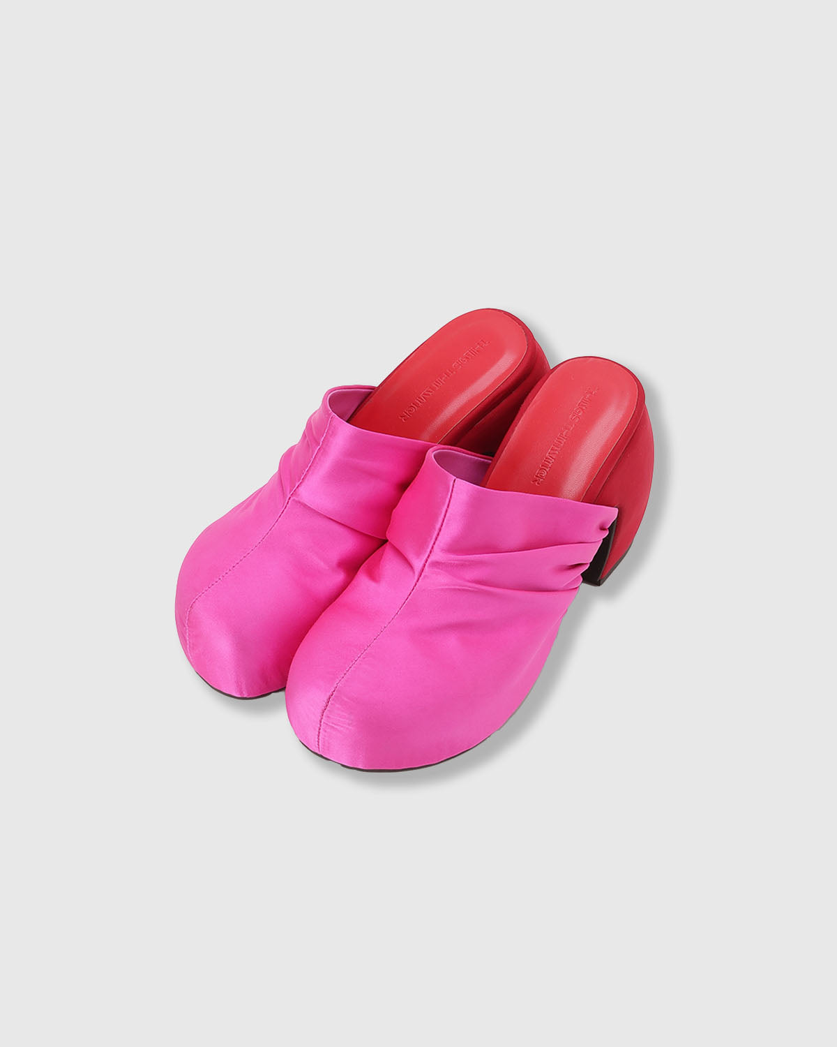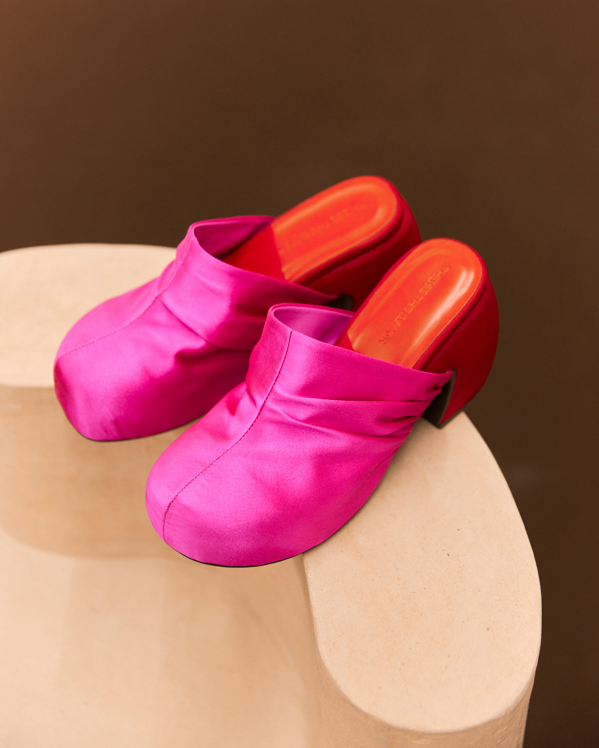サテンの艶とヒールの異素材使いが他にはないエッジの効いたモードな一足に。