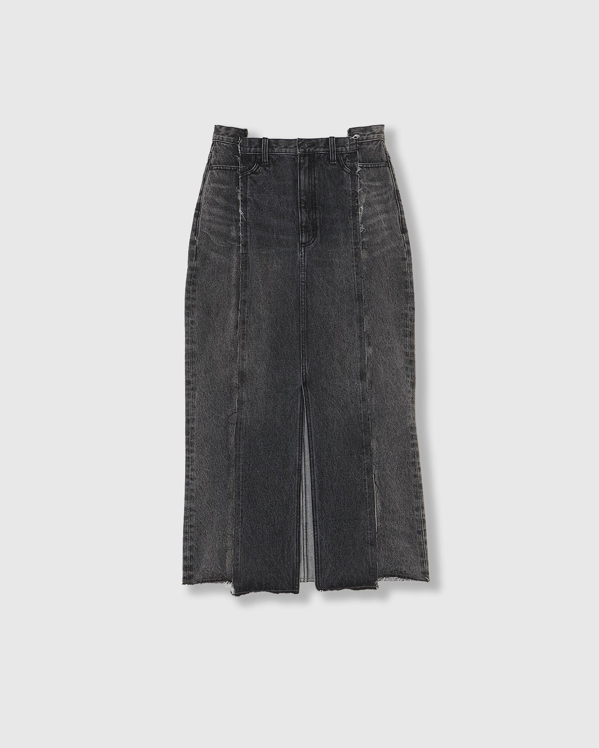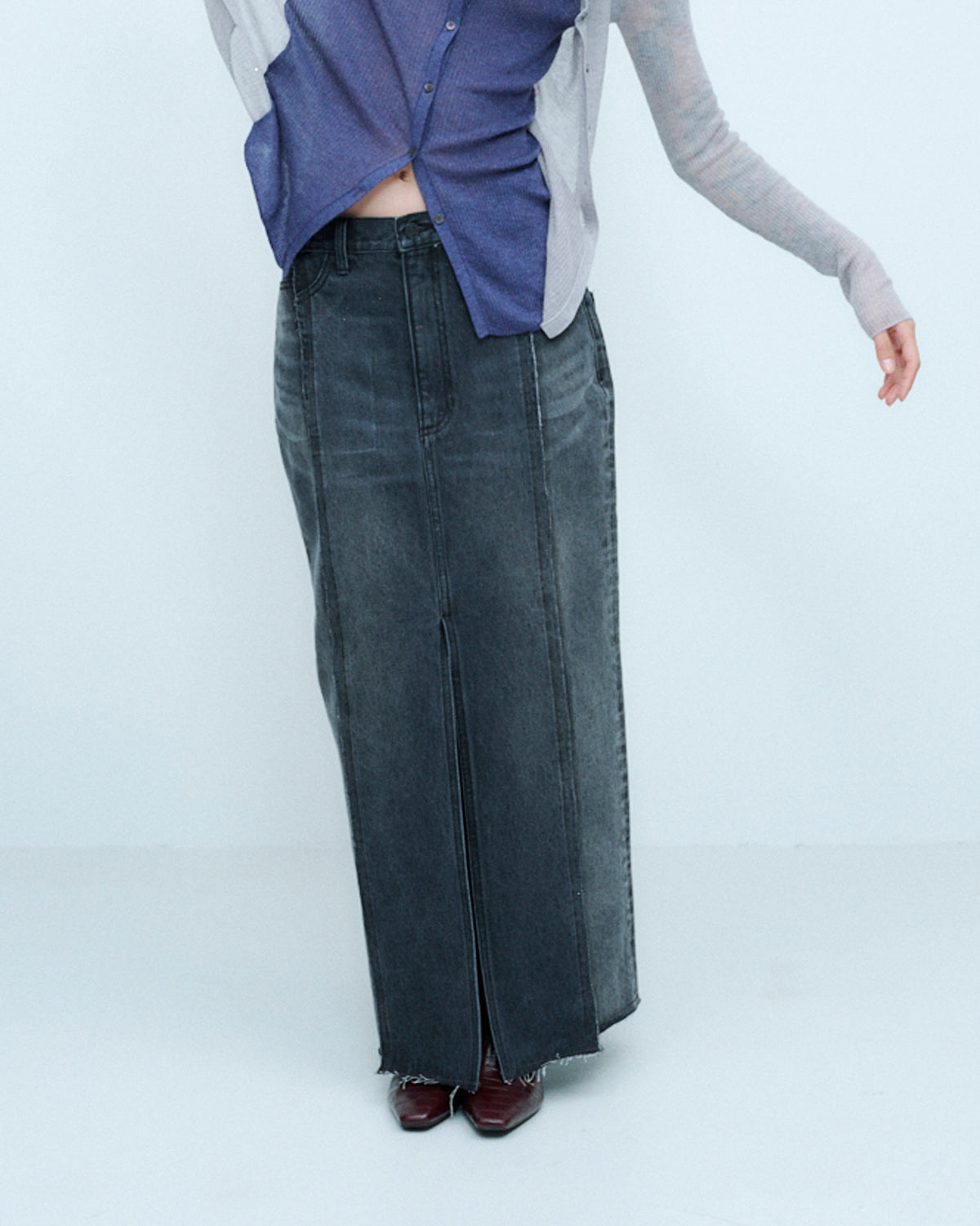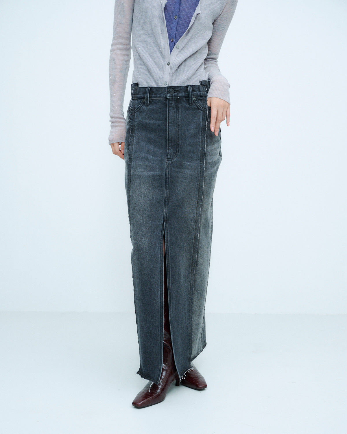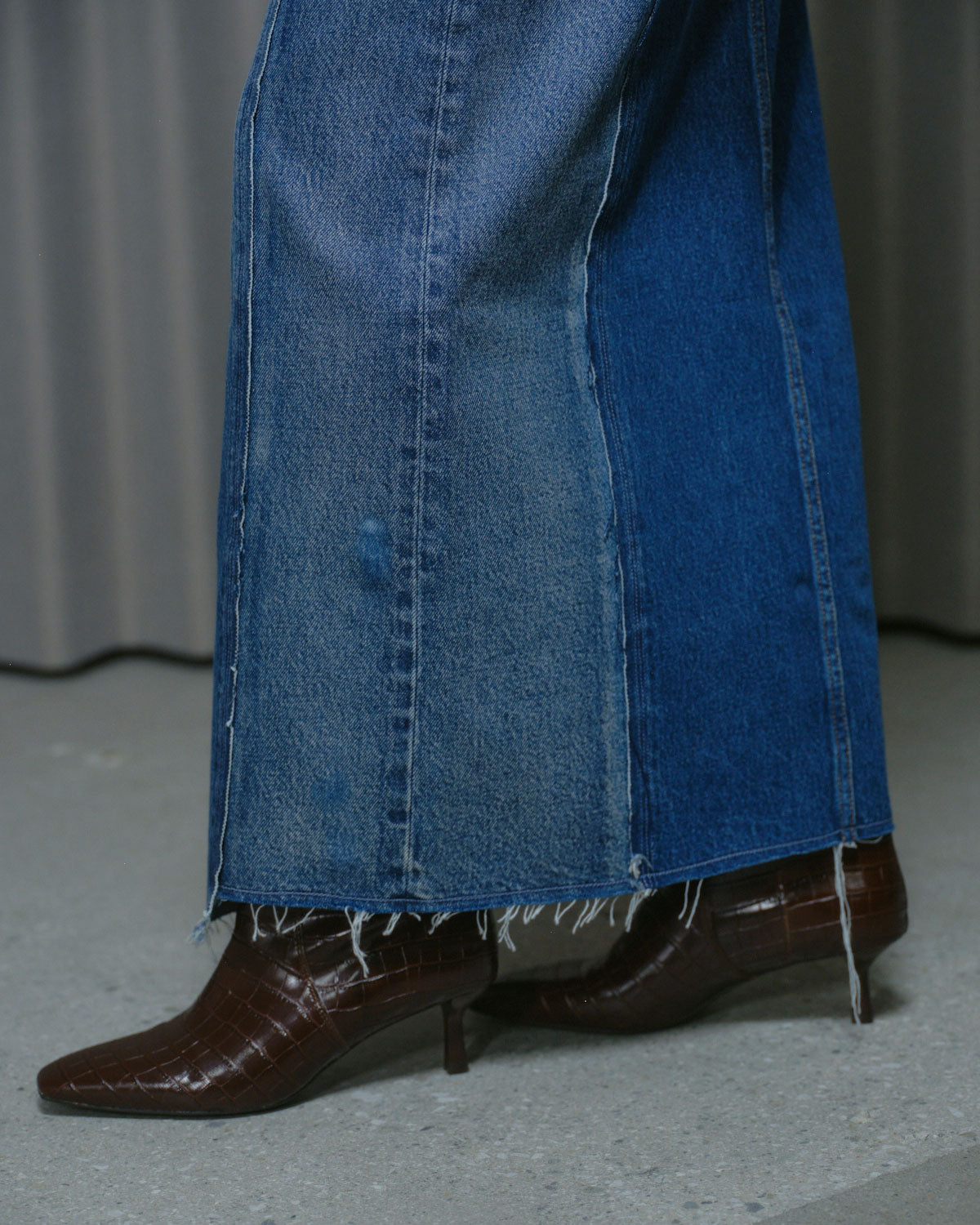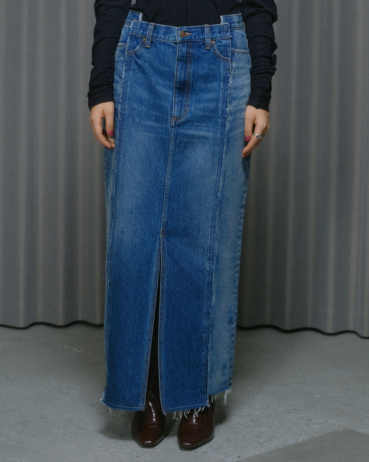 リメイク風デザインが目を引く、デニムのロングスカート。