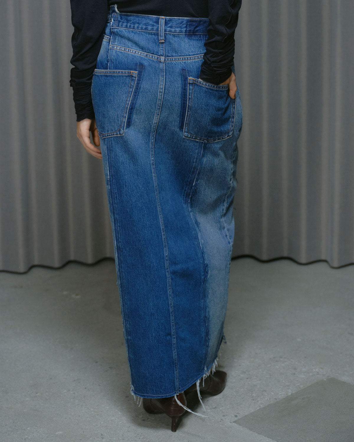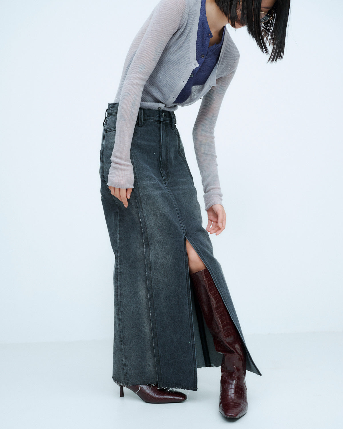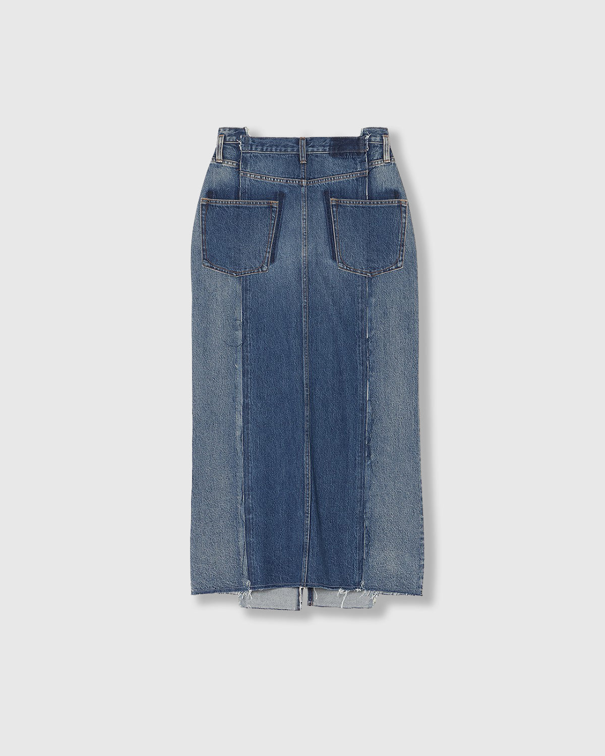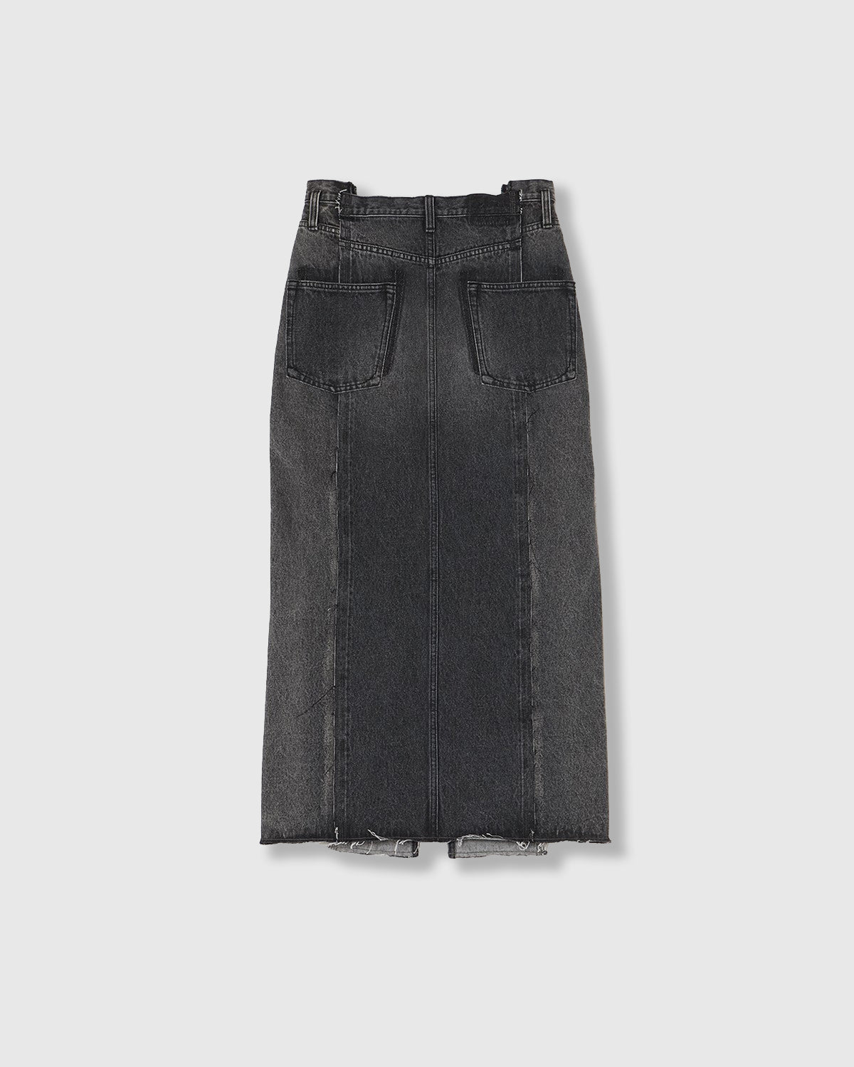 リメイク風デザインが目を引く、デニムのロングスカート。