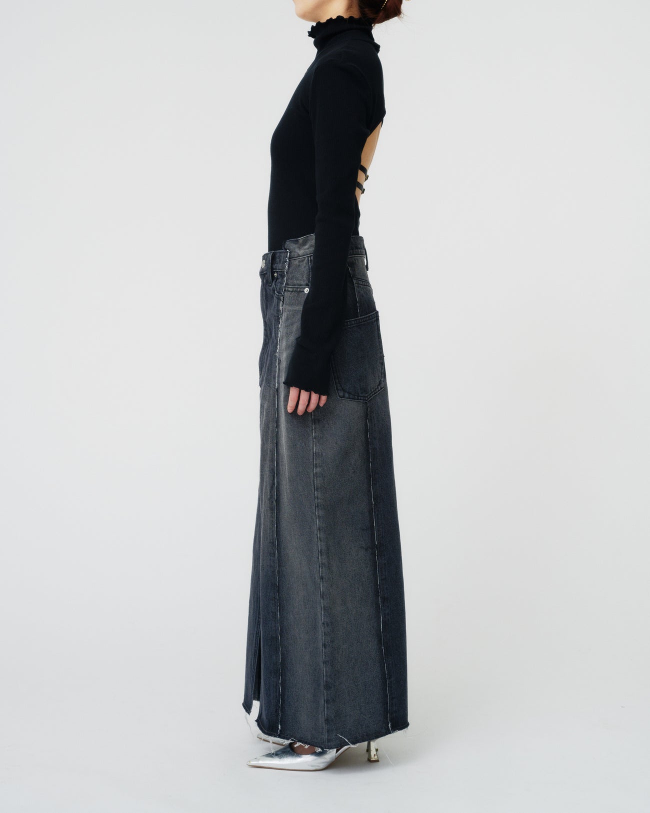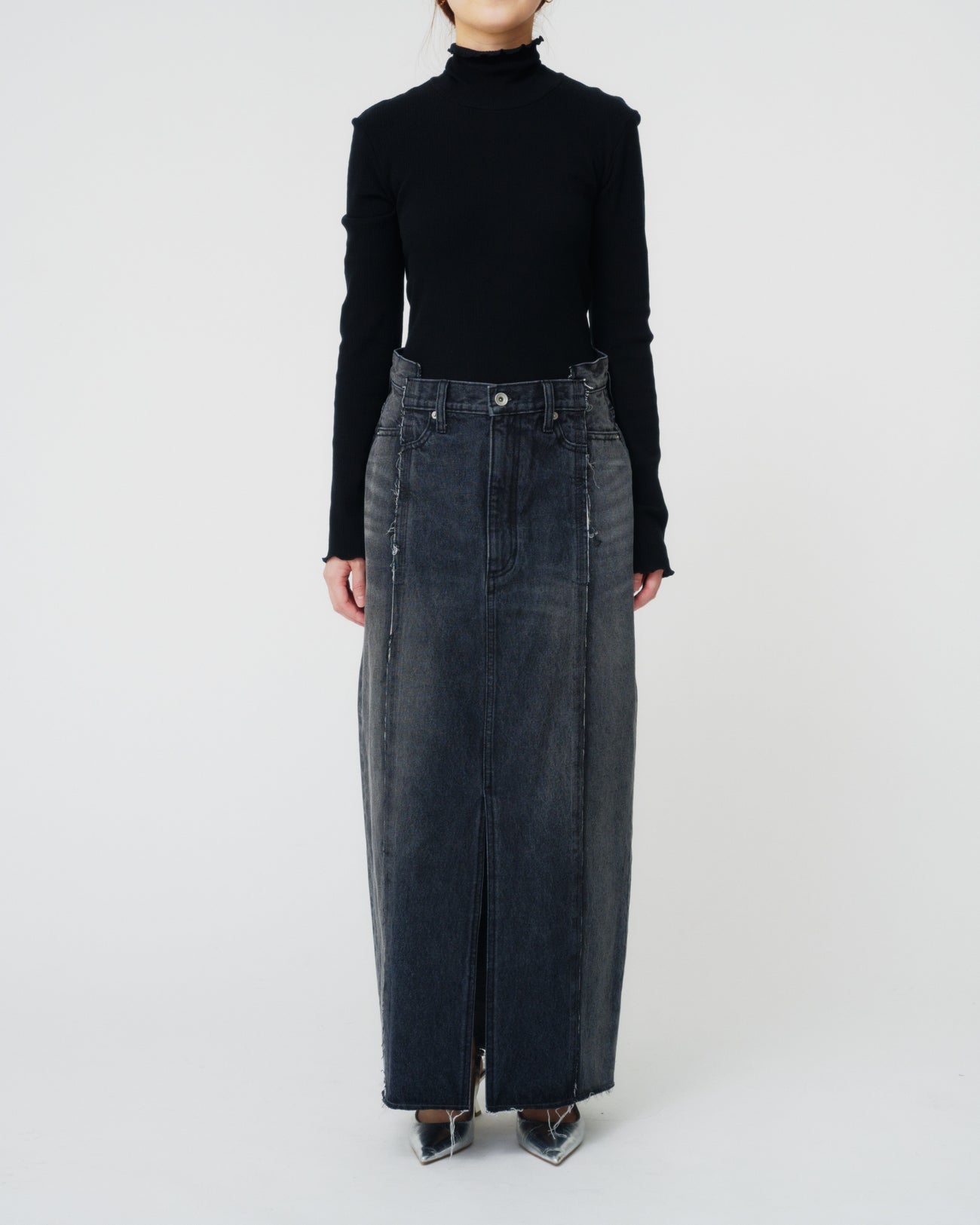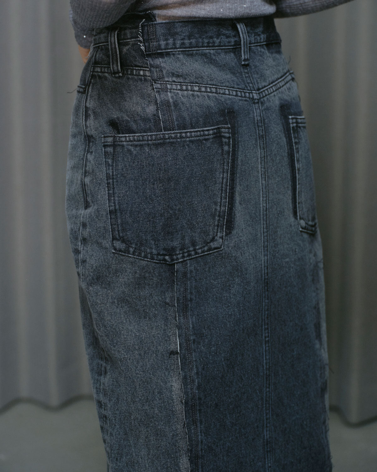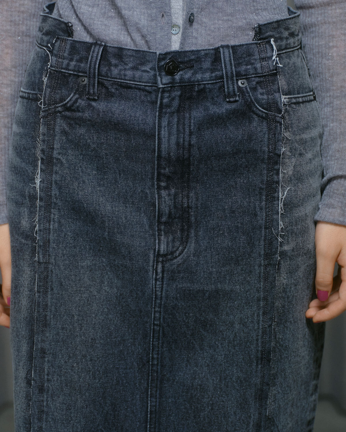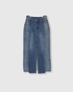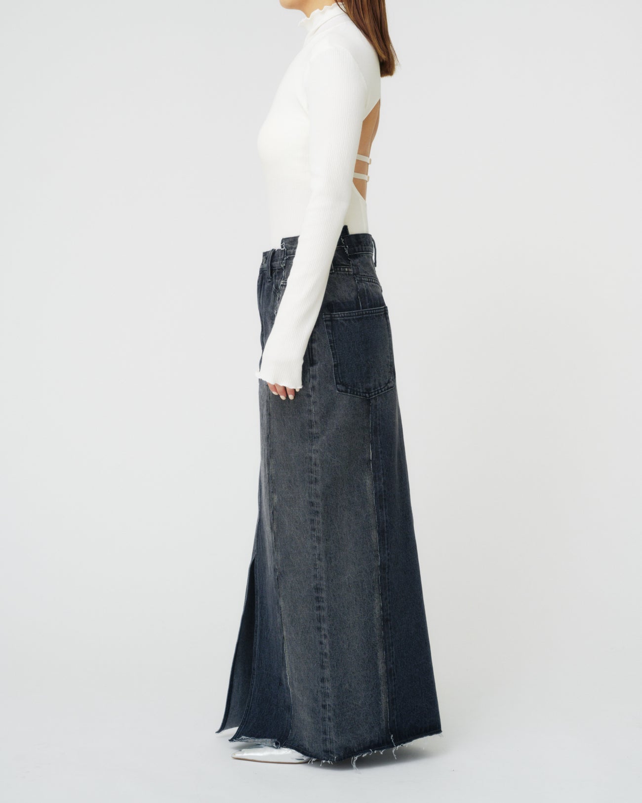 リメイク風デザインが目を引く、デニムのロングスカート。