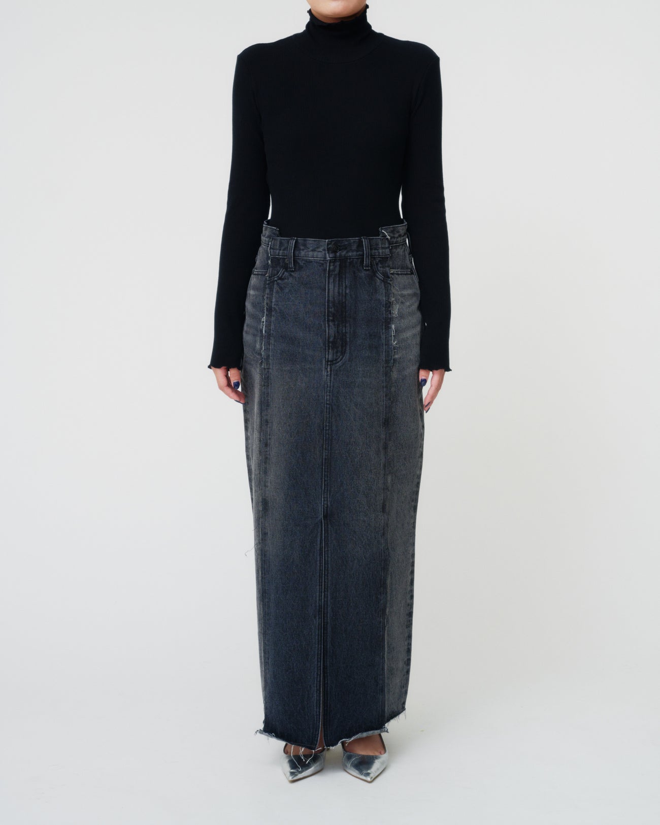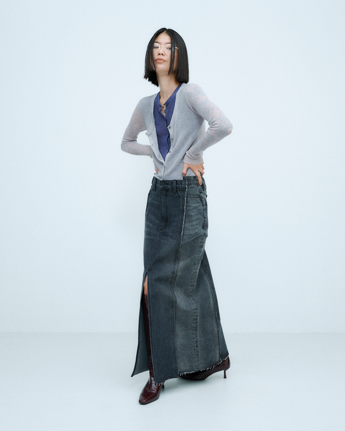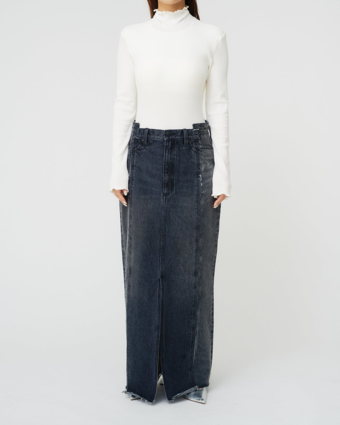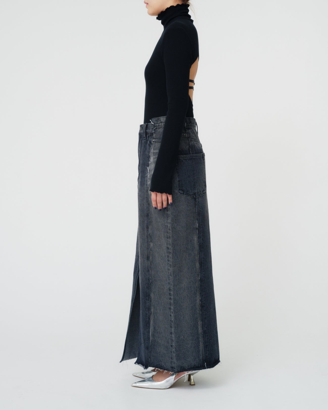リメイク風デザインが目を引く、デニムのロングスカート。