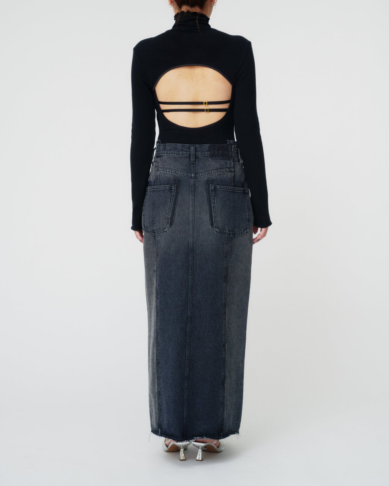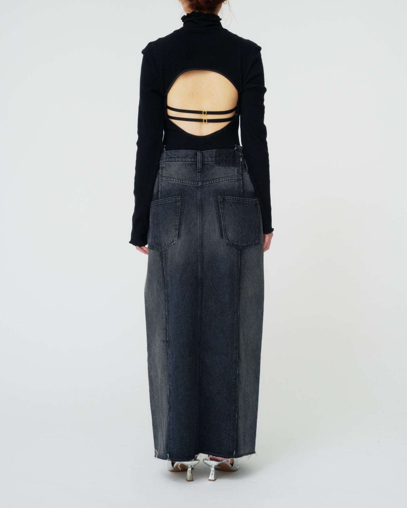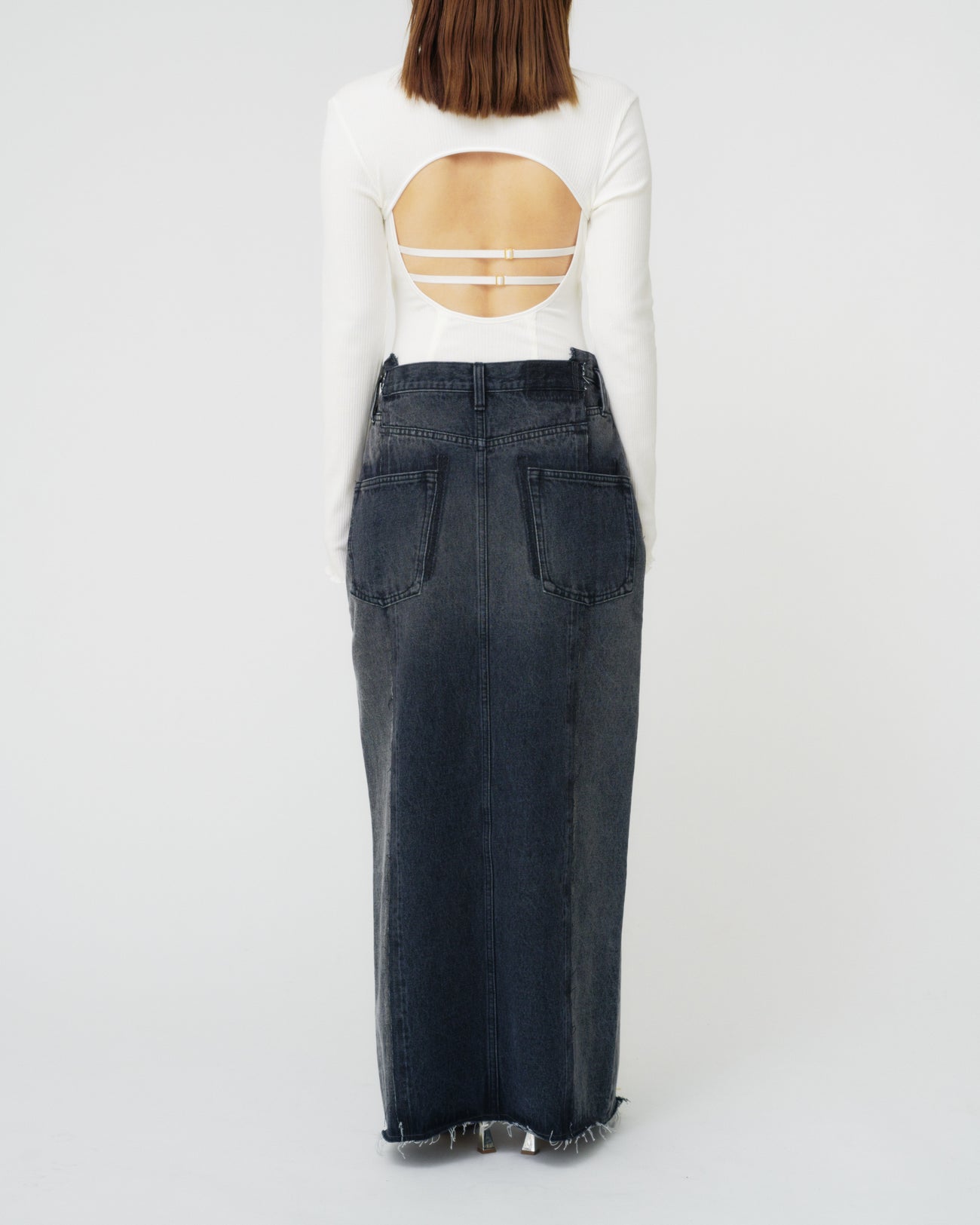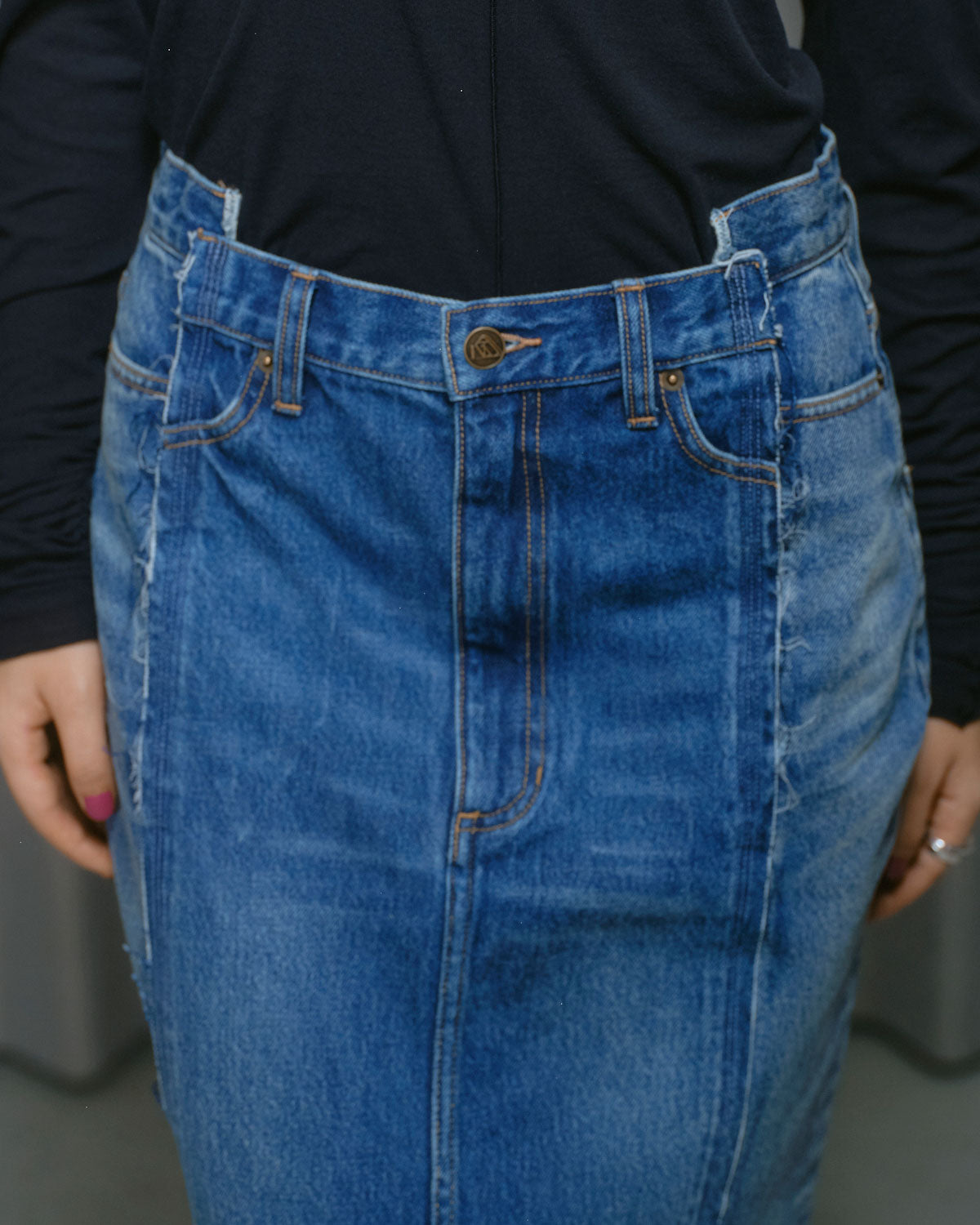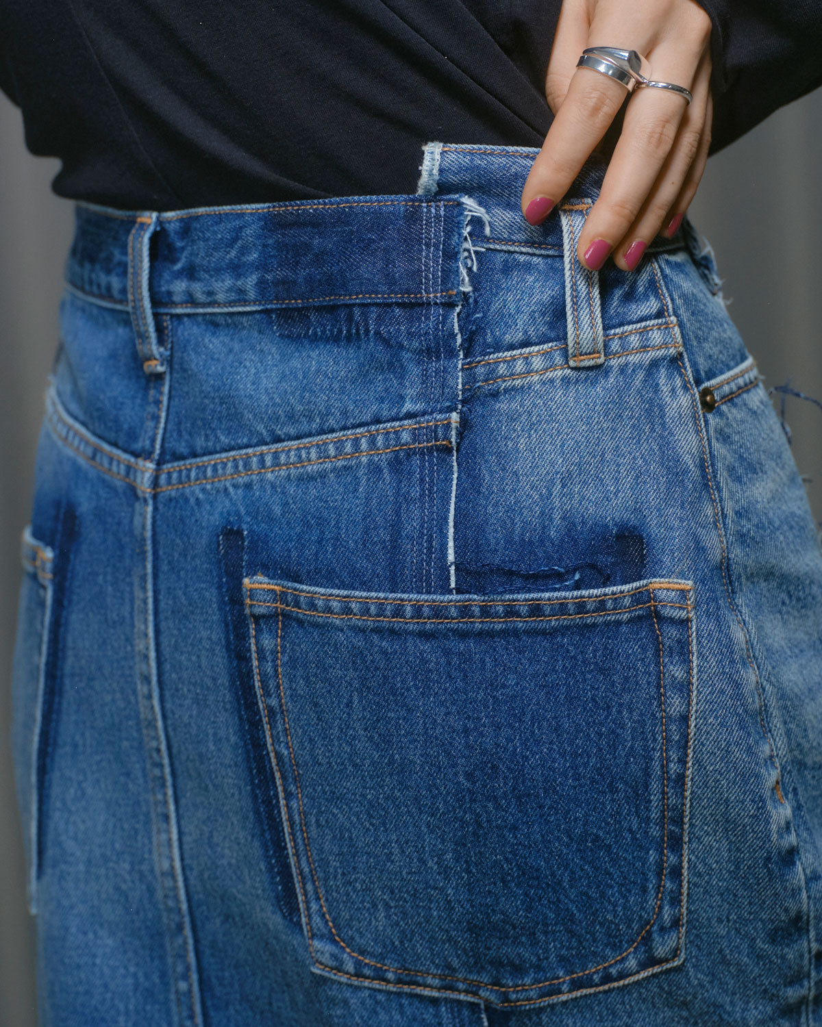 リメイク風デザインが目を引く、デニムのロングスカート。