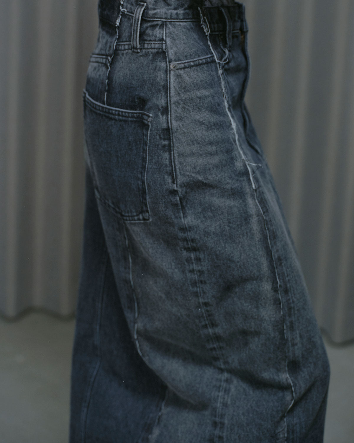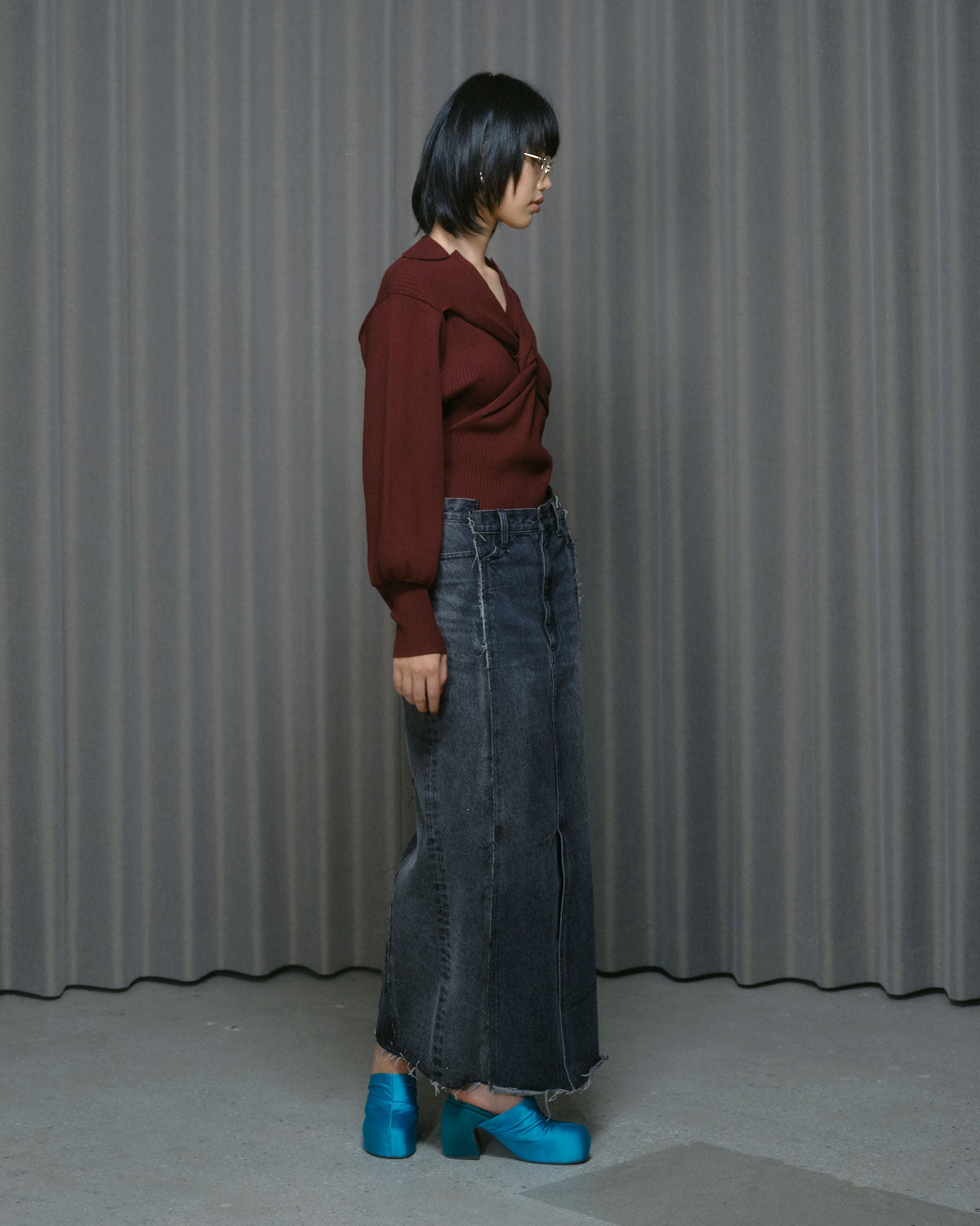 まるで2枚のスカートを重ね合わせたような構築的なデザインに、ウエストや裾のランダムなヘムラインがアクセント。