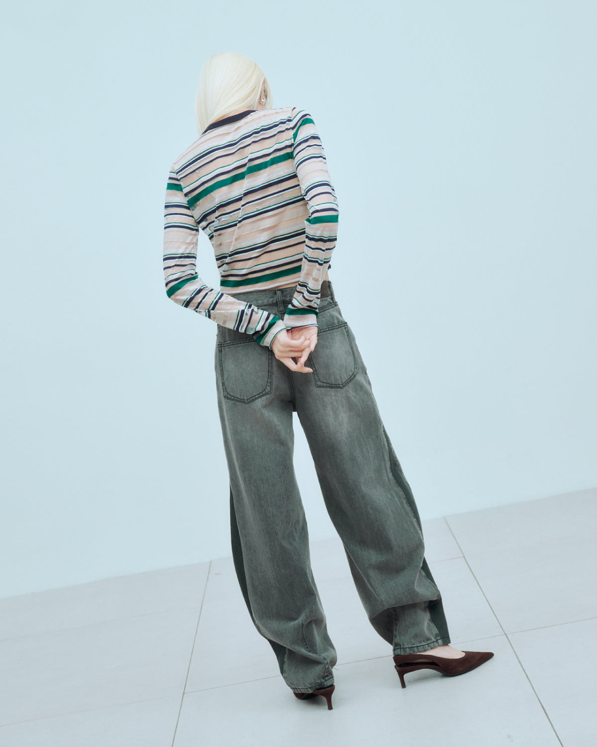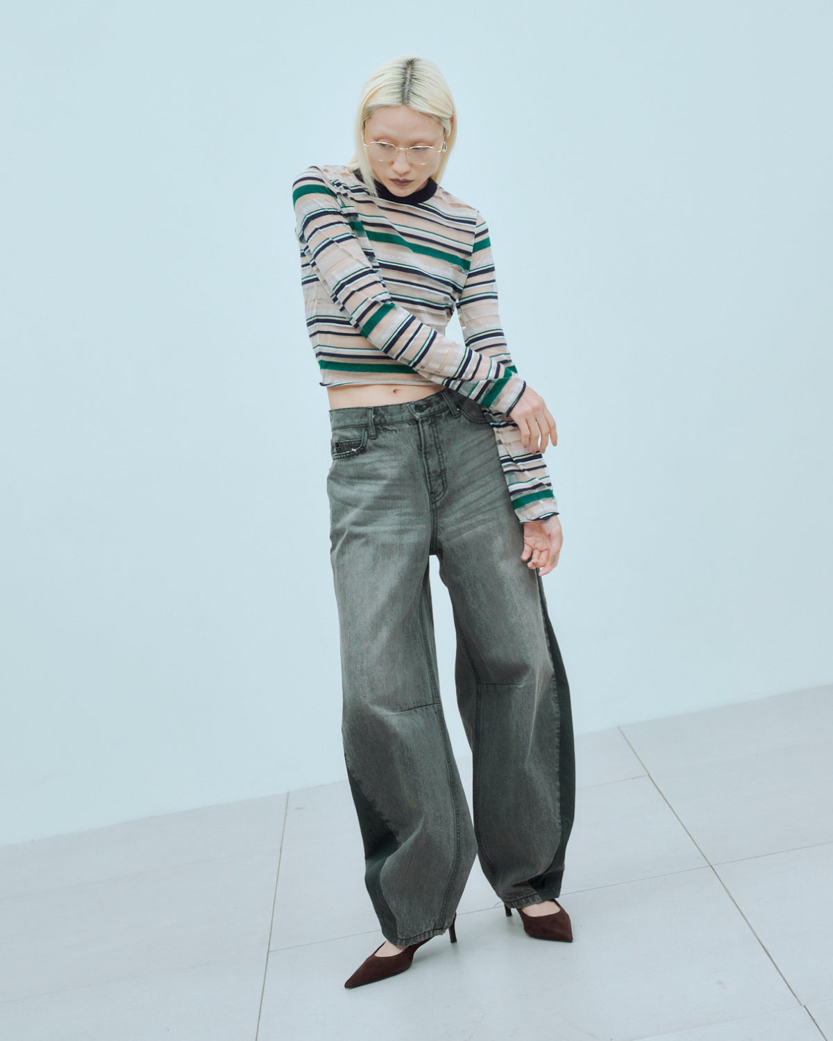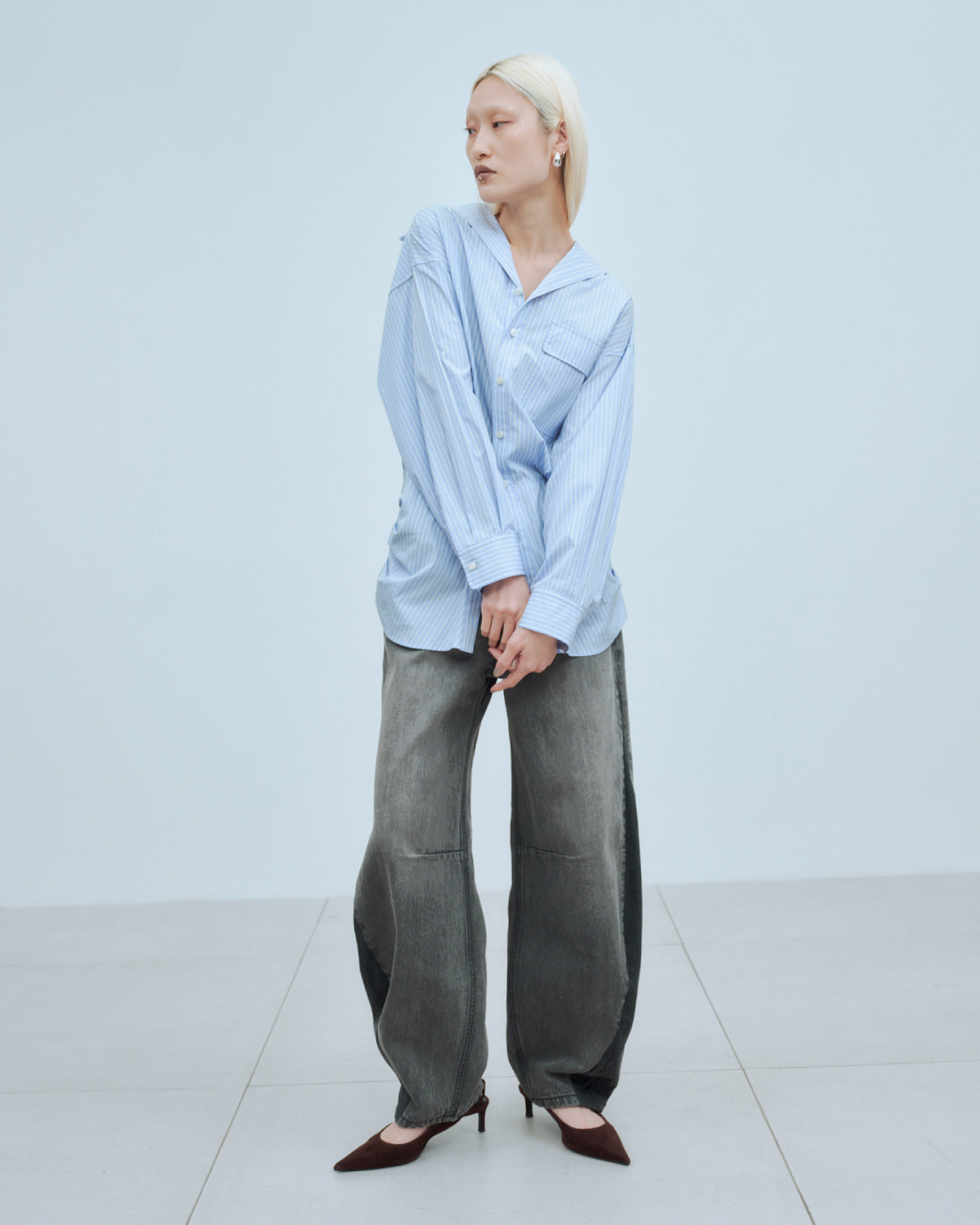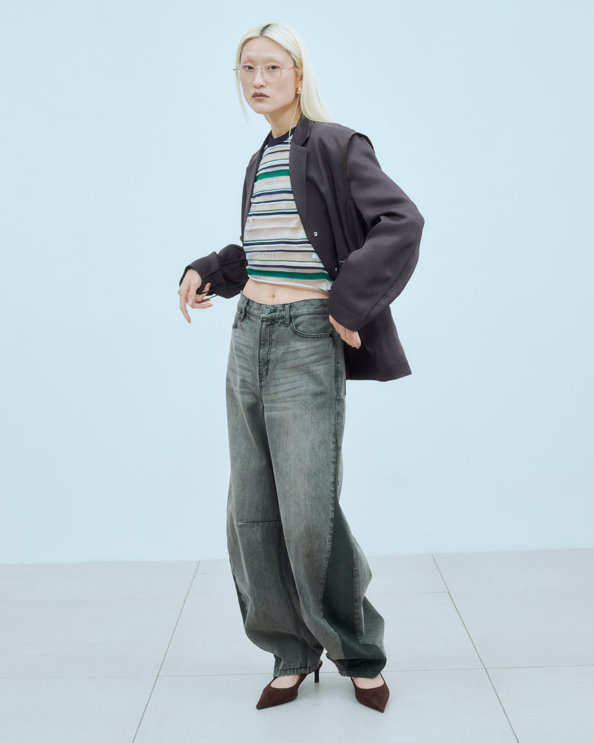 リメイク風の切り替えデザインとダーツを取り入れた、全体的に丸みのあるシルエットが特徴のデニム。内側に入ったダーツでカーブのシルエットになっておりスタイリングに程よい動きをプラスします。