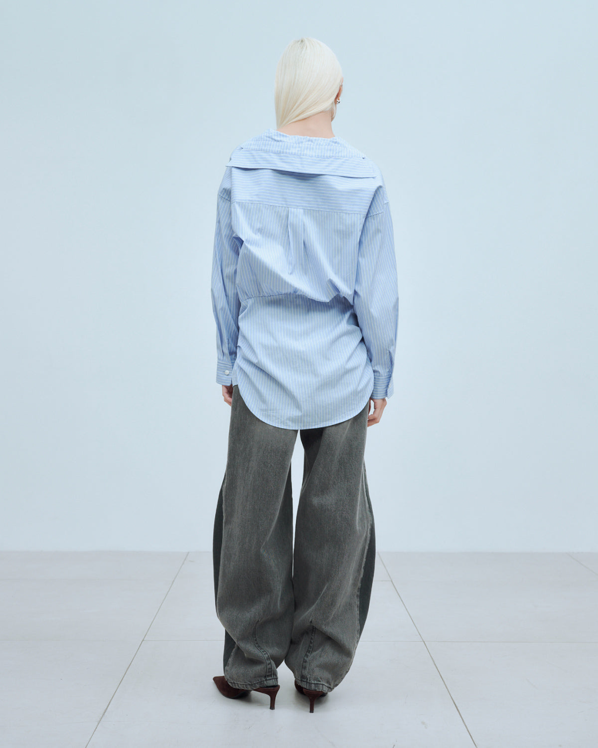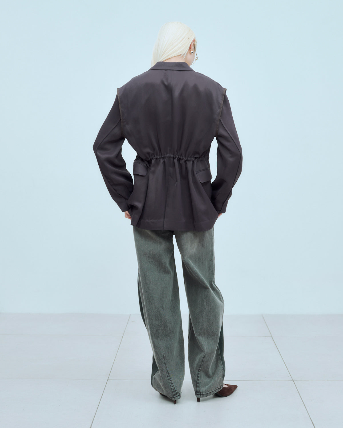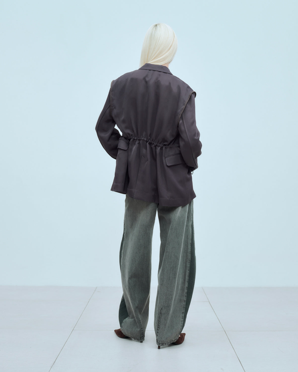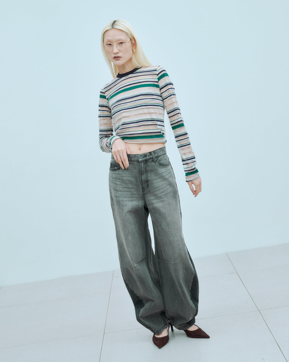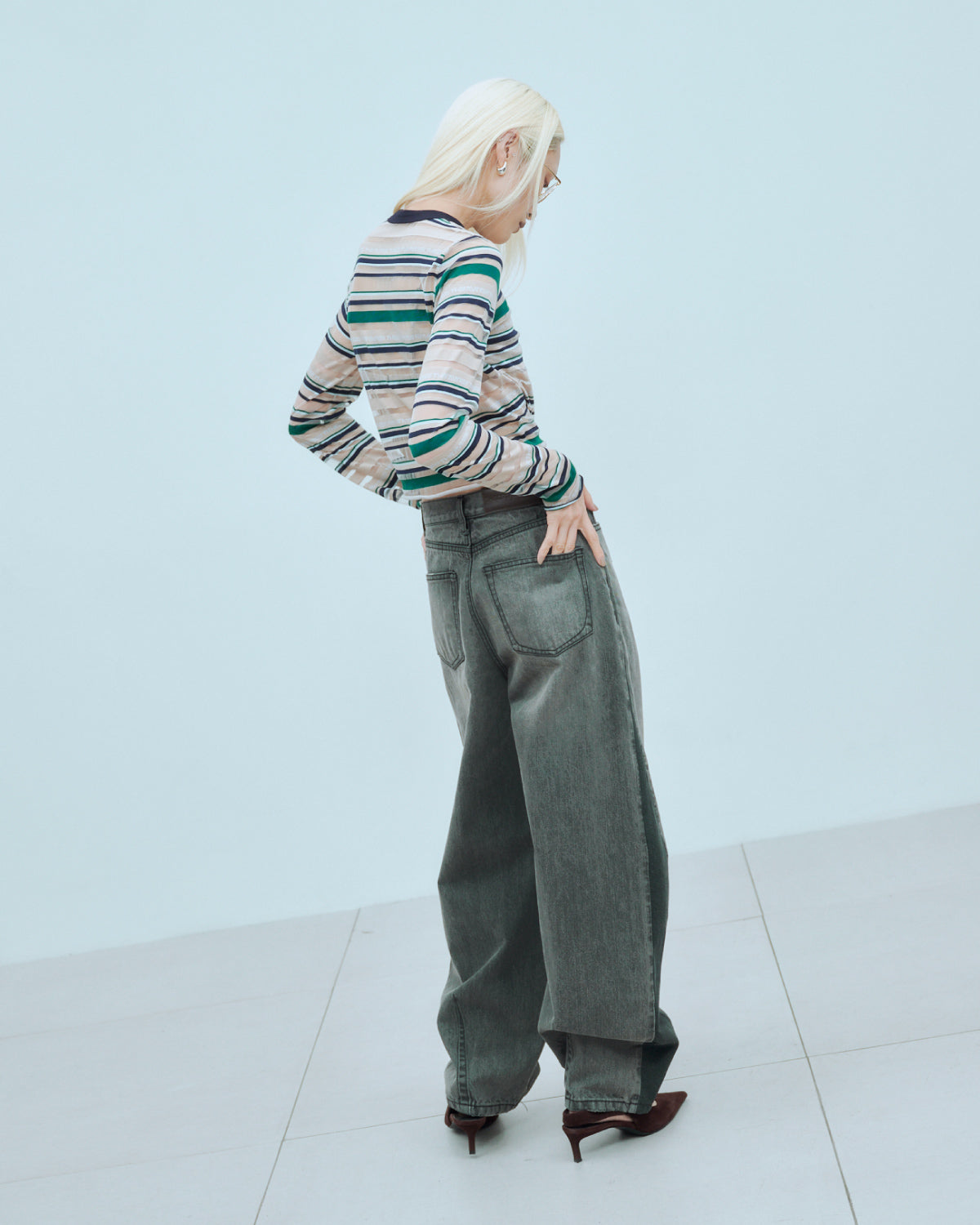 リメイク風の切り替えデザインとダーツを取り入れた、全体的に丸みのあるシルエットが特徴のデニム。内側に入ったダーツでカーブのシルエットになっておりスタイリングに程よい動きをプラスします。