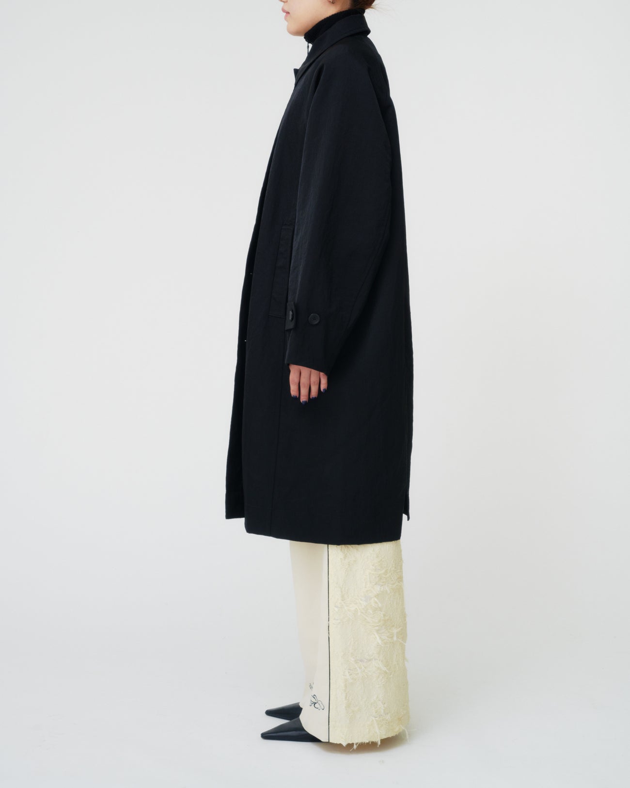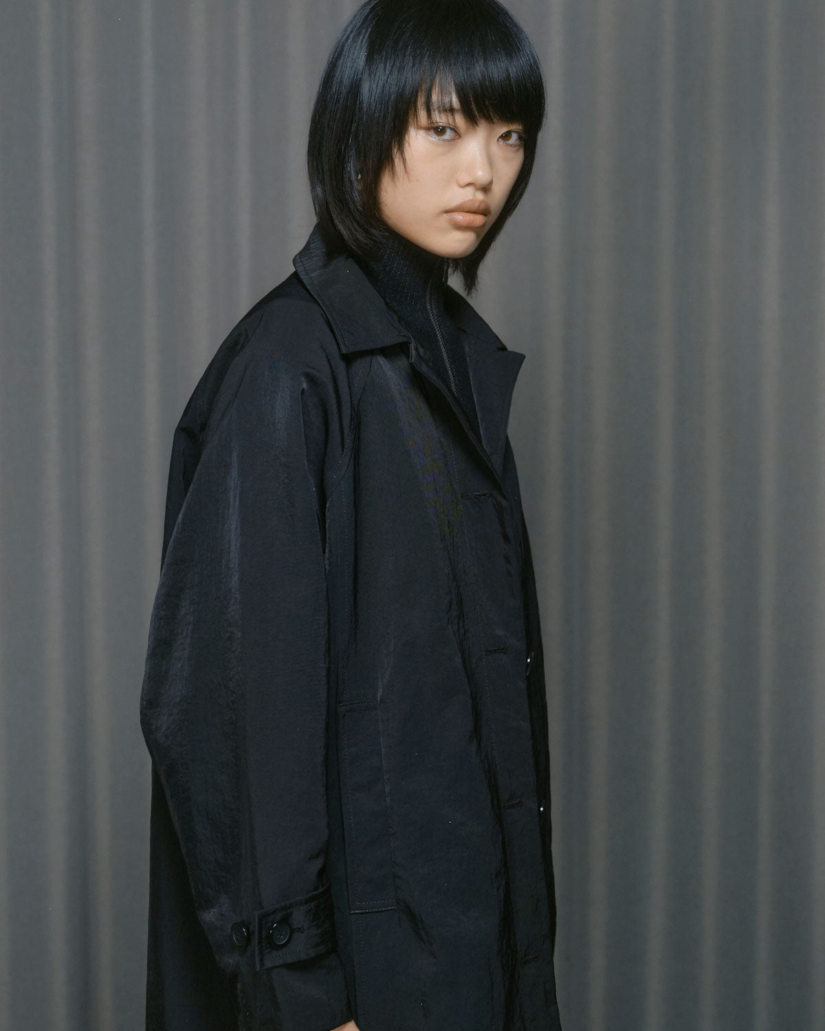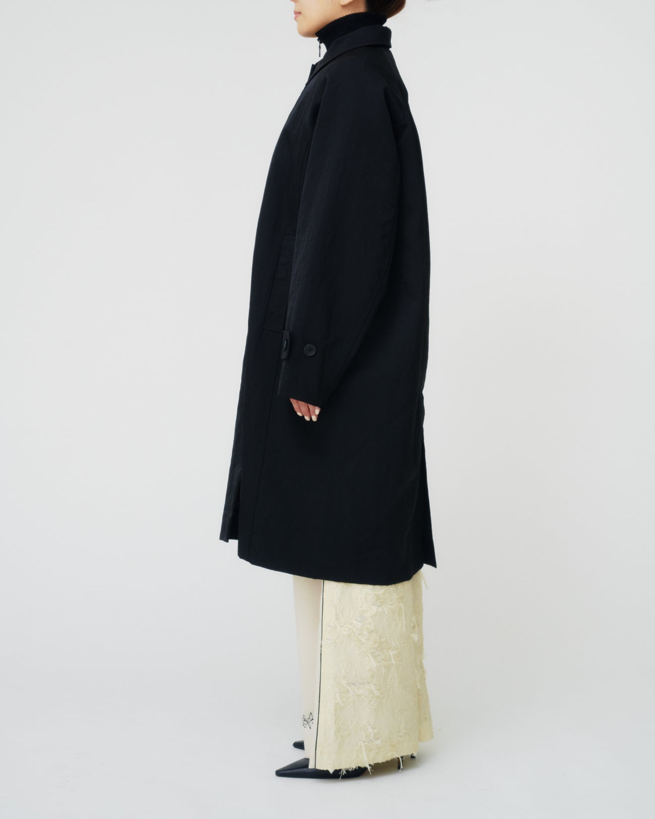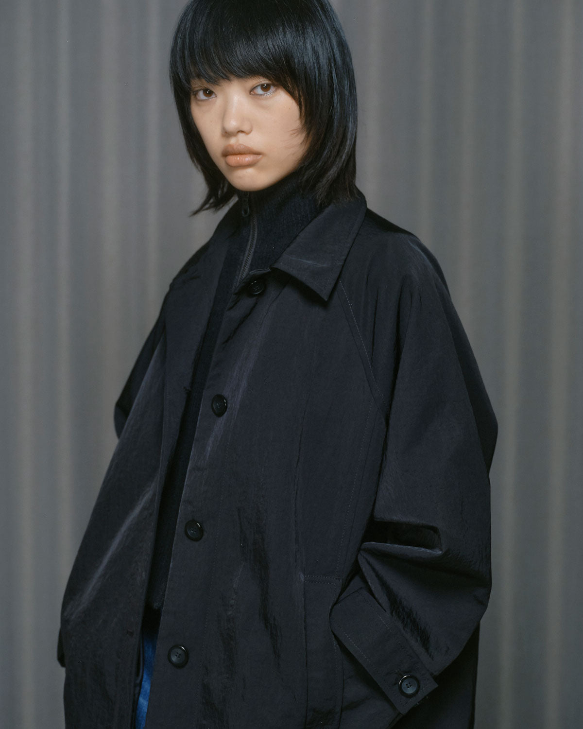ヴィンテージライクな風合いとレイヤードスタイルを楽しめる、ナイロン素材のロングコート。
