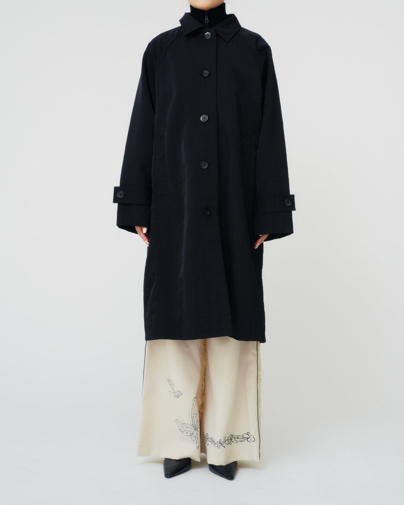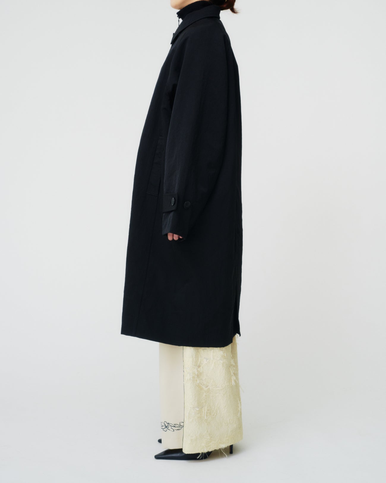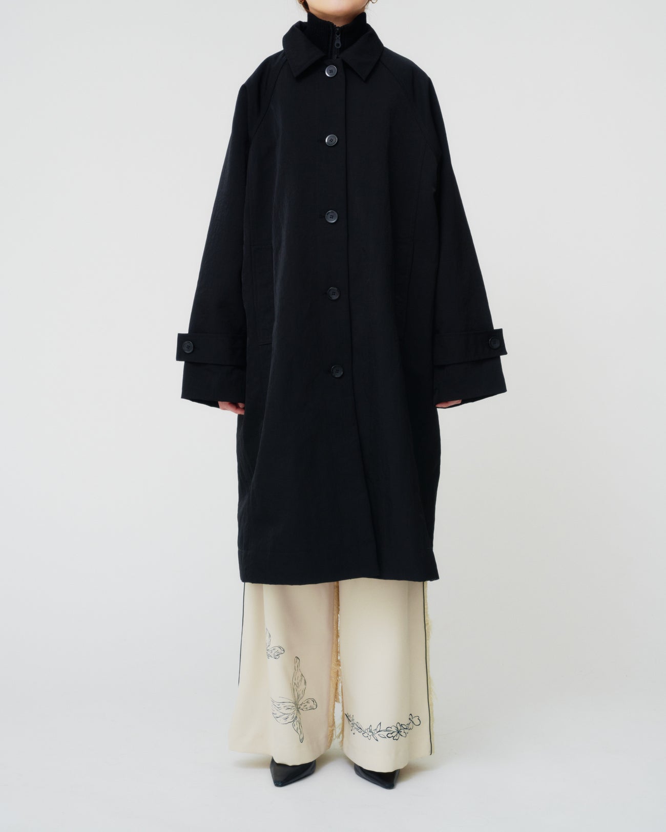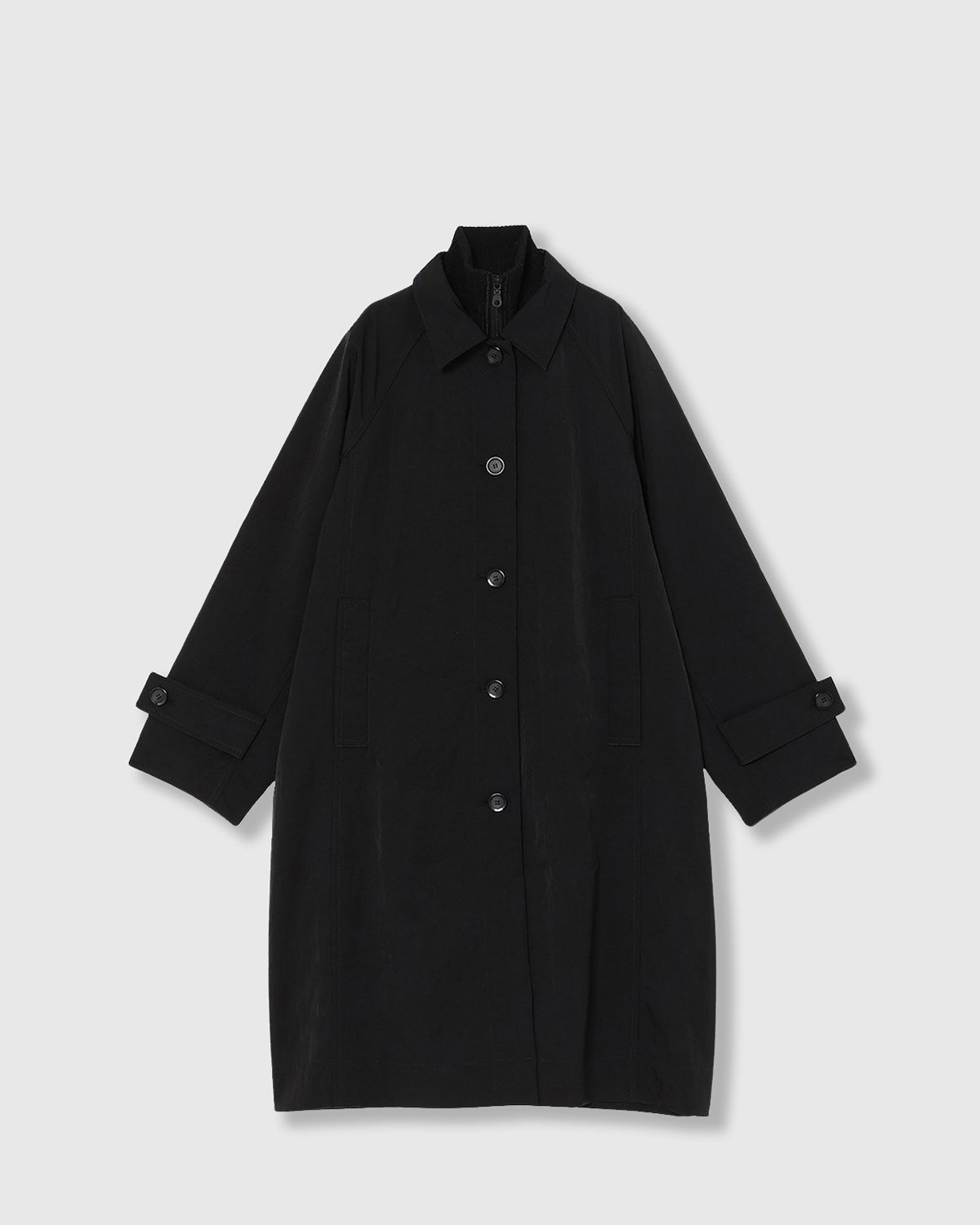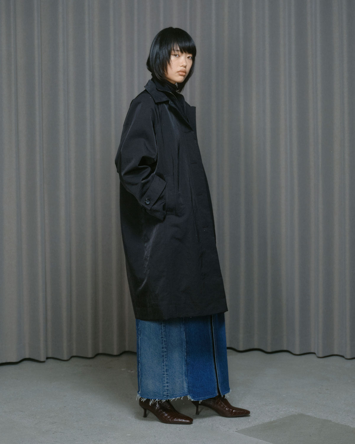 ヴィンテージライクな風合いとレイヤードスタイルを楽しめる、ナイロン素材のロングコート。