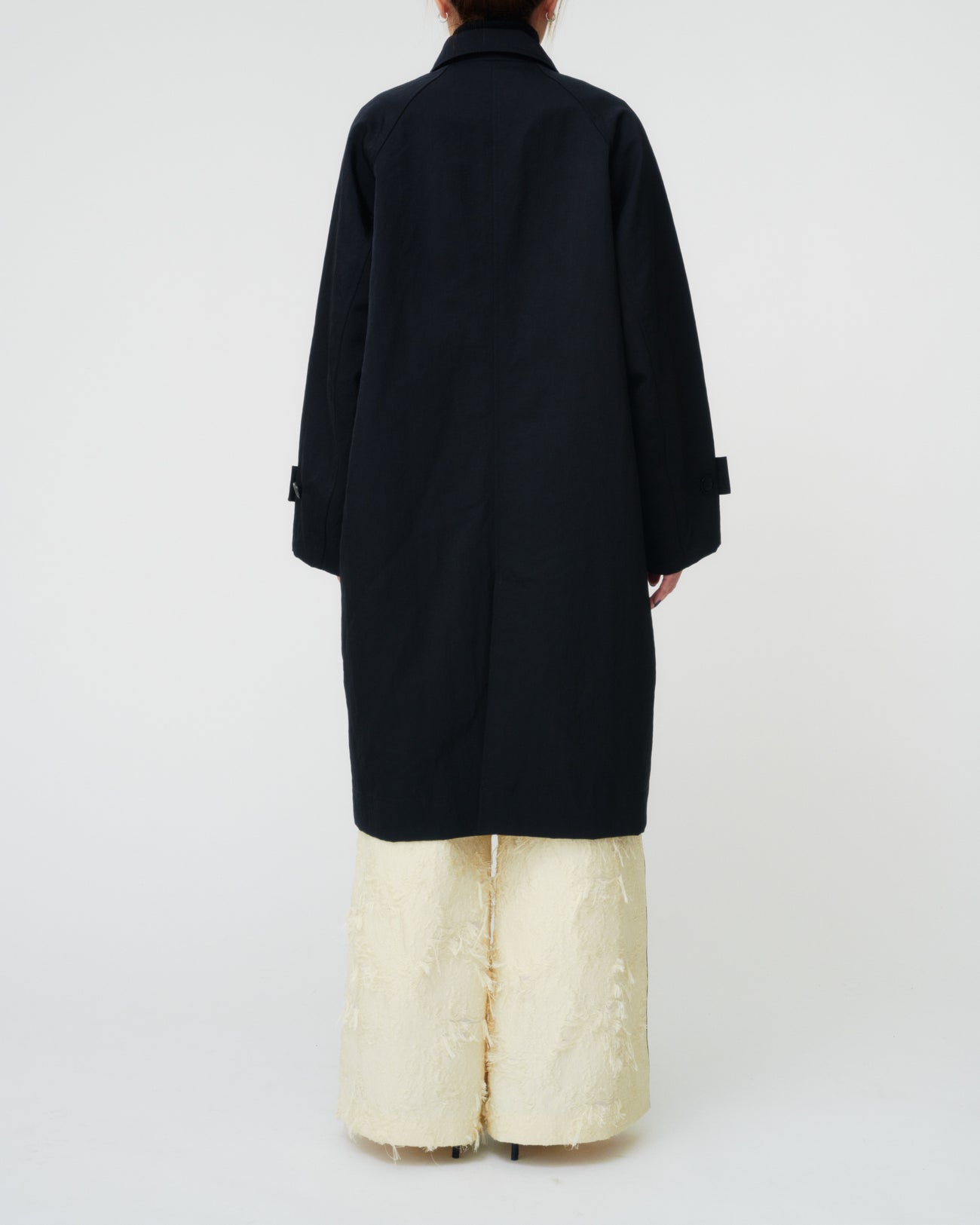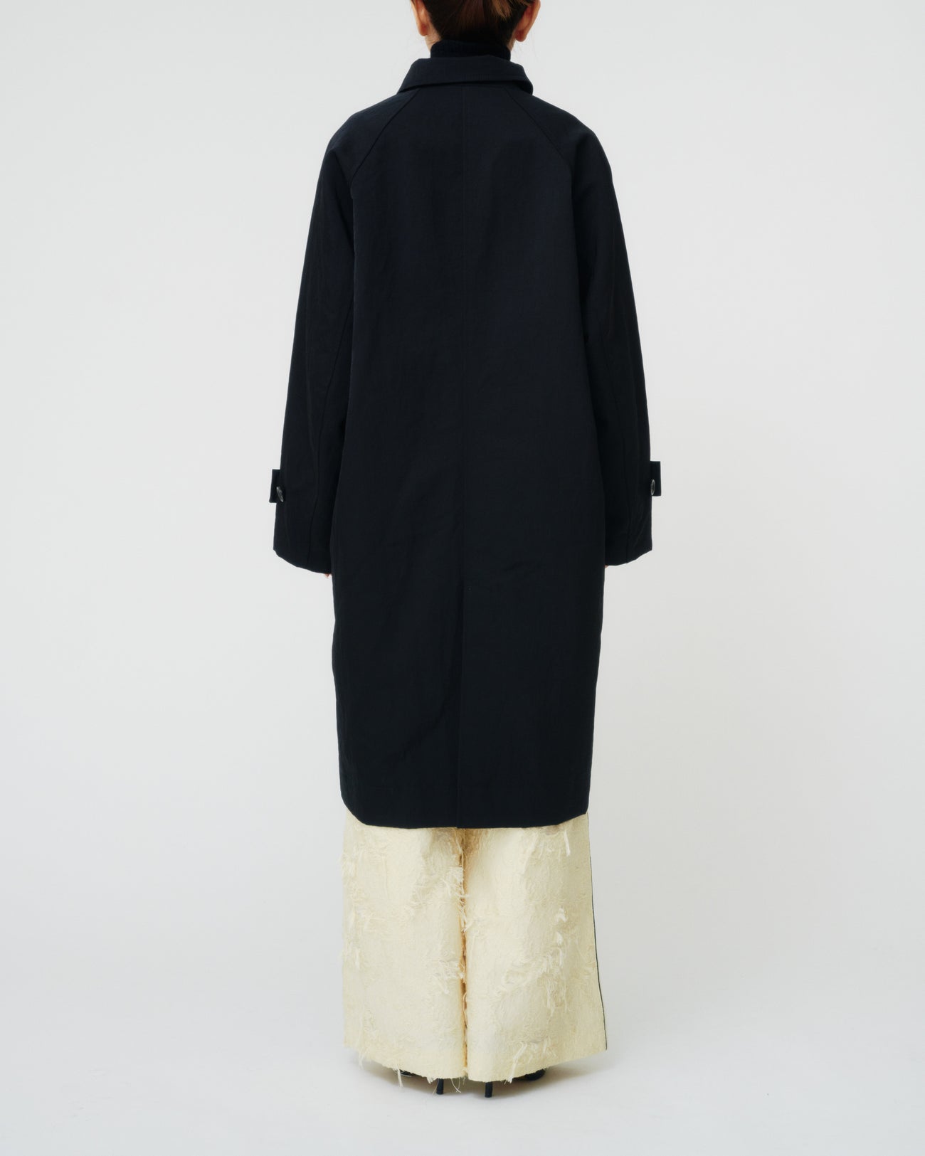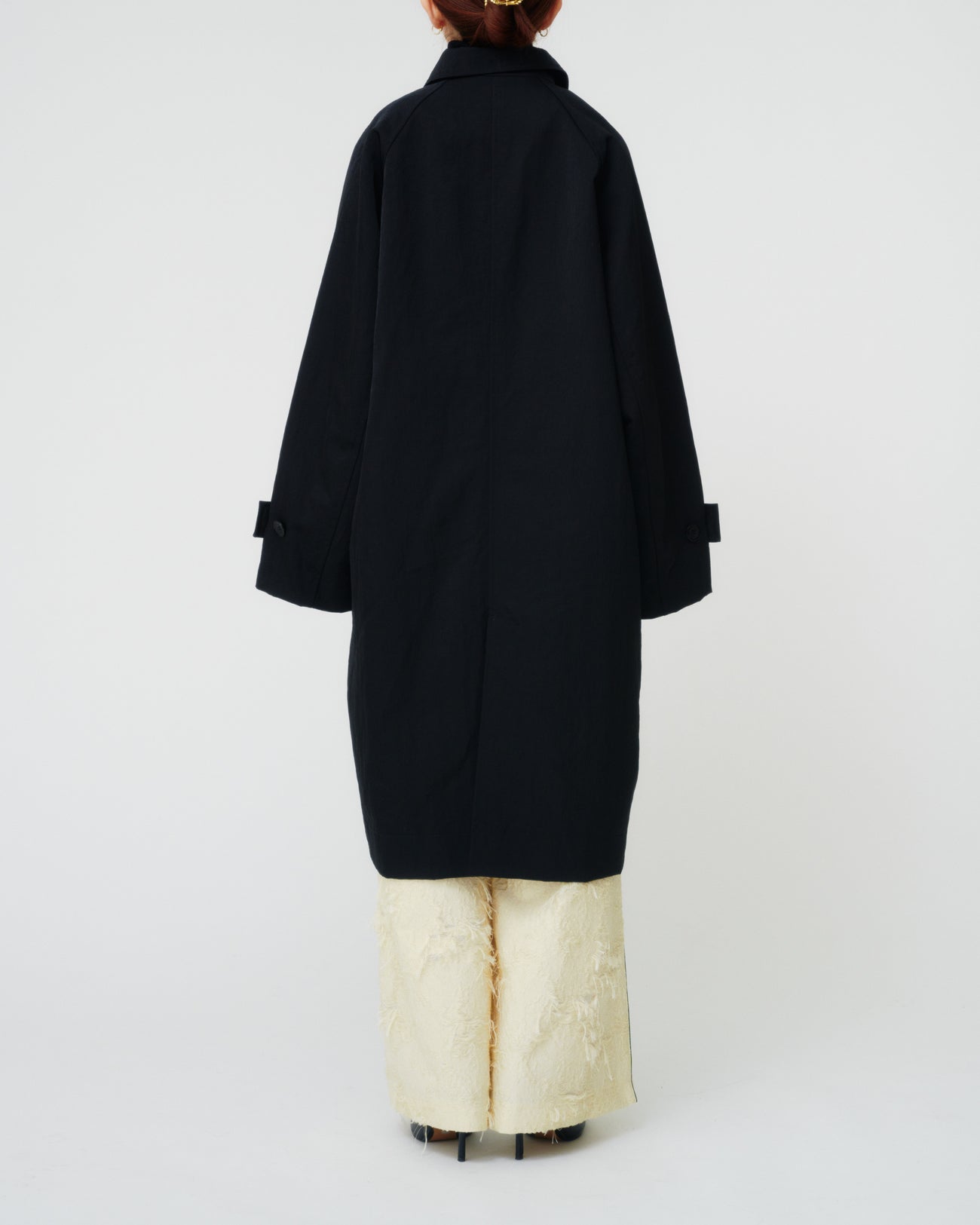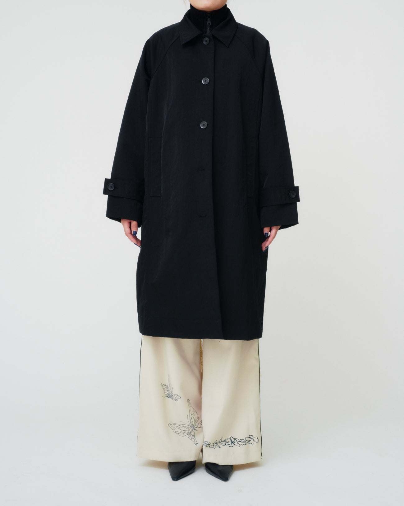 ヴィンテージライクな風合いとレイヤードスタイルを楽しめる、ナイロン素材のロングコート。