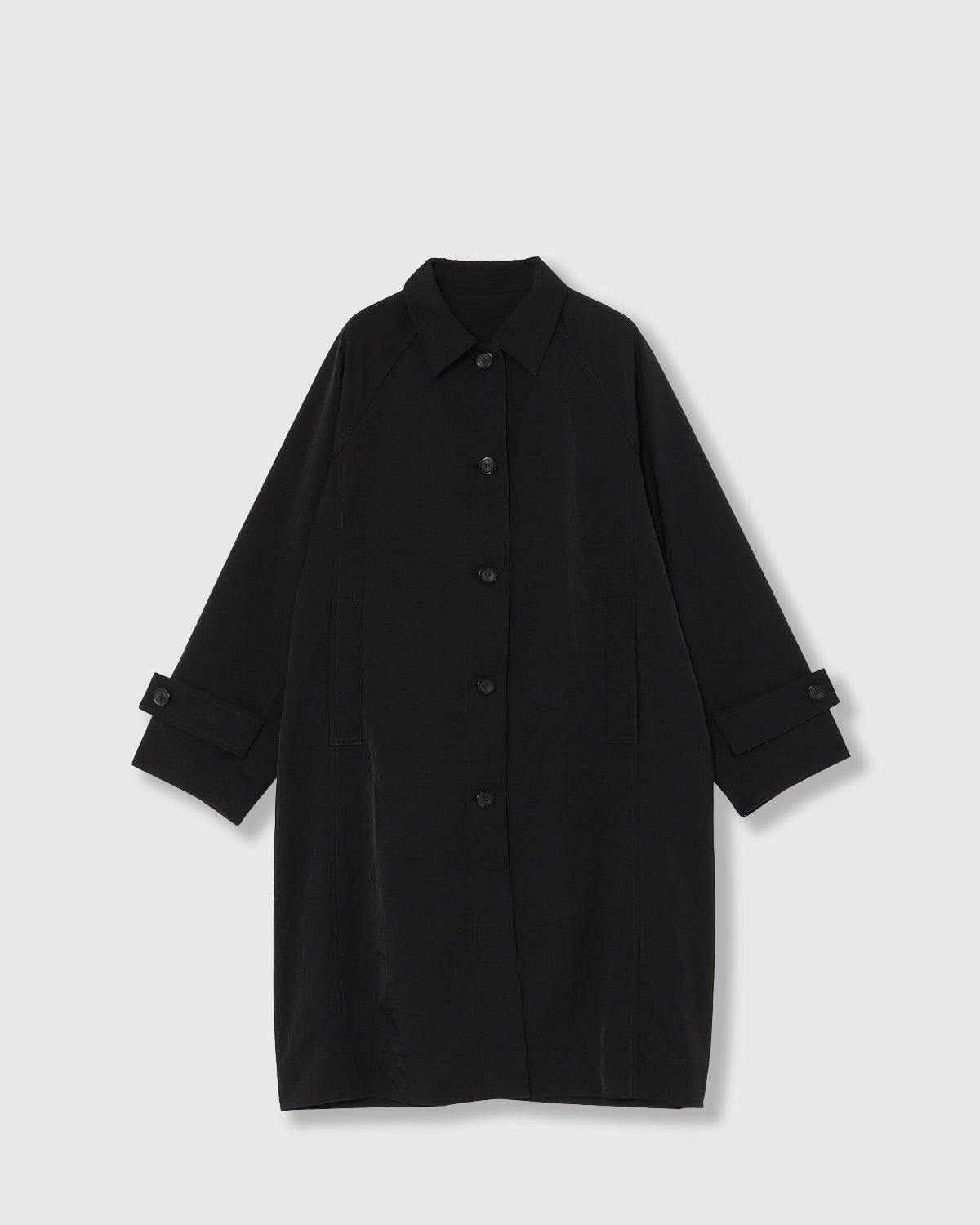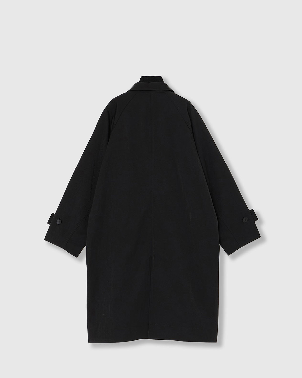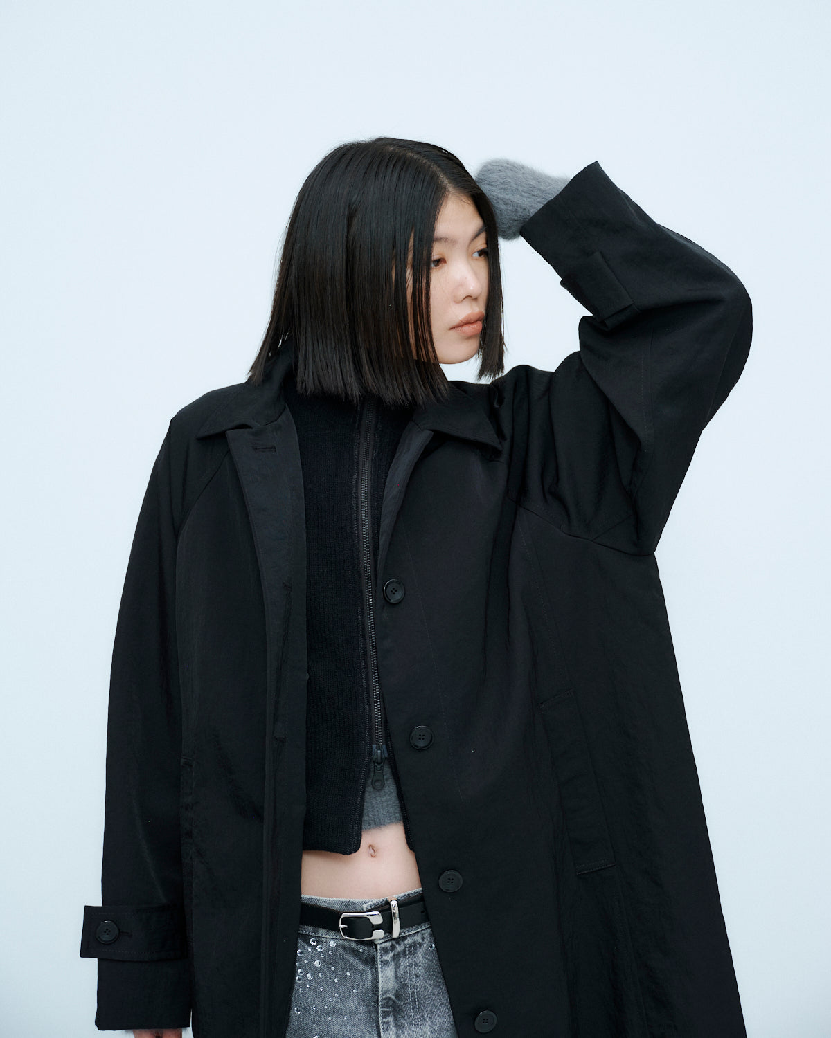 ヴィンテージライクな風合いとレイヤードスタイルを楽しめる、ナイロン素材のロングコート。